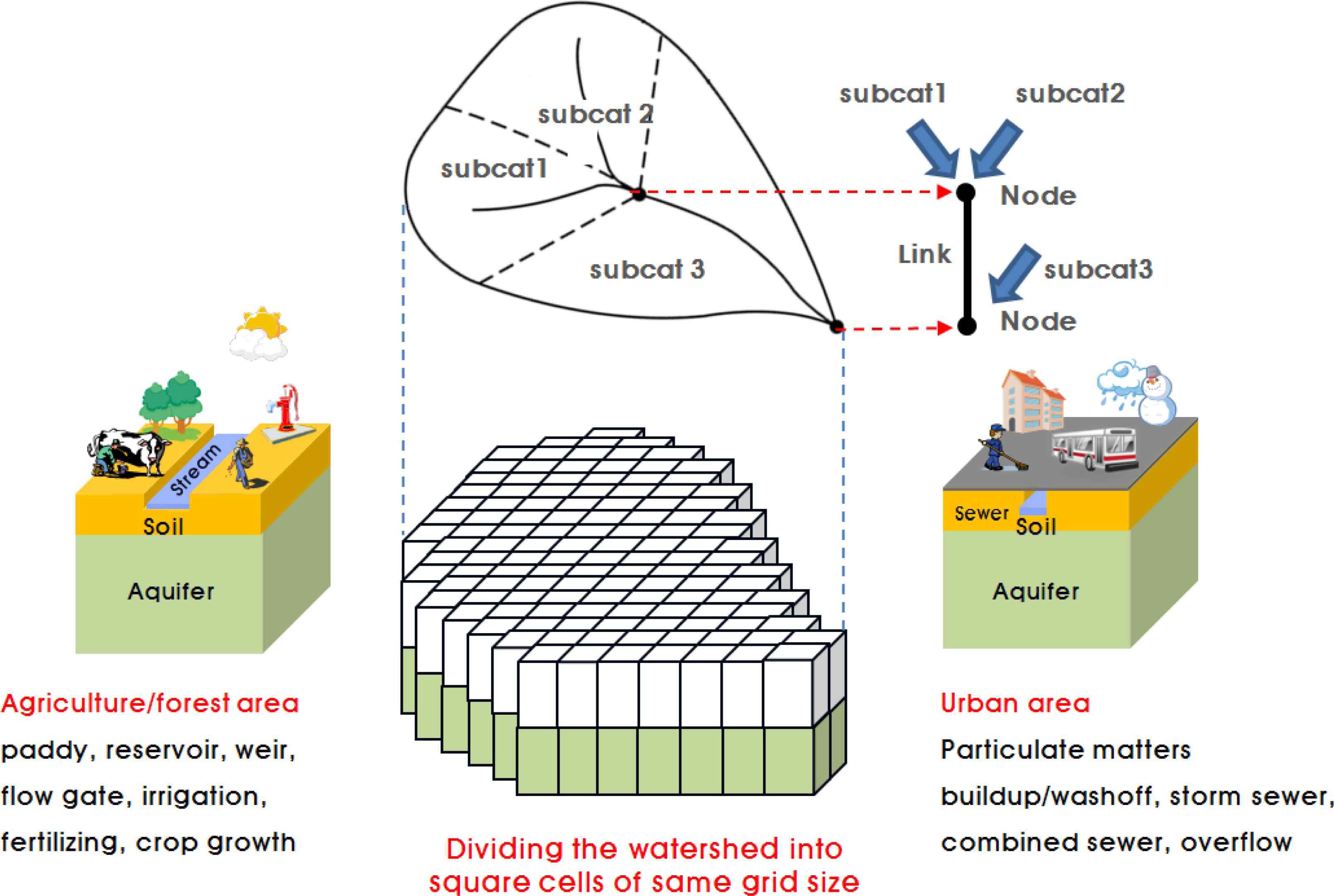 중요한 역할을 하는 특성을 고려하기 위해서는 유역을 정 방형 격자로 분할하며, 논의 수문기작을 모의하고, 농업용 수관개시스템을 구현할 수 있는 유역모델이