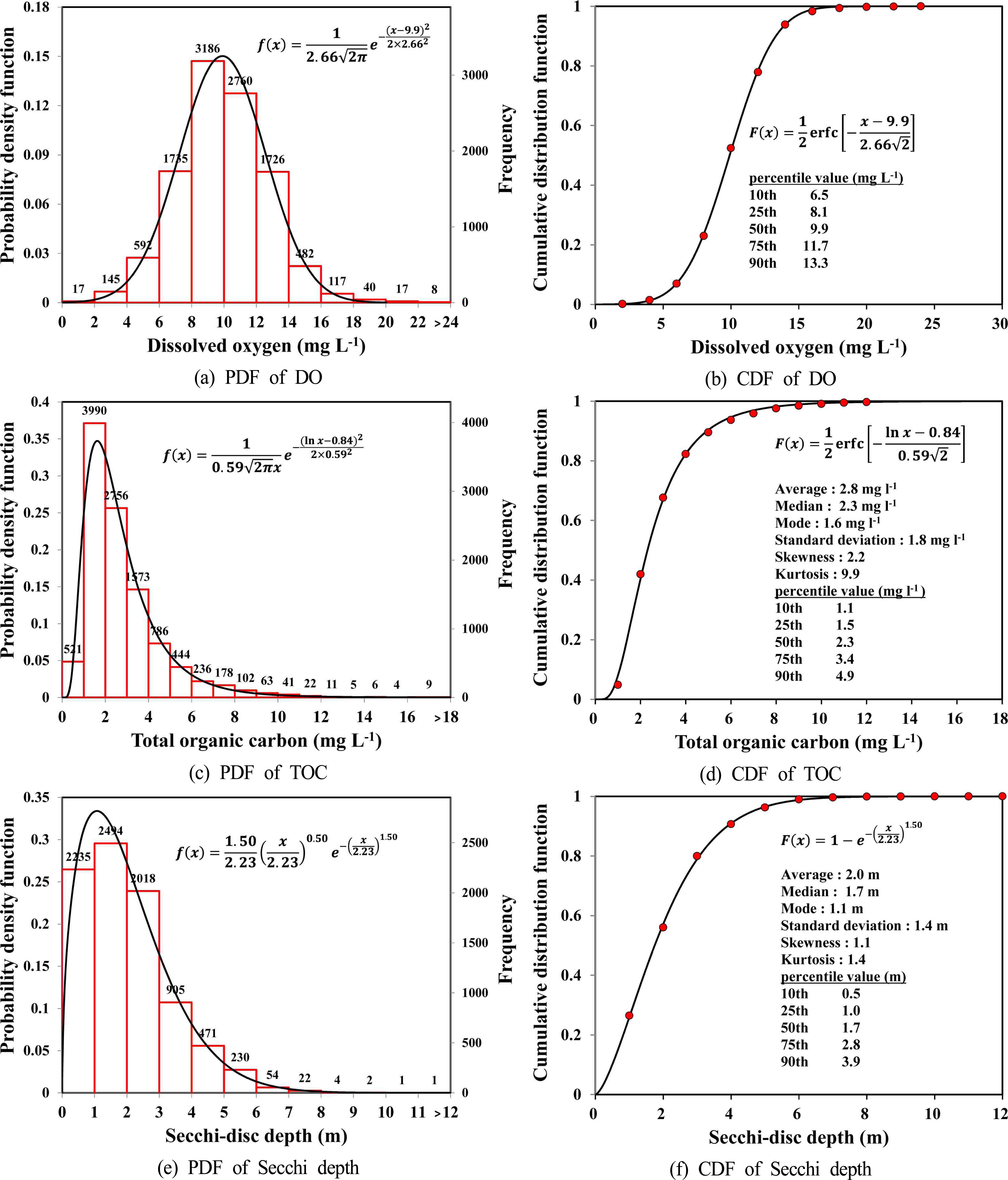 Fig. 1. Probability density distribution and cumulative distribution of dissolved oxygen (a, b), total organic carbon (c, d), and Secchi depth (e, f), based on monthly data in 191 survey sites of 81 lakes, 2013 ~ 2017.