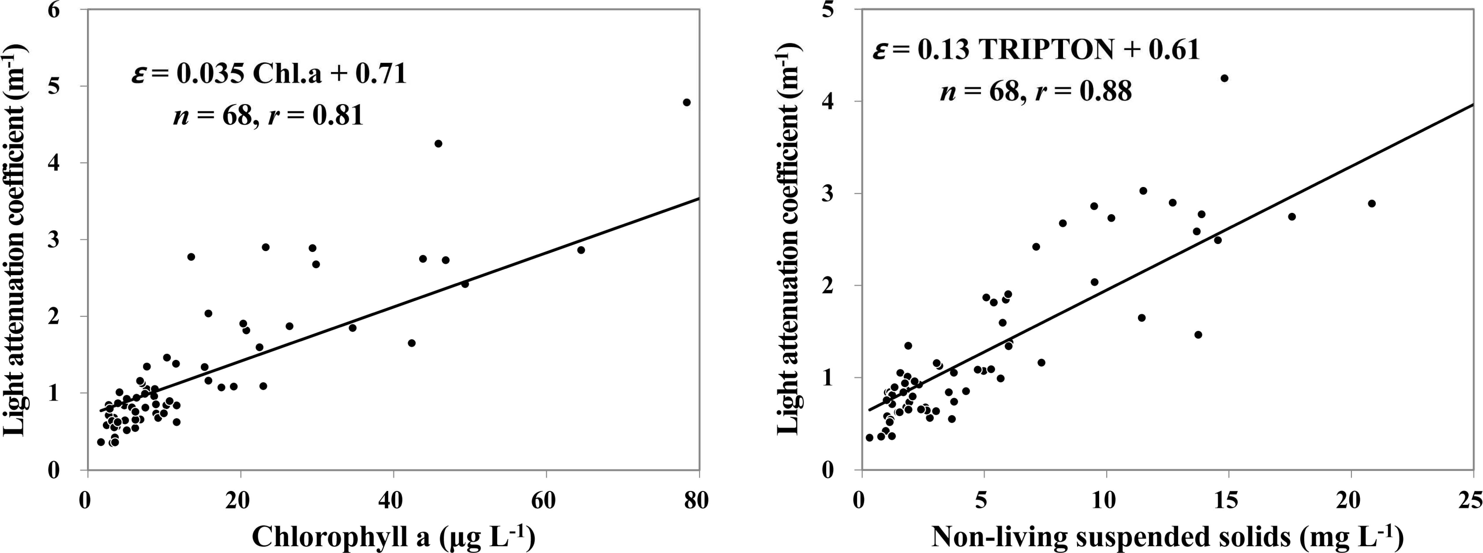 식물플랑크톤의 건조중량을 감하지 않고 TSS를 반영하여 도출된 다중회귀식은 식 (5)와 같았는데, 이는 식 (3)으로부 터 환산하여도 같은 결과를 얻는다. 식 (5)를 적용하는 경 우 식물플랑크톤의 비소광계수가 0.0035 m2 (mg Chl.α)-1로 낮아지는데 이는 식물플랑크톤에 의한 빛 산란효과가 TSS 에 포함되어 감해지기 때문이다. 따라서 식물플랑크톤의 비소 광계수를 도출하기 위해 부유물질