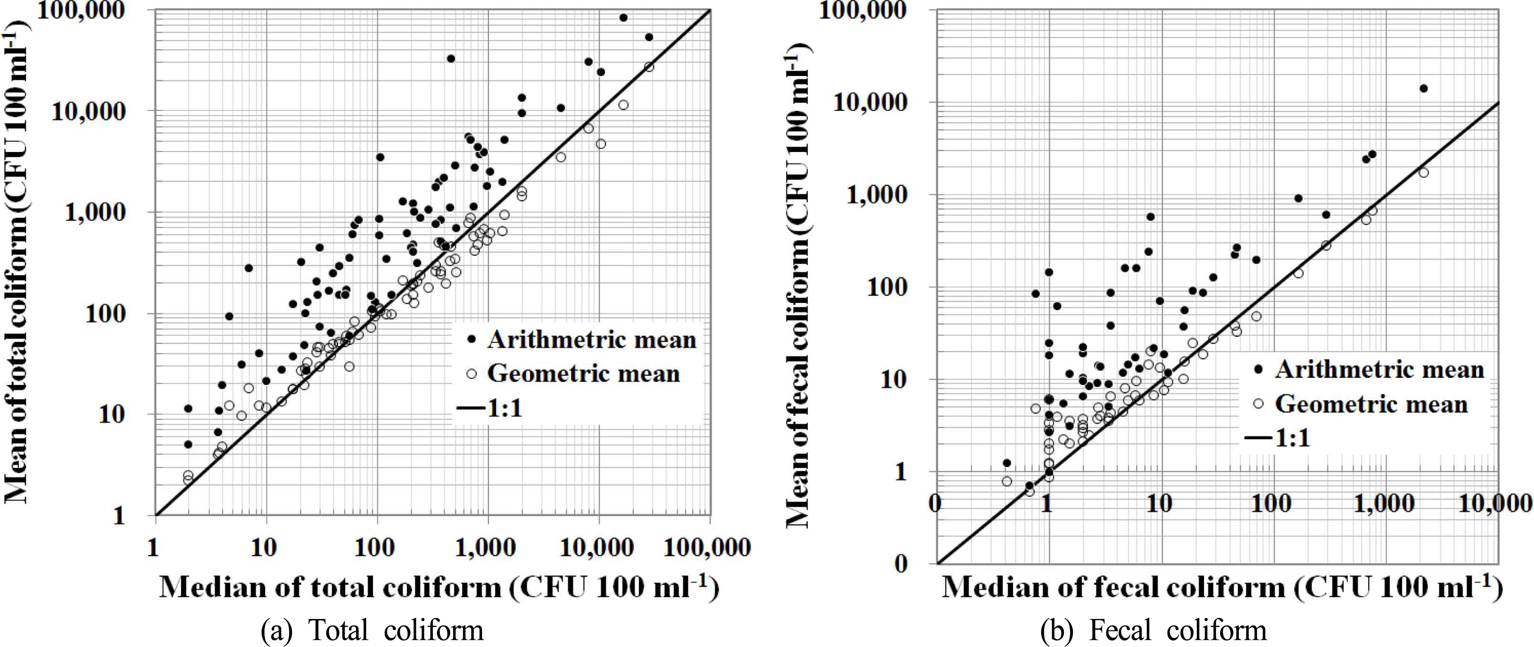 Fig. 2. Relationship between median and mean of total coliform (a), fecal coliform (b).