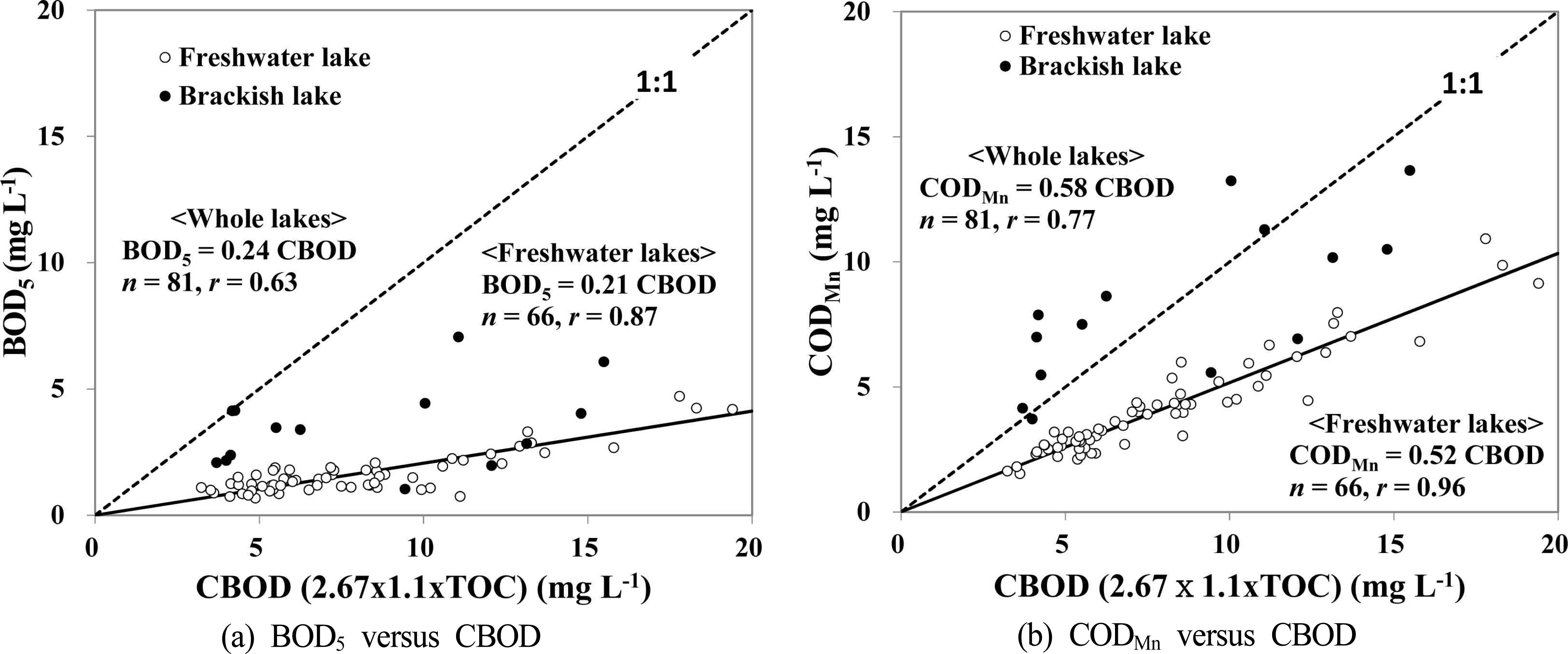 반면 염분농도가 높은 기수호는 담수호에 비해 CBOD에 대한 CODMn과 BOD5의 비가 월등히 컸으며 상당수의 호 소에서는 CODMn 농도가 CBOD 농도보다 더 높게 나타났 다. 무기물 산화의 영향을 고려치 않는다면 이러한 차이는 COD 및 BOD의 측정 결과가 과대평가 되었거나,