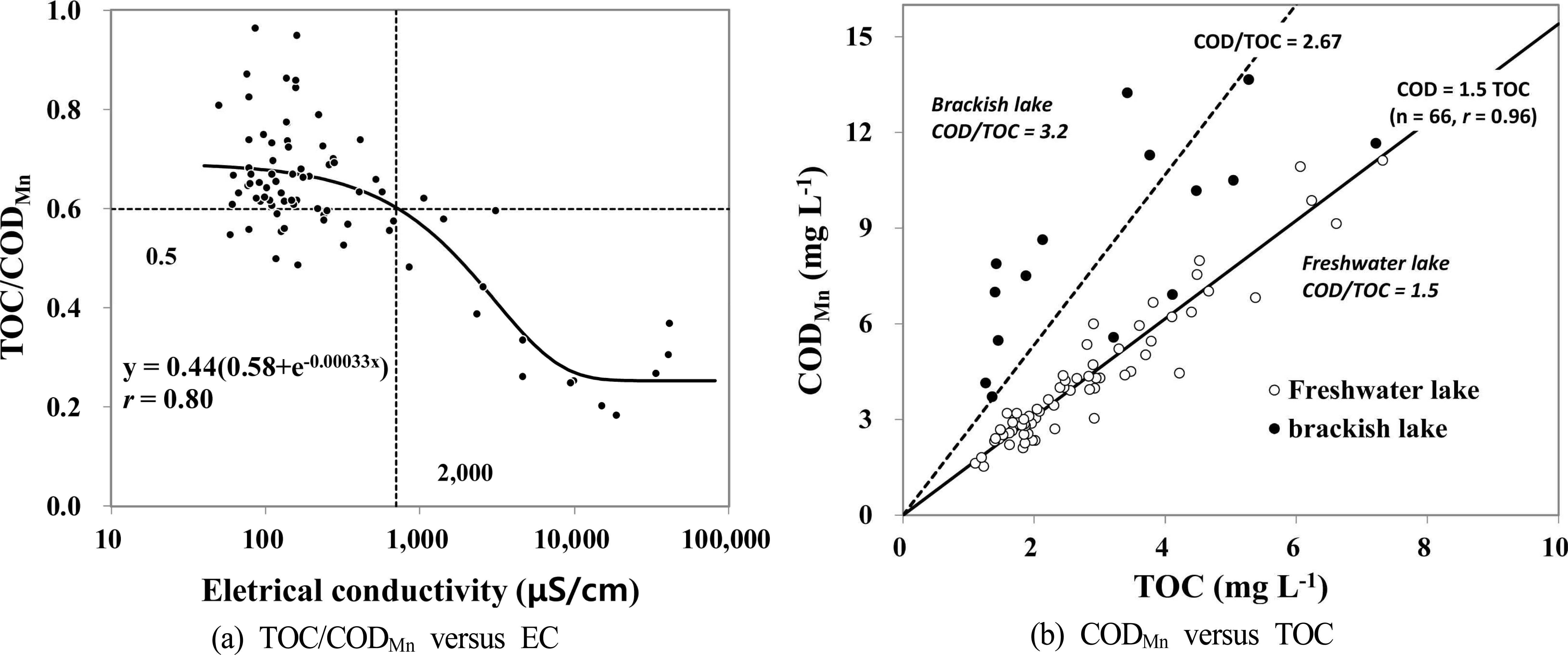 Fig. 4. Relationship between electrical conductivity and the ratio of TOC to CODMn(a), and relationship between TOC and CODMnin 81 lakes (whole layer) of Korea.