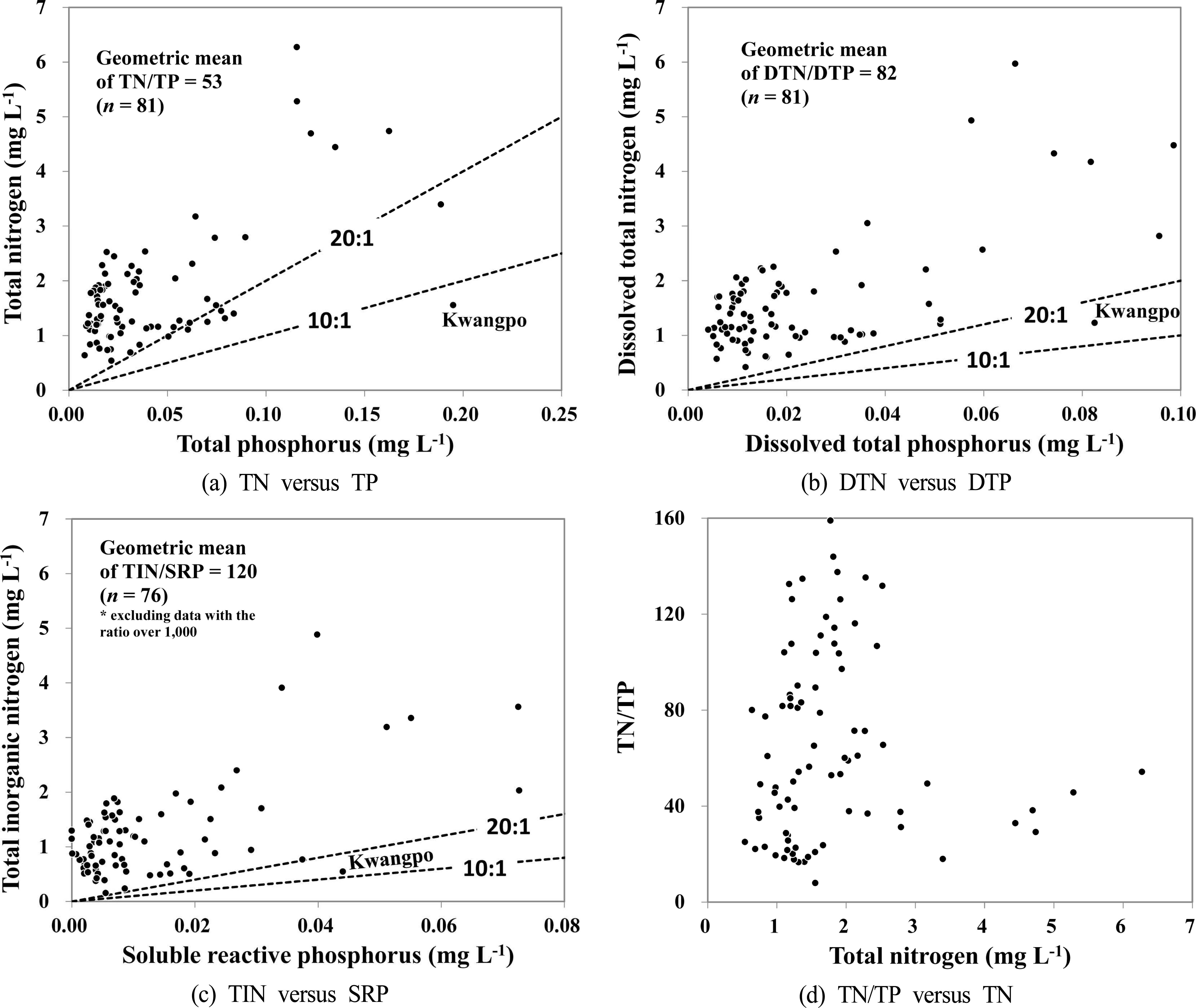 81개 호소에서 총질소와 총인의 농도비는 8 ~ 159(기하평 균 53) (Fig. 5a), 용존 총인에 대한 용존 총질소의 비는 15 ~ 285(기하평균 82) (Fig 5b), 총무기질소에 대한 반응성인 의 비는 12 ~ 604(기하평균 120) (Fig. 5c)로서 조류가 직접 이용하는 형태일수록 그 물질비가 커졌다. 이는 조류성장의 제한요인으로서 인의 중요성이 상대적으로 크다는 것을 의 미한다. 총질소와