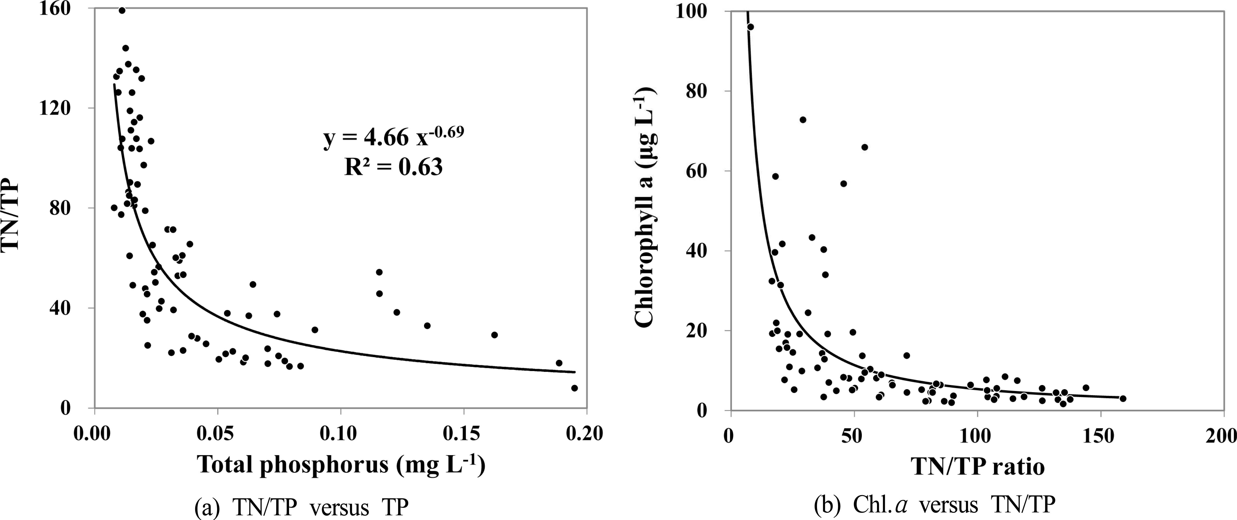 총질소/총인의 비는 질소 농도와는 유의미한 관계가 없고 (Fig. 5d), 인 농도에 의해 좌우되는데(Fig. 6a) 이는 Lee et al. (2007)이 국내의 농업용 저수지에서도 확인한 것이다. 총질소/총인의 물질비가 낮을 때 Chl.α 농도가 높게 나타나 는데(Fig. 6b), 이러한 관계는 식물플랑크톤이 낮은 N/P비 를 선호한다기보다는 인 농도가 높아서 나타나는 결과로 판단된다.