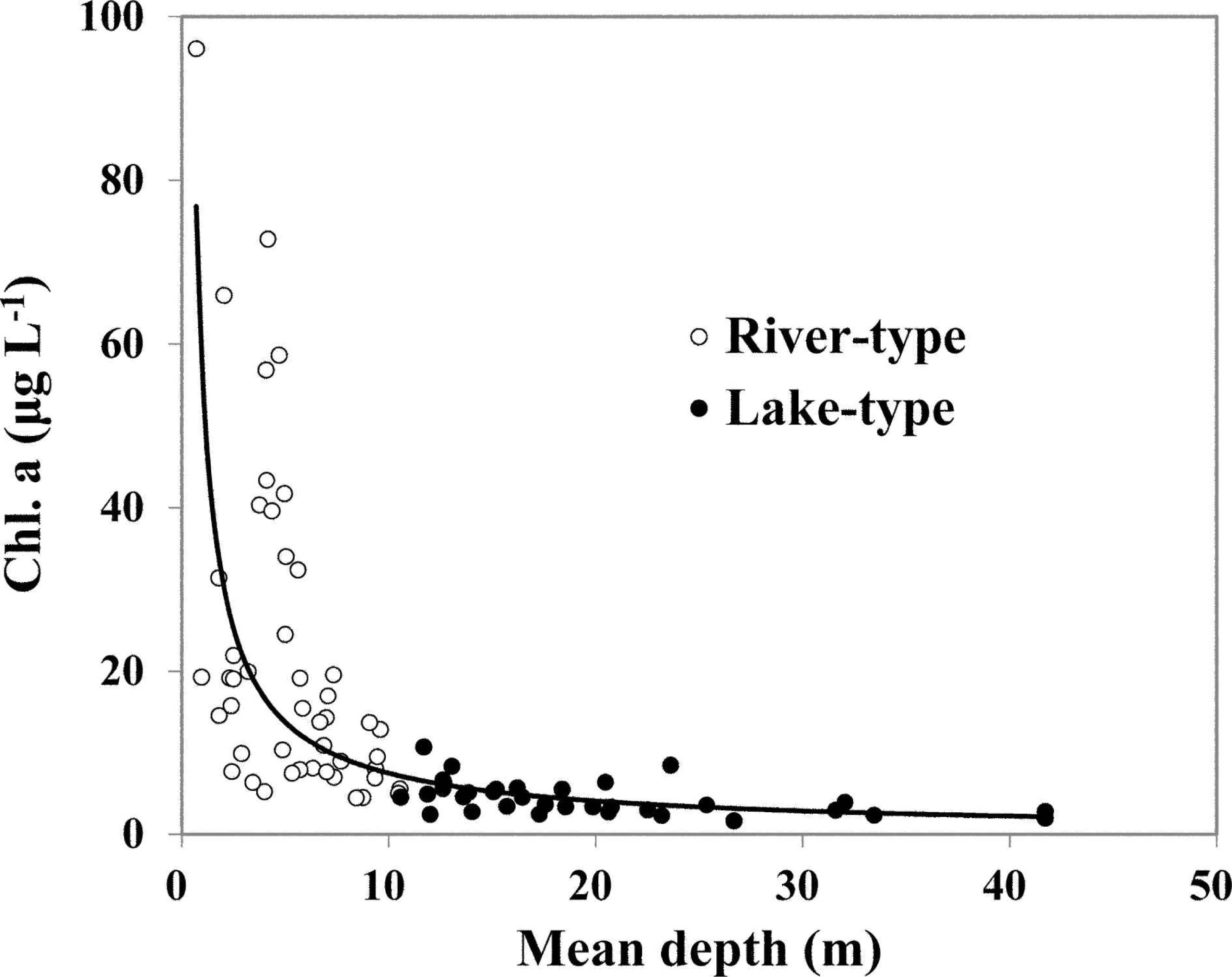 Chl.α 농도와 호소의 평균수심(만수위 기준)은 멱함수의 반비례 관계를 보였는데 평균수심이 10 m를 넘는 호소의 Chl.α 농도는 전반적으로 낮은 수준이었다(Fig. 8). 이는 수 심이 깊은 호소일수록 대체로 오염원이 적은 상류에 위치 하고 있다는 점에서 그 이유를 찾을 수 있으나 그 외에도 수심이 깊어지면 호