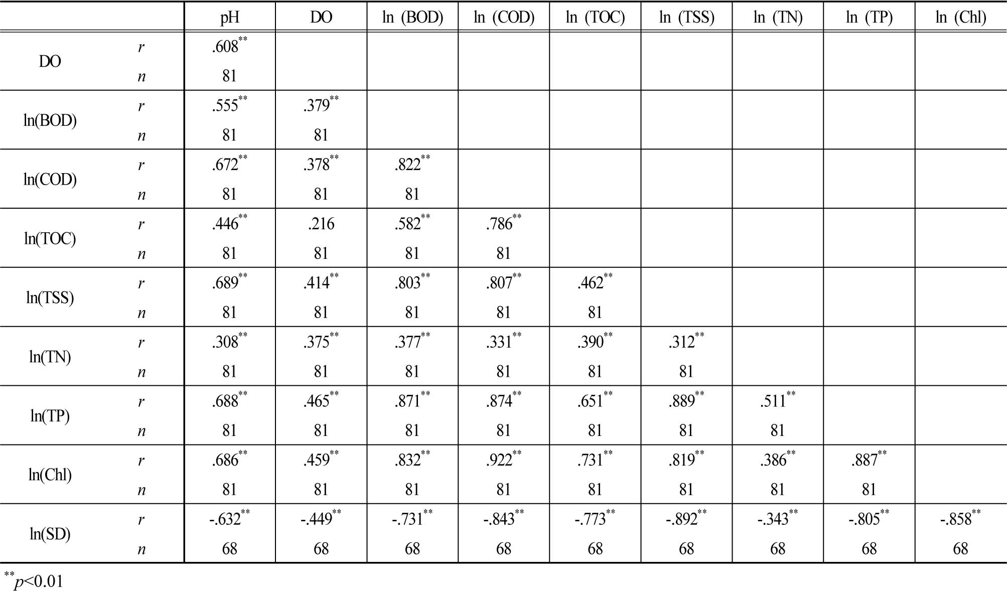 Table 4. Pearson correlation coefficient (r), sample size (n), and significance level among water quality parameters, based on each average value of 81 lakes (whole layer), 2013 ~ 2017