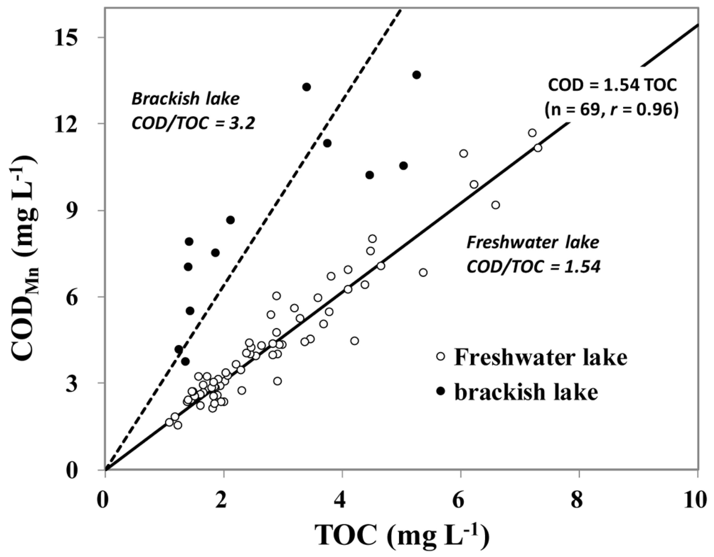 Kong (2019)은 유엔 식량농업기구의 기준(FAO, 1992)을 근 거로 전기전도도(electrical conductivity, EC)가 700 μS cm-1을 넘는 호수를 기수호로 분류한 바 있다. 본 연구에서는 Kong (2019)의 기준에 따라 기수호를 분류하였고 그 중 COD/TOC 비가 2이상인 호수는 Fig. 1의 회귀식에서 제외하였다. 금호호, 남양호, 영암호는 평균 EC가 1,000 ~ 3,000 μS cm-1 범위로서 FAO (1992)의 기준으로 약염(slightly saline: 0.7 ~ 2 dS cm-1 = 700 ~ 2,000 μS cm-1) 또는 약염에 가까운 중염(moderately saline: 2,000 ~ 10,000 μS cm-1) 수준의 기수호였는데, 이들 호 수에 대한 TOC는 모두 고온산화방식으로 측정되고 있었고 COD/TOC 비가 2미만이었으므로 해당 호수의 자료는 회귀식 에 포함하였다.