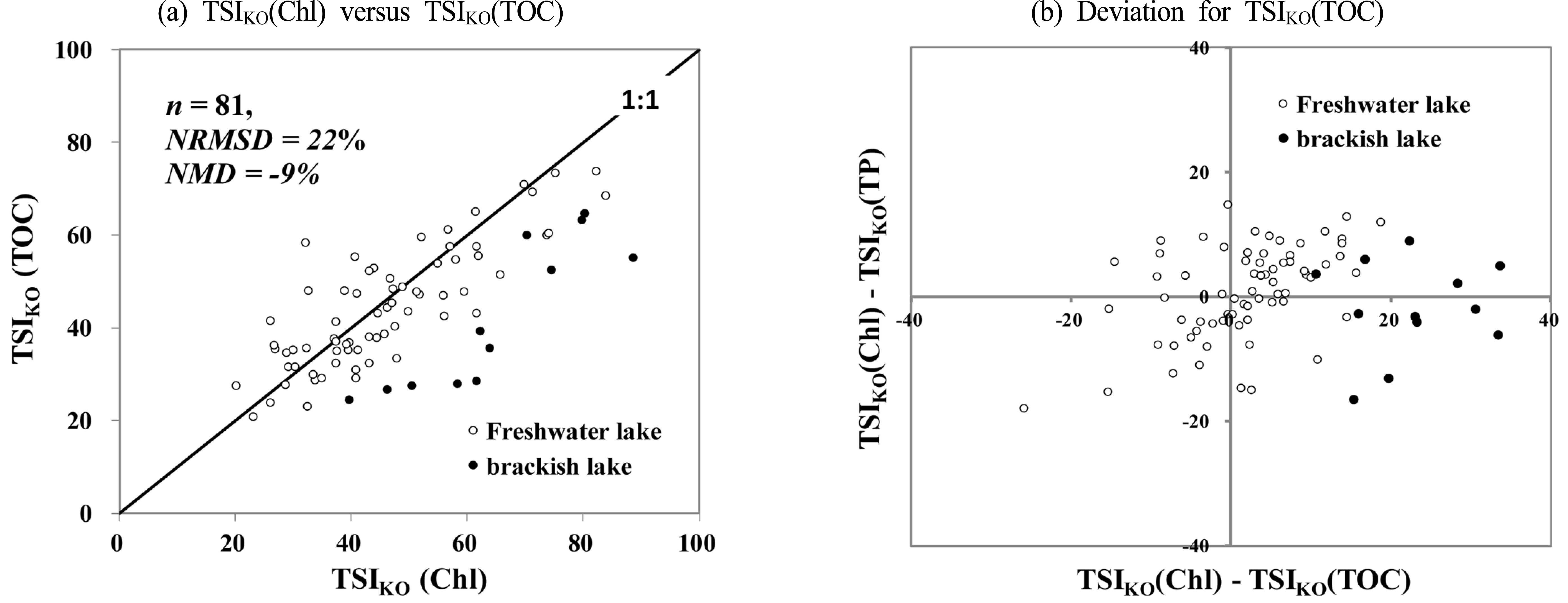 환경부 호소수질측정망 81개 호소에서 변수 간 차이의 정 도를 나타내는 NRMSD와 차이의 방향성을 나타내는 NMD 로 볼 때 TSIKO(Chl)에 비해 TSIKO(TOC)는 전반적으로 낮았 고 특히 기수호에서 그 경향이 뚜렷하였으며(Fig. 2a), 4분면 편차분석에서도 편포하는 정도가 컸다(Fig. 2b).