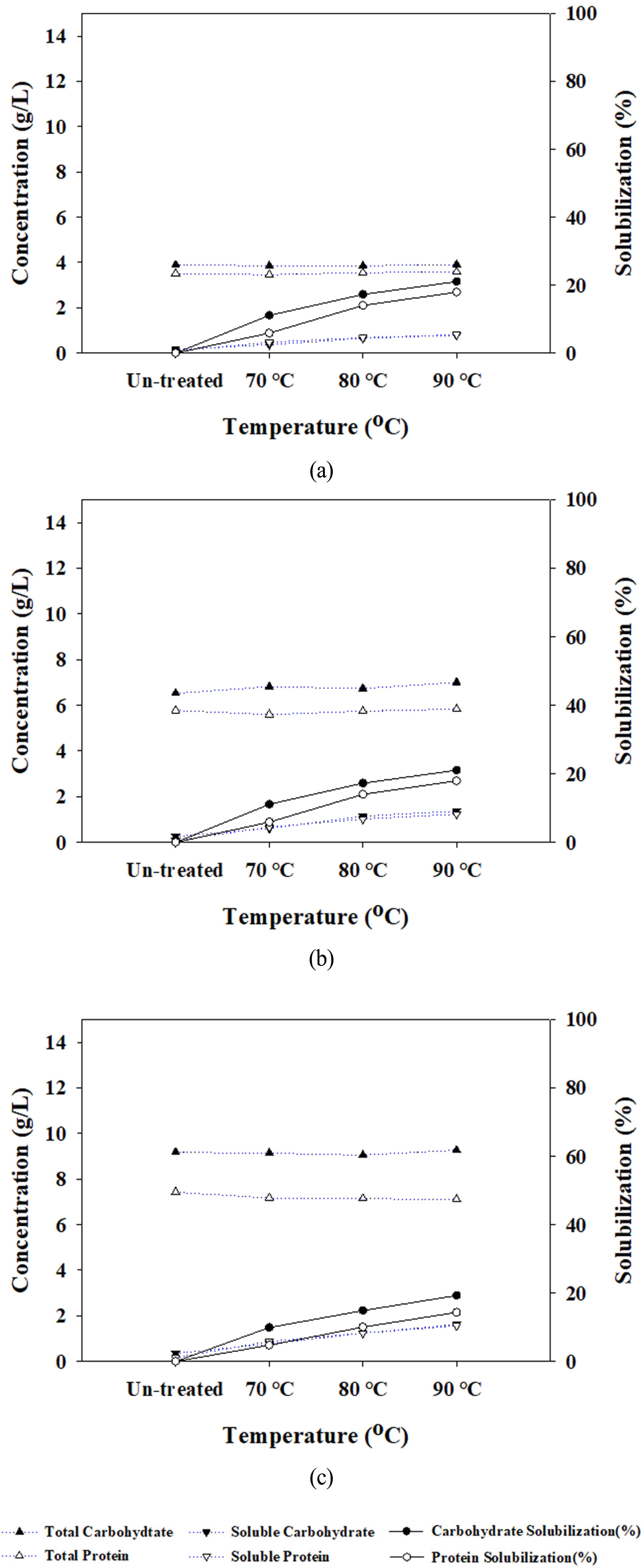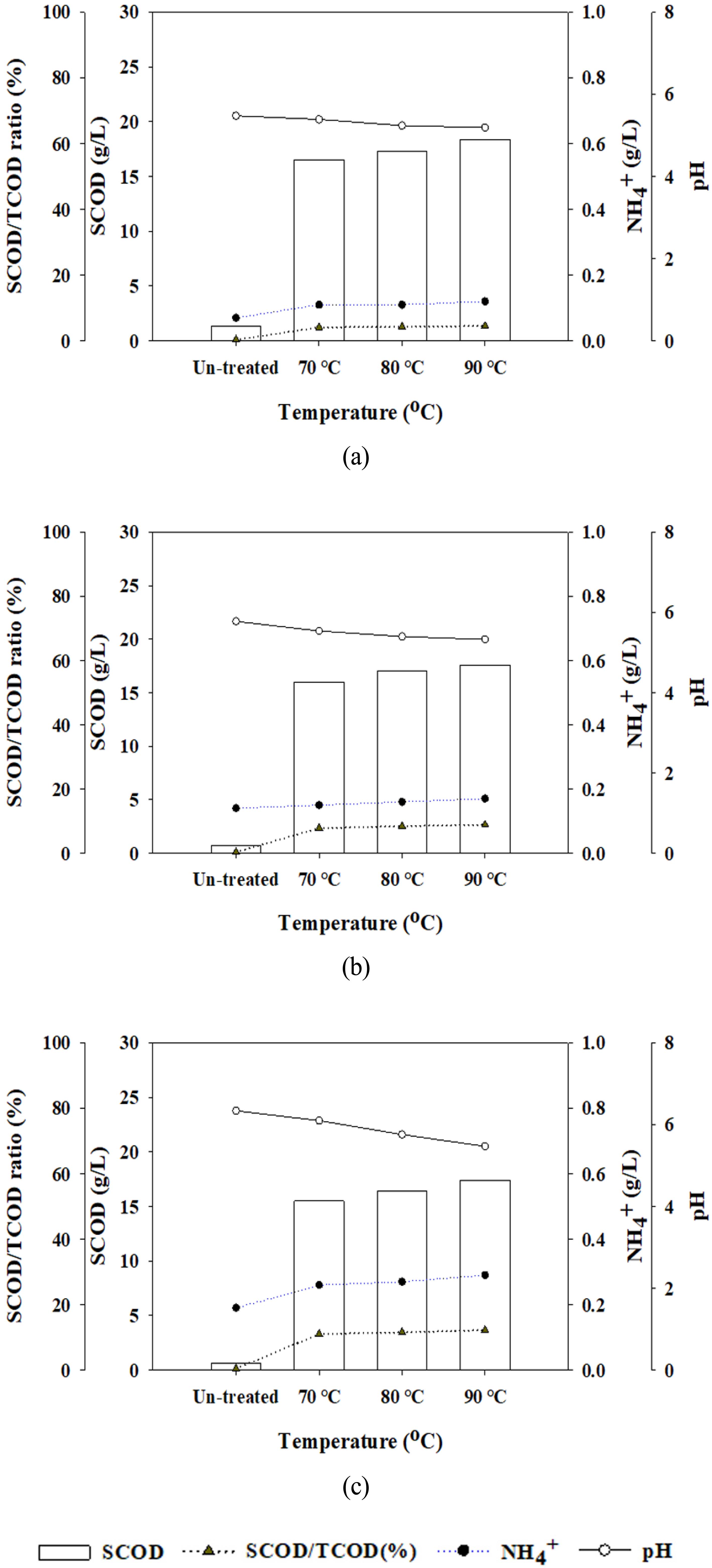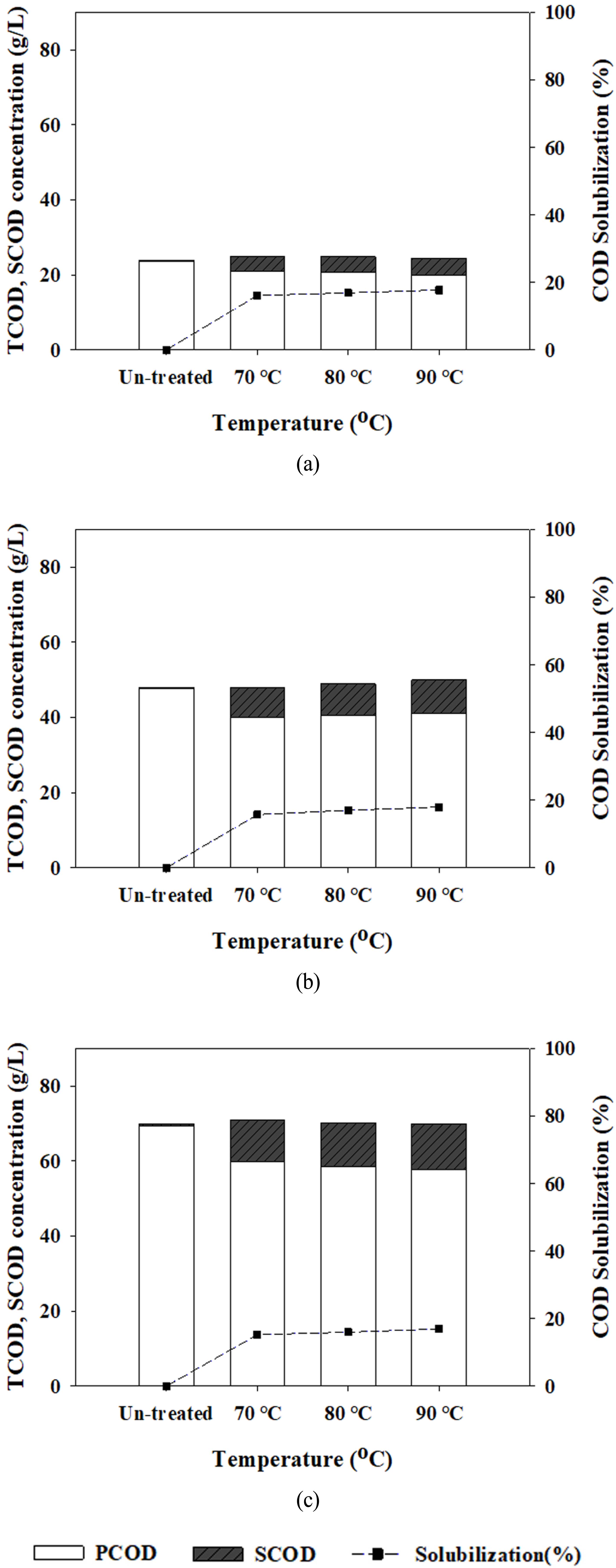 따라서 본 연구에서는 농도별 잉여슬러지를 대상으로 70, 80, 90 °C 온도와, 최대 120분 조건에서의 저온 열적가용화 를 적용하여 기질의 이화학적