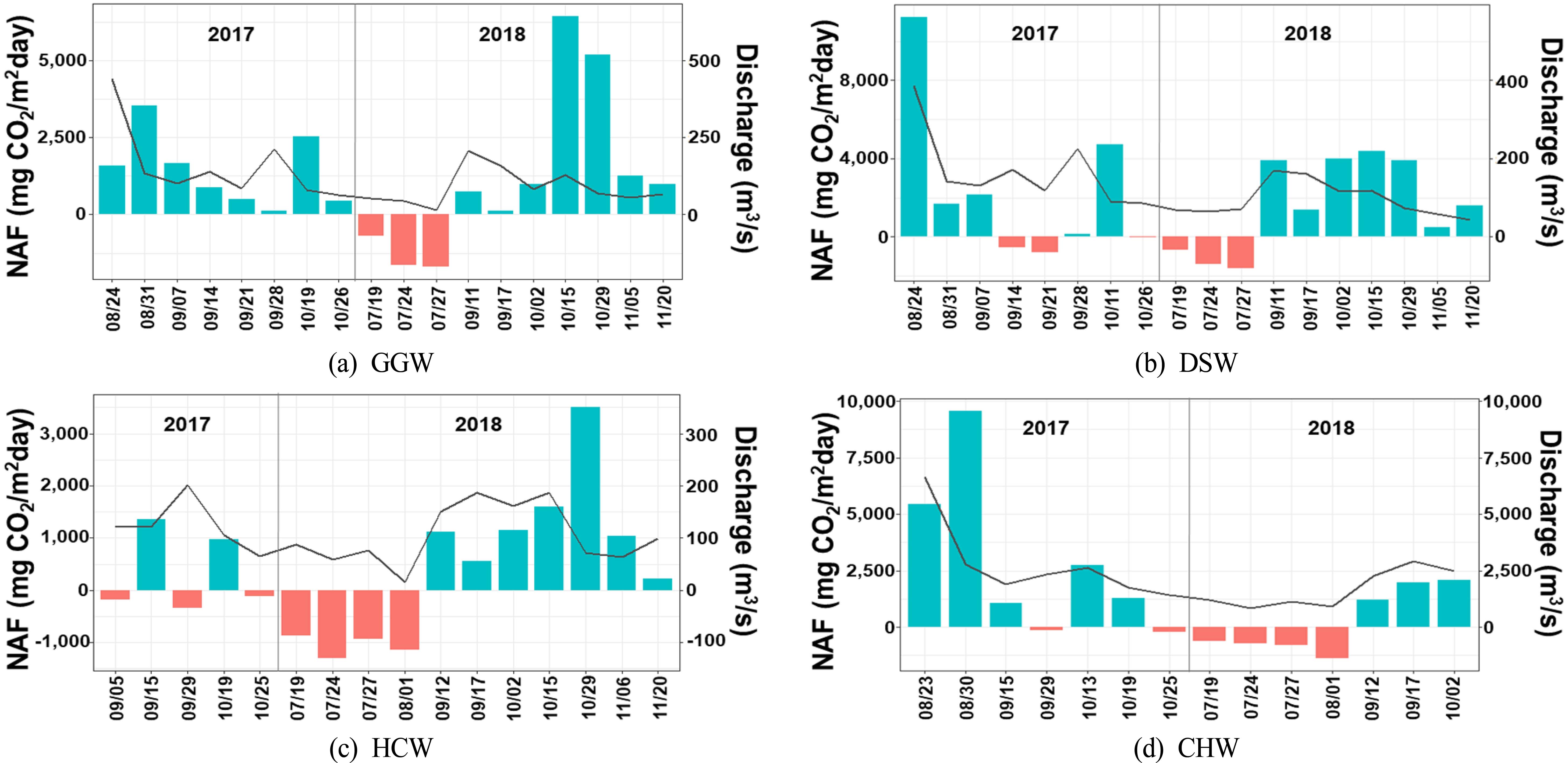 ๊ตญ๋‚ด์˜ ๊ฒฝ์šฐ 4๋Œ€๊ฐ•์‚ฌ์—…์œผ๋กœ ํ•˜์ฒœ์—๋Š” ๋ณด๊ฐ€ ๋‹ค์ˆ˜ ๊ฑด์„ค๋˜์—ˆ์œผ ๋ฉฐ, ๋ณด ๊ตฌ๊ฐ„์˜ ์ˆ˜์‹ฌ๊ณผ ์ˆ˜๋ฉด์ ์ด ์ฆ๊ฐ€ํ•˜๊ณ  ์œ ์ˆ˜ํ™˜๊ฒฝ์ด ์ •์ˆ˜ํ™˜๊ฒฝ ์œผ๋กœ ๋ณ€ํ™”๋˜์—ˆ๋‹ค. ์ด๋Ÿฌํ•œ ๋ณ€ํ™”๋Š” ์ˆ˜์ฒด ๋‚ด ๋ฌผ์˜ ์ฒด๋ฅ˜์‹œ๊ฐ„ ์ฆ๊ฐ€์™€ ์œ ๊ธฐ๋ฌผ ์ถ•์  ๋ฐ ๋ถ„ํ•ด์˜ ์ฆ๊ฐ€๋ฅผ ๊ฐ€์ ธ์˜ฌ ์ˆ˜ ์žˆ์œผ๋ฉฐ, ๋”ฐ๋ผ์„œ ์ˆ˜์ฒด ๋‚ด CO2 ๋†๋„์˜ ๊ณผํฌํ™” ์ƒํƒœ๋ฅผ ์ดˆ๋ž˜ํ•  ์ˆ˜ ์žˆ๋‹ค. ํ•œํŽธ, 4๋Œ€๊ฐ•์‚ฌ์—… ์œผ๋กœ ๋ฌธ์ œ๊ฐ€ ๋˜๊ณ  ์žˆ๋Š” ์—ฌ๋ฆ„์ฒ  ๋‚จ์กฐ๋ฅ˜์˜ ๊ณผ์ž‰์„ฑ์žฅ์€ ์ˆ˜์ฒด ๋‚ด ์œ ๊ธฐ๋ฌผ์˜ ๋‚ด๋ถ€ ๋ถ€ํ•˜ ์ฆ๊ฐ€์˜ ์›์ธ์ด ๋˜๊ธฐ๋„ ํ•˜์ง€๋งŒ ์ˆ˜์ฒด ๋‚ด pH ์ƒ์Šน๊ณผ CO2 ๊ฐ์†Œ์˜ ์š”์ธ์œผ๋กœ ์ž‘์šฉํ•  ์ˆ˜ ์žˆ๋‹ค. ์ด๋Ÿฌํ•œ ์š”์ธ๋“ค์€ ํ•˜์ฒœ ์ˆ˜์ƒํƒœ๊ณ„์˜ ํƒ„์†Œ ์ˆœํ™˜์— ์ง€์†์ ์œผ๋กœ ์˜ํ–ฅ์„ ๋ฏธ์น˜๋ฉฐ, ๋Œ€๊ธฐ- ์ˆ˜๋ฉด ๊ฒฝ๊ณ„๋ฉด์—์„œ์˜ CO2 NAF์˜ ๋™์  ๋ณ€ํ™”๋ฅผ ์ดˆ๋ž˜ํ•œ๋‹ค.