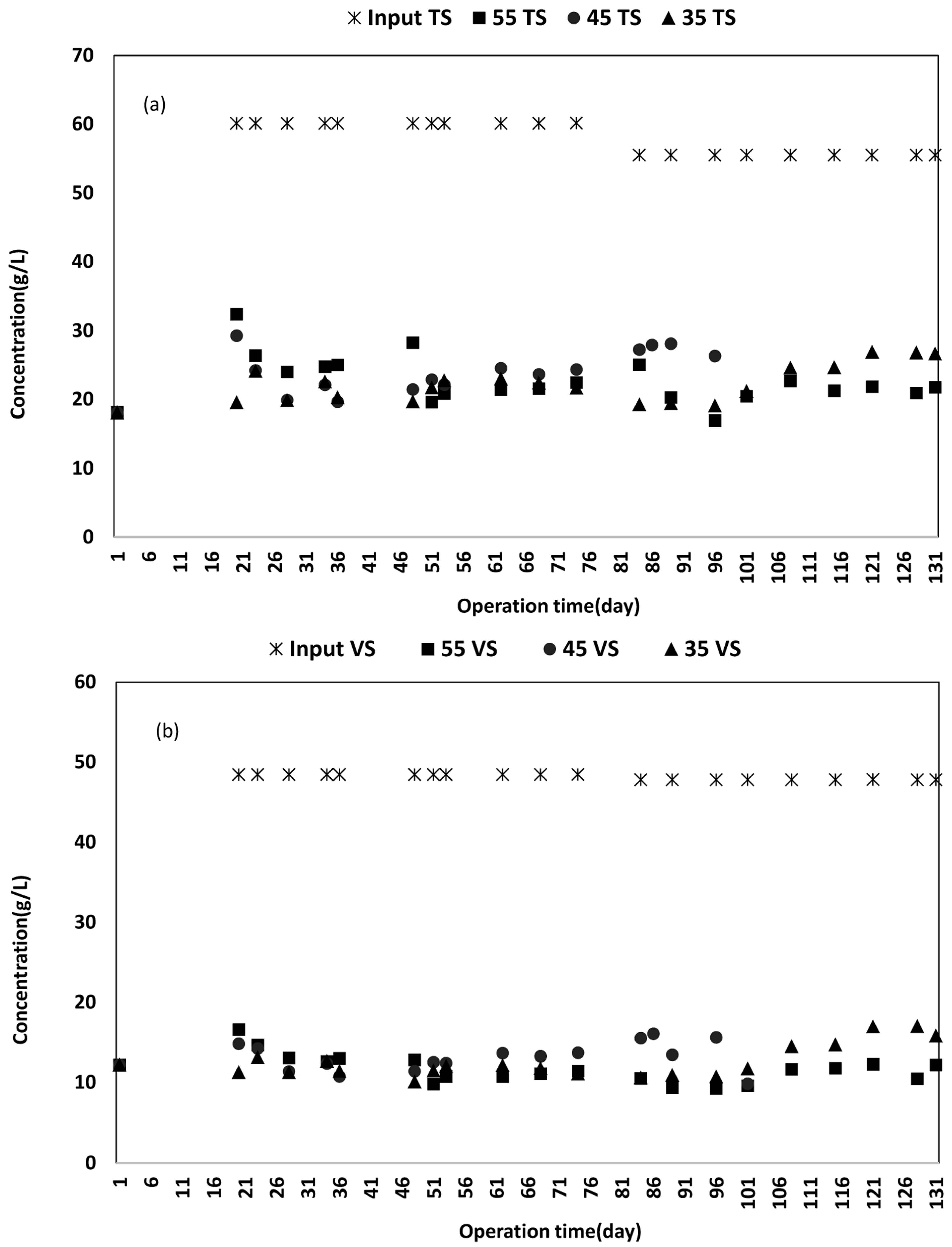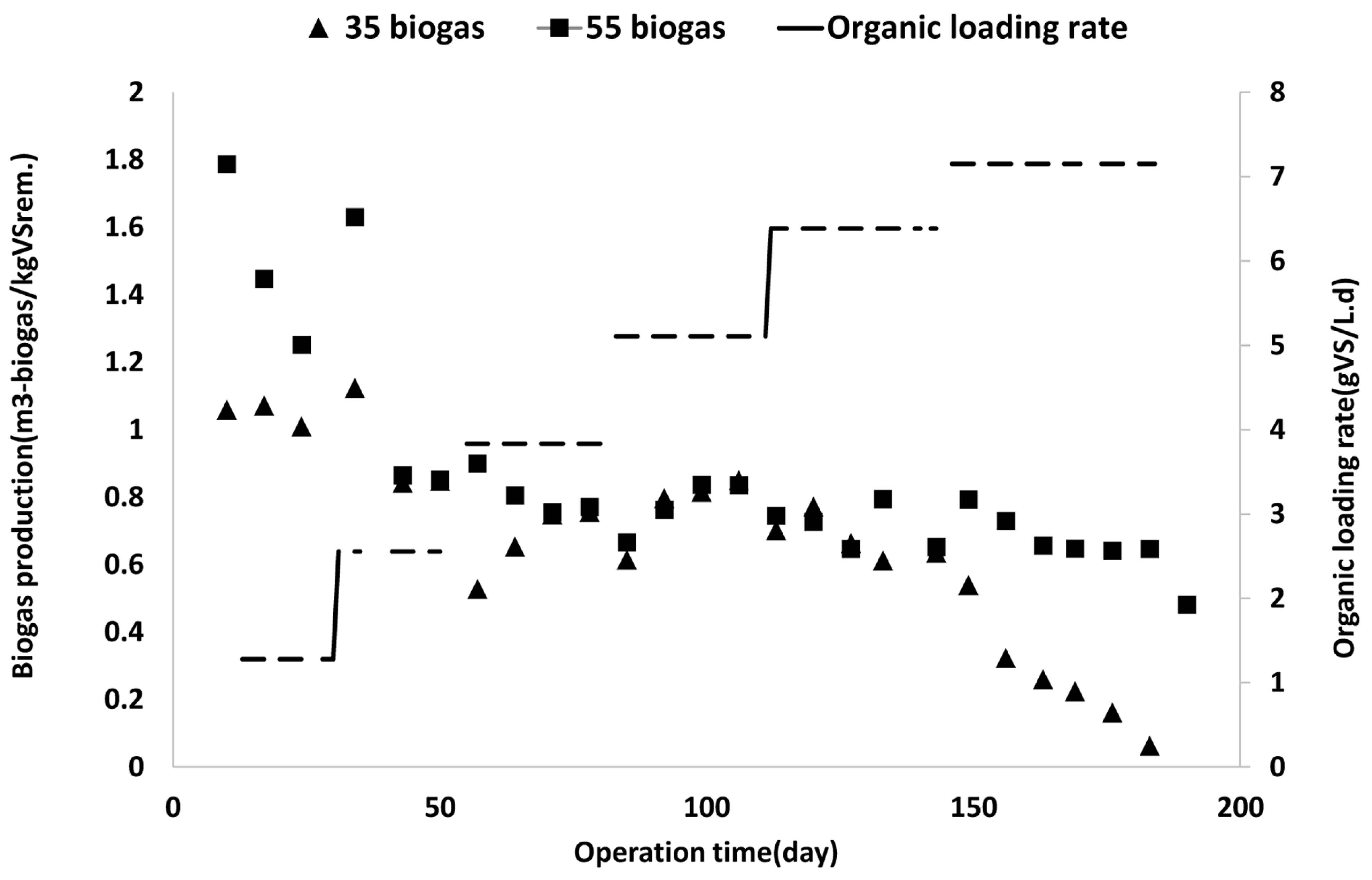 아래 표 2를 보면, 35 °C와 55 °C 조건에서는 안정적으로 처리할 수 있는 한계 유기물 부하율이 45 °C 조건의 2.4 kgVS/m3.d에 비해서 각각 3.2 kgVS/m3.d과 4.0 kgVS/m3.d 까지 높은 부하율을 처리할 수 있었으며, 유기물 제거율 역 시 45 °C 조건의 73 %에 비해서 각각 75 % 이상, 78 % 이상 의 높은