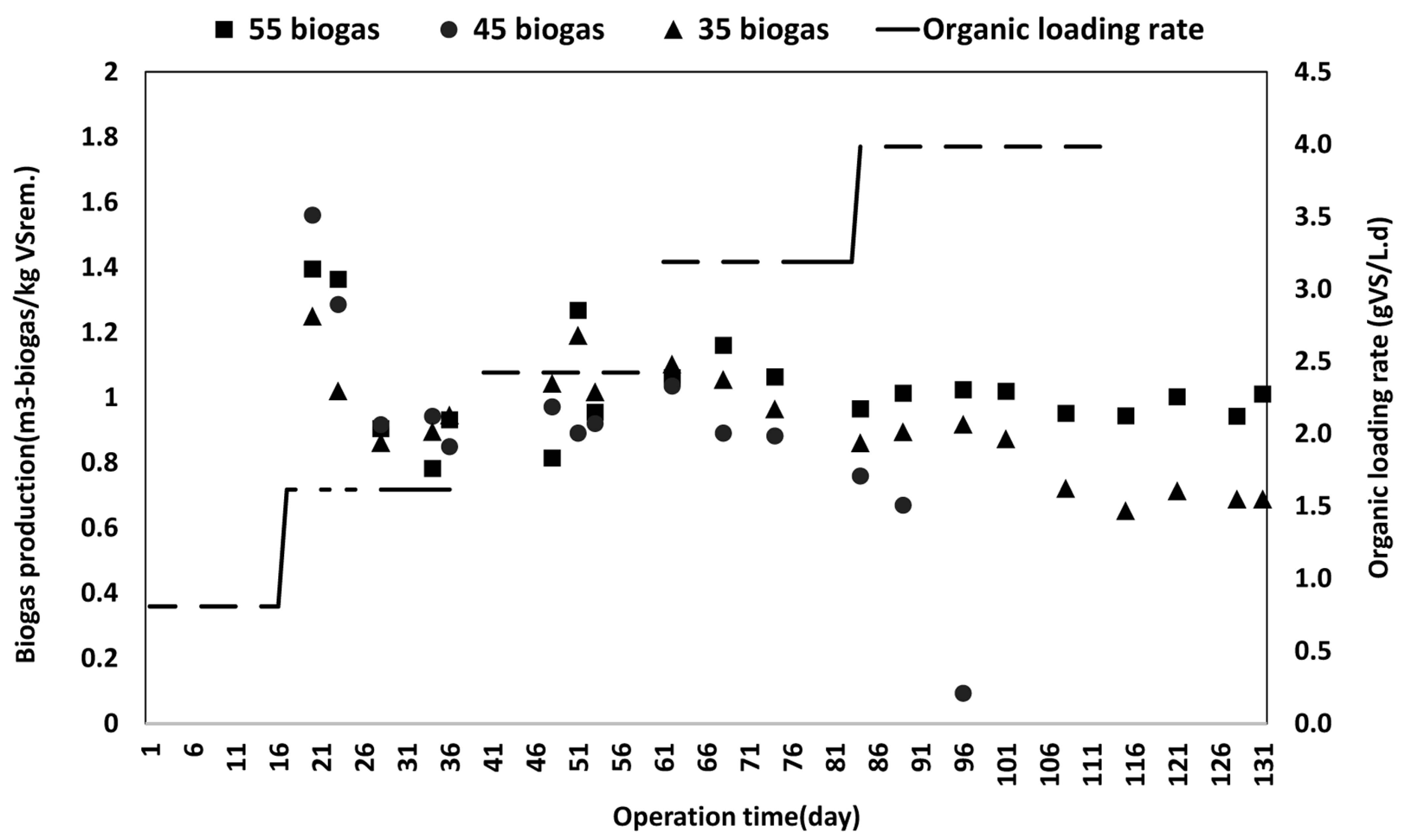 그림 2에서는 부하율의 변화에 따라서 바이오가스 발생량 을 살펴볼 수 있다. 그림 1의 (a)와 (b) 두 그림의 범례와 같 이 그림 2에서 55, 45, 35는 해당 온도에서 운전되는 혐기성 소화조의 온도의 단위를 생략하여 간단히 숫자로만 나타낸 것이다. 기질이 제거되는 양에 따라서