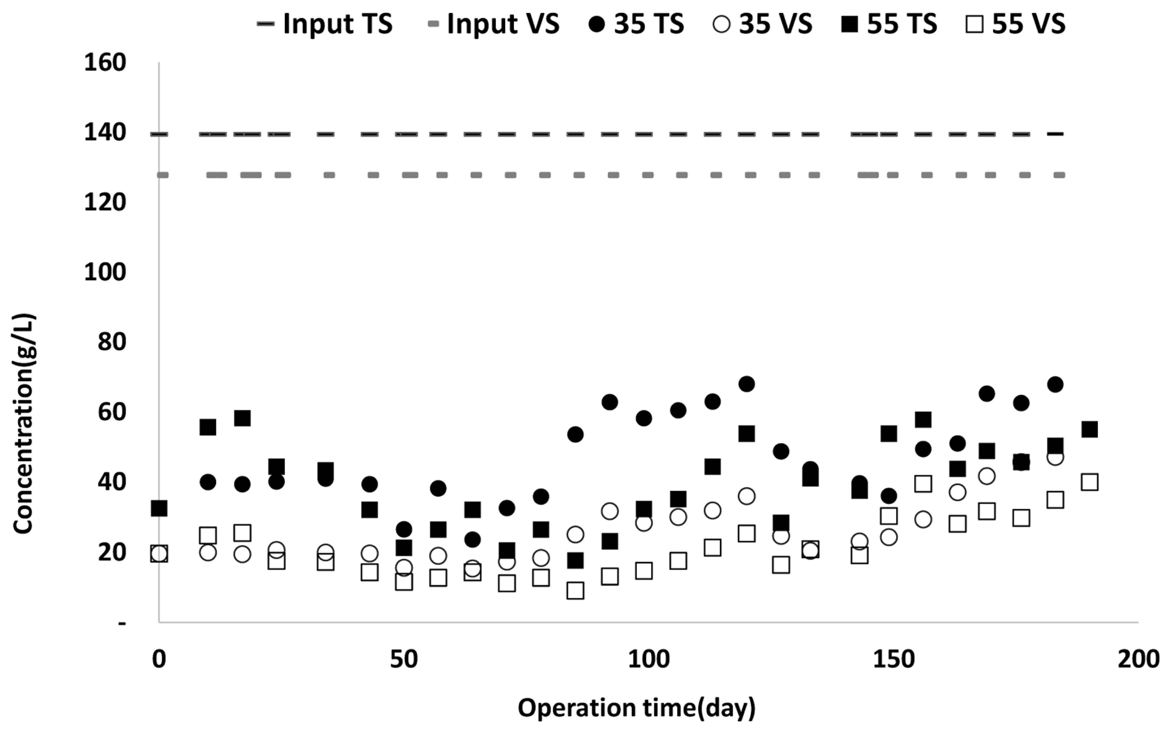 표 3과 그림 4에서 최대 기질부하 조건일 때, 유입기질 ton 당 발생하는 바이오가스량을 비교하면, 35 °C의 조건에서 생산 되는 바이오가스량은 약 103 m3/ton, 55 °C 조건에서 생산되는 바이오가스량은 약 115 m3/ton이 된다. 고온소화 조건에서 보 다 높은 유기물 부하율을 처리할 수 있기 때문에(최대 유기물 부하율 차이), 약 10 % 정도 높은 가스발생량을
