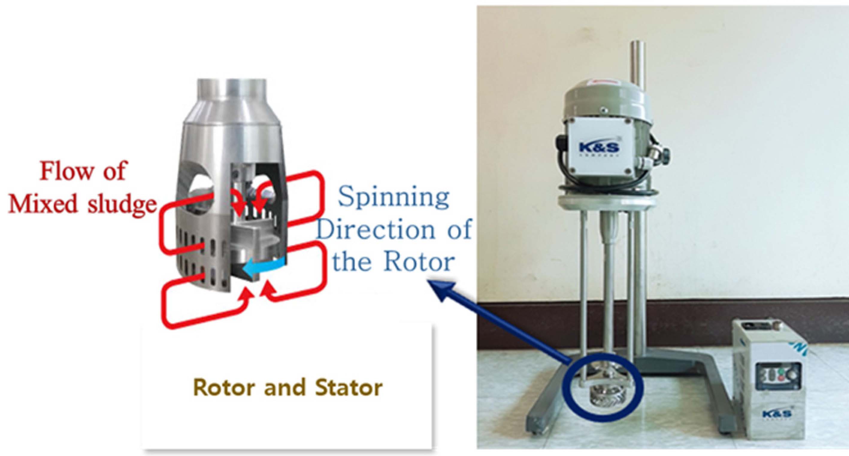 TS 7 % 혼합슬러지를 대상으로 파쇄 가용화 특성과 Biogas 수율 및 methane 생산량을 평가하기 위하여 High shear 방식 의 K&S Company HM1HF 균일분산 장치를 사용하여 파쇄 가용화를 실시하였다<Fig. 1>. 혼합슬러지의 가용화는 파쇄 장치 하부의 회전하는 Rotor와 고정되어 있는 Stator 사이의 간극(0.2 mm) 내에 발생되는 전단력에 의해 수행된다. 이때, Rotor의 회전력에 의해 와류현상이 발생하고, 이에 따라 슬러 지는 Rotor·Stator 간극 사이에 유입 되며 Stator 외부로 분 산작용이 연속적으로 이루어진다. 하지만, 가용화를 위해 적 용되는 하수슬러지의 투입량에 따라 Rotor·Stator 간극사이 의 유입 및 분산작용에 따른 실질적인 파쇄 적용시간의 차이 가 발생할 수 있으므로 혼합슬러지를 동일하게 1 L를 주입 하였고, 1,000, 2,000, 3,000, 4,000 rpm의 파쇄강도에서 최대 120분간 운전하였다. 가용화 슬러지는 전처리 조건에 맞게 실시간으로 분취하였다.