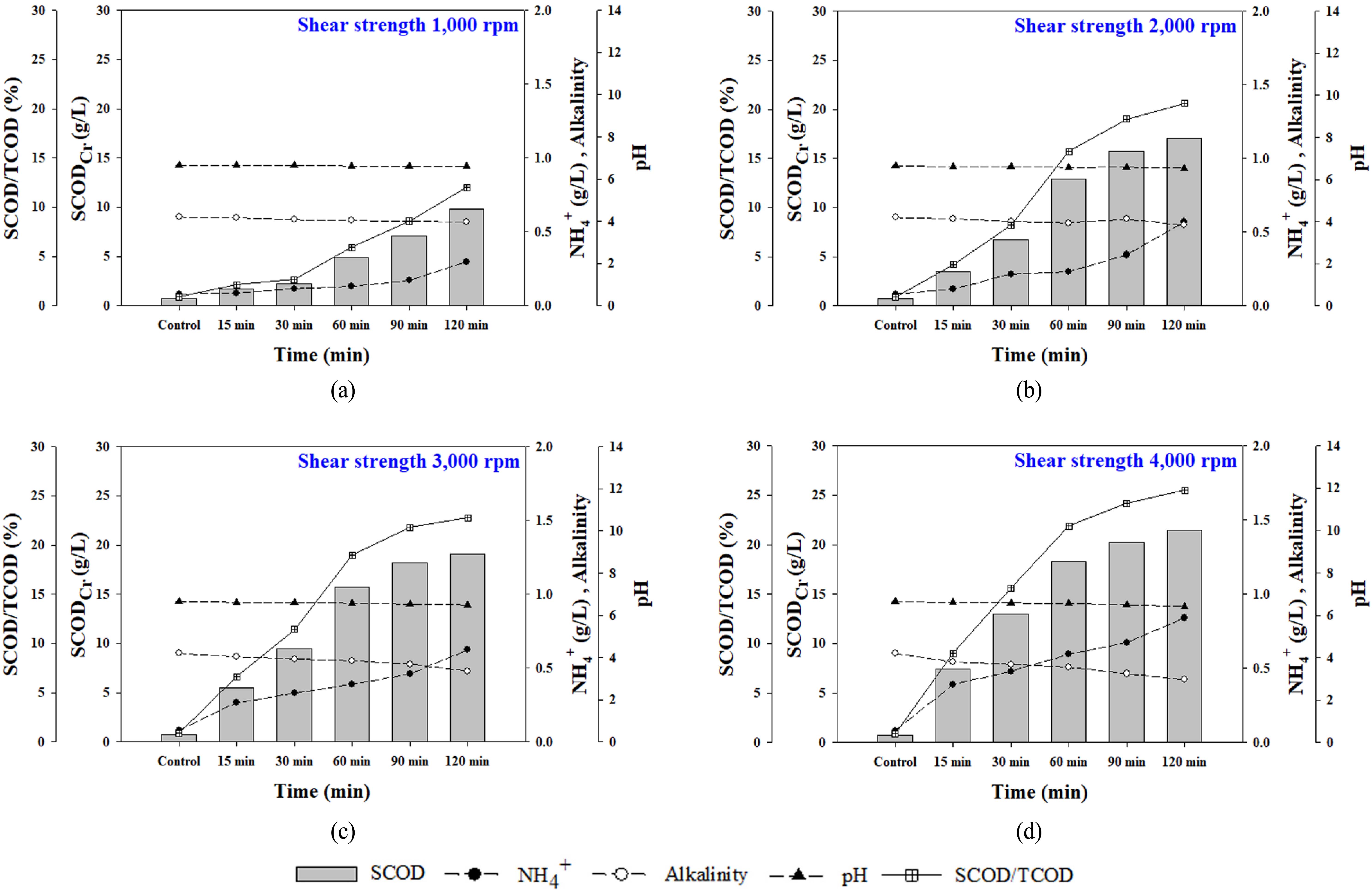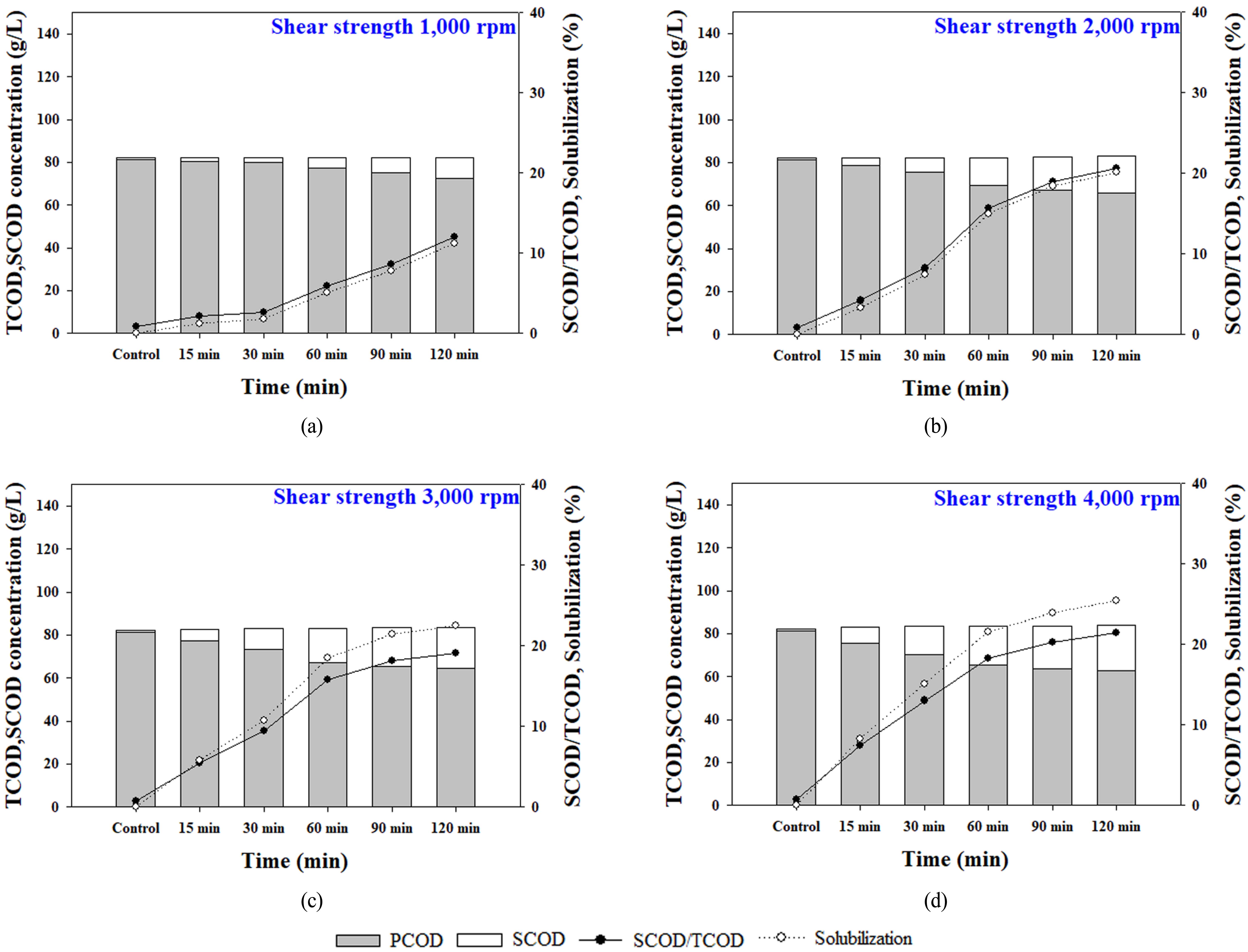 1. High Shear 작용이 일어나는 물리적 파쇄 가용화 전·후 혼합슬러지의 이화학적 특성조사 결과 입자성 물질 에서 Shear strength 및 가용화 시간이 상승함에 따라 4,000 rpm 120 min 조건에서 SCODCr 농도가 최대 21.43 g/L로 평가되어, 혐기성소화 공정 적용시 산발효 및 율속단계로 알려져 있는 가수분해 단계를 촉진 시킬 것으로 판단된다.