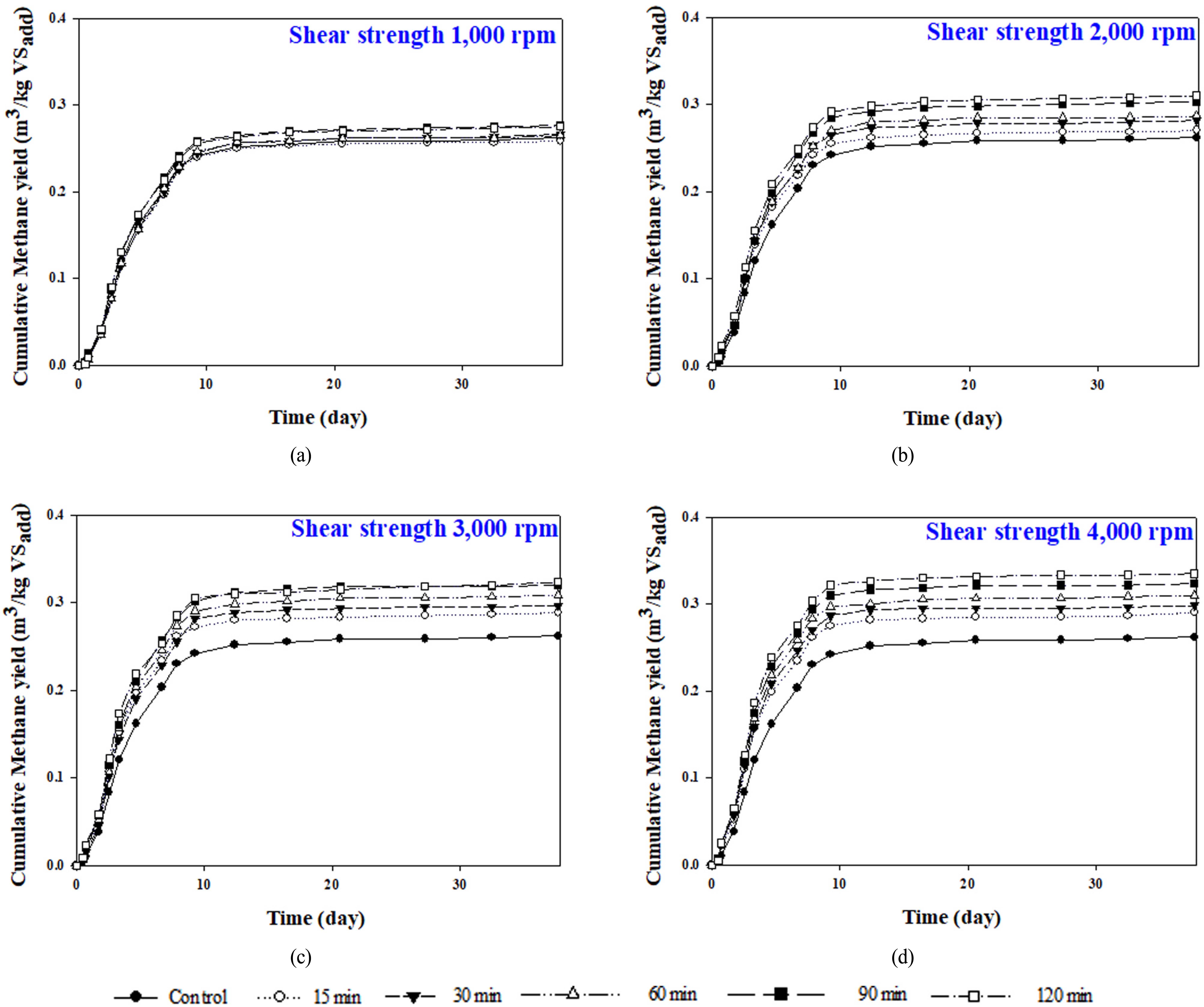 4. 가용화 슬러지의 생분해도 특성 평가결과, 1,000 rpm에 서 2,000 rpm으로 Shear strength가 상승 시, 가용화효율 및 methane 생산량이 급격하게 증가하였다. 이후 3,000, 4,000 rpm에서는 급격한 증가를 나타내지 않은 것으로 보아, 최적 Shear Strength는 2,000 rpm로 평가 되었다.