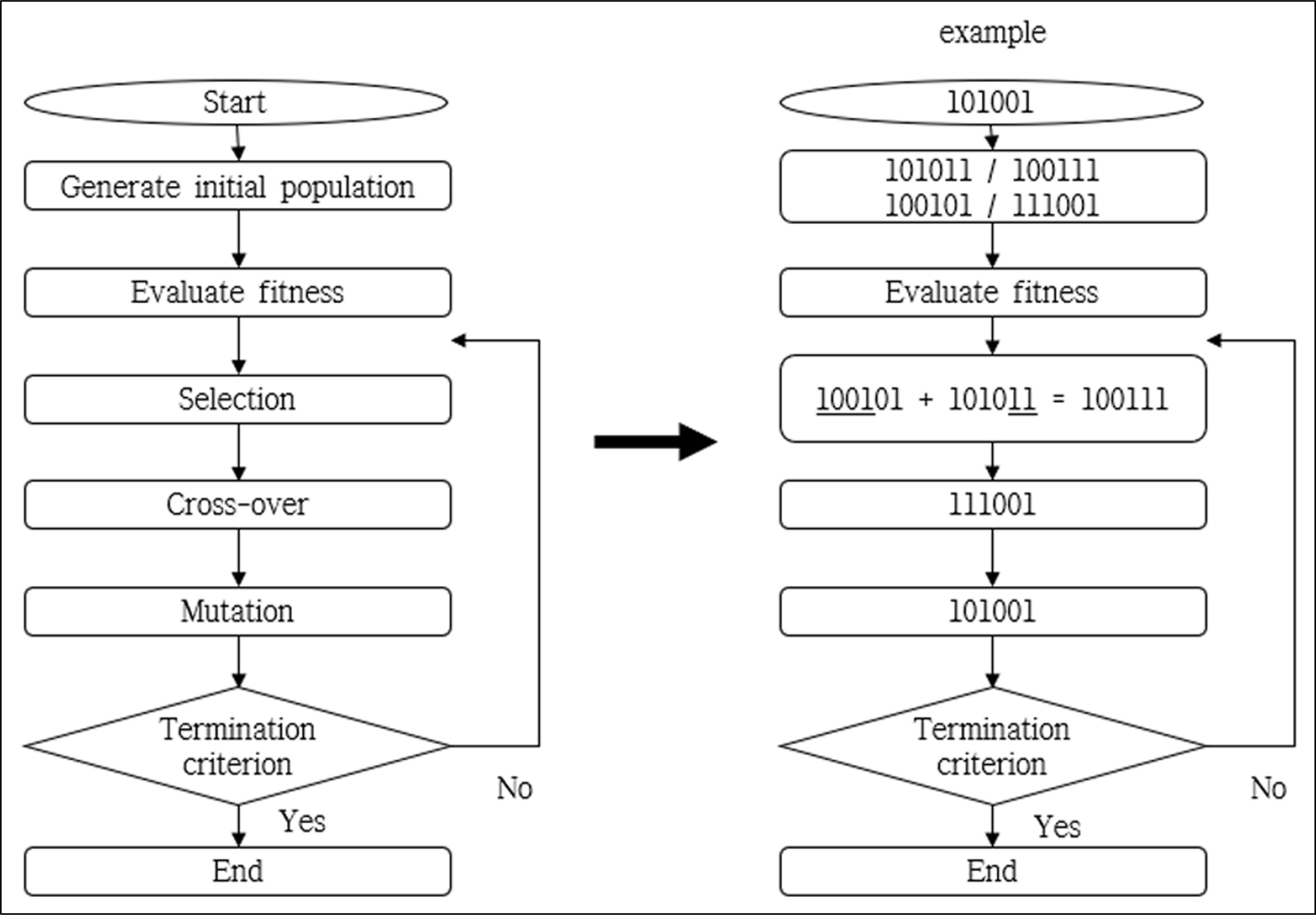 하수처리시설에 AI 기술을 적용하기 위해서는 알고리즘이 필요하다. 그 중 가장 기본적인 알고리즘은 인공신경망 (Artificial Neural Network, ANN)이다. 인공신경망이란 인간 의 두뇌와 행동을 정의하고 간단하게 실행하는 구조로 신경 세포를 수학적으로 처리가 가능하도록 만든 것이다(Kim et al., 2008). 또한 인공신경망의 핵심은 경험적 데이터를 가지 고 있지 않은 상태에서 예측되는 값의 정확성과 유효성, 즉 신뢰할 수 있는 데이터를 도출하는 데에 있다(Picos and Peralta- Hernández, 2018). 이러한 신뢰할 수 있는 데이터를 도출하기 위해서는 많은 시행착오 과정을 겪게 되며, 이러한 과정을 줄이기 위해 인공신경망을 다양한 알고리즘을 통해 교육(training)시키고 개선시키는 것이다. 알고리즘의 명칭은 기존의 인공신경망 알고리즘을 바탕으로 교육(training)되는 방법에 따라 달라진다. 또한 각각의 특징이 존재하고 장·단 점이 뚜렷하다(Table. 3). Bagheri et al. (2015)은 다층퍼셉트 론(Multi Layer Perceptron, MLP) 알고리즘을 사용했다. 다층 퍼셉트론은 단층퍼셉트론(Single Layer Perceptron, SLP)의 비선형적 성질을 해결하지 못하는 한계점을 해결하기 위해 은닉층을 추가하였다(Fig. 1). 그러나 은닉층에서 발생되는 오 차를 설정하는 방법이 제시되어 있지 않고 확실하지 않은 문 제점이 발생한다. 다음으로 기존 연구에서의 역전파(Back Propagation, BP) 알고리즘을 검토했다(Elmolla et al., 2010; Fernandez de Canete et al., 2016; Giwa et al., 2016; Kundu et al., 2013; Vyas et al., 2011; Xue, 2017). 각 층에서 발생되 는 오차를 역으로 전파하여 발생된 가중치를 조정하고 오차 가 낮게 발생하도록 구조를 형성하는 것이다(Fig. 2). 그러나 대개 AI 기술에 있어 은닉층이 3개 이상일 때 딥러닝(Deep Learning)이 나타나는데, 역전파 알고리즘의 경우 은닉층의 수가 많아질수록 오차를 줄여주는 가중치의 보정 기능이 상 실되어 기울기가 형성되지 못하고 0이 되는 ‘기울기 소실’ 문 제가 발생하는 한계점이 있다. 다음으로 LM(Levenberg- Marquardt) 알고리즘을 검토했다(Abyaneh, 2014; Nasr et al. 2012). LM 알고리즘은 Levenberg(Levenberg, 1944) 방법을 Marquardt(Marquardt, 1963)가 추가·보완한 알고리즘이다. LM 알고리즘의 경우 비선형적 구조를 해석하는데, 수렴 속도 가 빠른 장점으로 인해 많이 사용되는 방법이다. 그러나 일부 행렬 계산에 있어 직접적인 개입이 필요하다는 단점이 존재 한다(Kwak, 2010; Park and Kim, 2013). LM 알고리즘을 보 완한 것이 유전자 알고리즘(Genetic Algorithm, GA)이다(Fig. 3). 유전자 알고리즘은 AI 기술 활용에 있어 중요한 알고리즘 이다. 유전자 알고리즘은 반복과정을 통하여 최적 구조 형성 을 도출하고(Picos-Benítez et al., 2017), 비선형적 구조를 해 석·해결에 있어 탁월하며(Picos and Peralta-Hernández, 2018), 실시간으로 데이터를 입력 및 반응하여 최적 구조를 반복하여 형성시켜준다(Kadri and Boctor, 2018). 하수처리시 설에 AI 기술을 적용한다면 비선형적 특성을 해결하고, 계속 변동되는 다양한 데이터를 반영하여 정확한 예측이 가능하다. 그렇기 때문에 AI 기술 알고리즘에는 유전자 알고리즘이 가 장 적합하다고 판단된다.