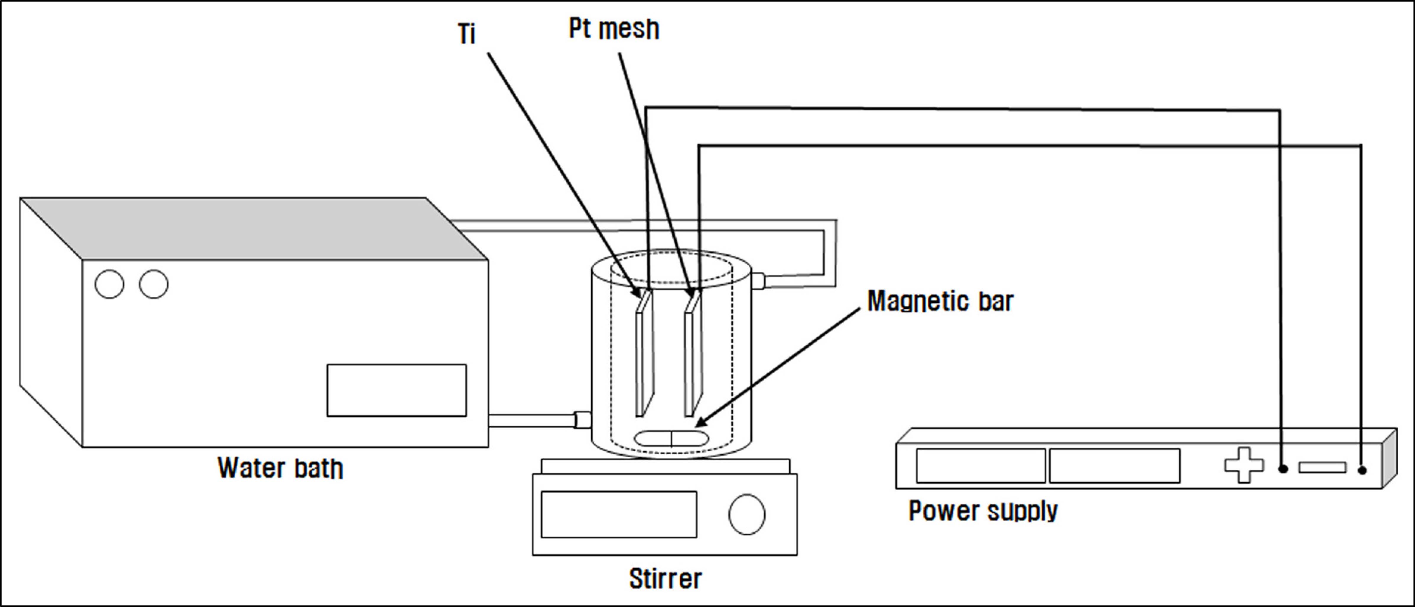 water 순으로 10분씩 sonication 후 사용하였다. 양극산화 시 사용된 음극은 50 × 80 mm mesh 형태의 platinum을 사용하였으며,