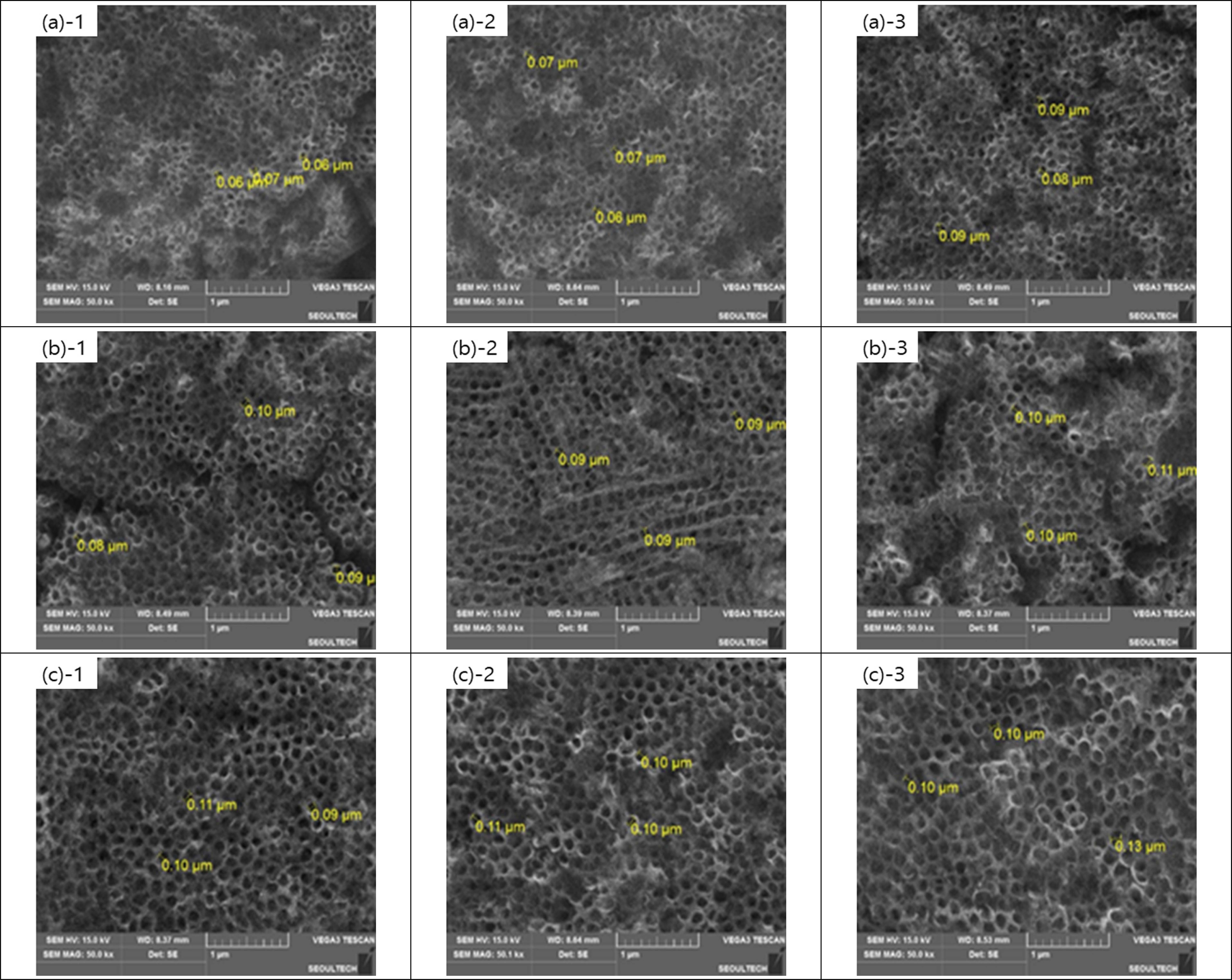 본 연구에 사용된 전해질은 ethylene glycol base에 H2O2 vol%, NH4F 0.2 wt%로 동일한 조건으로 사용하였으며, 이 로 인해 surface 분석 시 인가전압과 반응시간 차이에 의한 TiO2 nanotube 공극 크기의 차이는 나타나지 않은 것으로 판 단된다.
