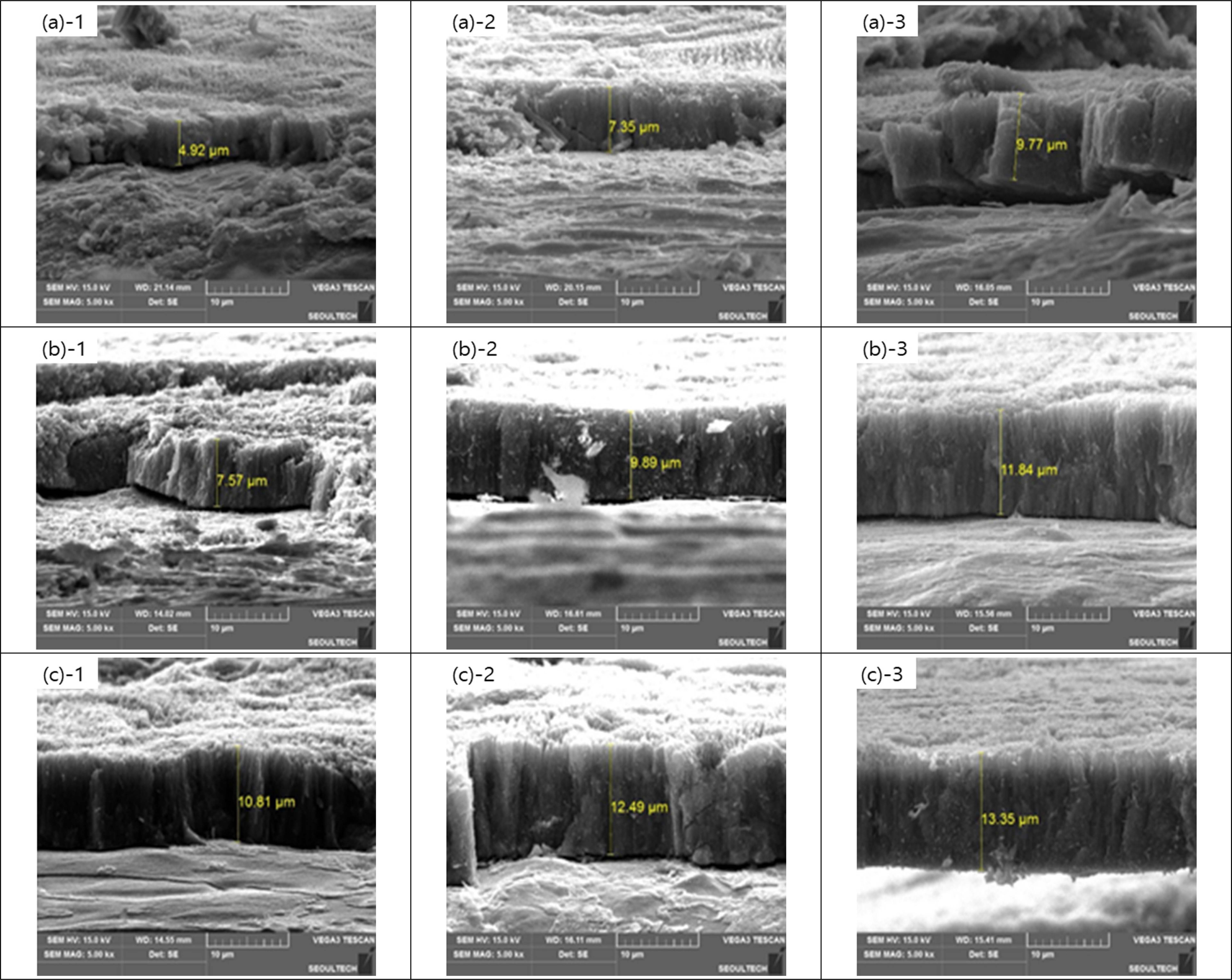 Fig. 3. Cross section morphology analysis of TiO2nanotube plate (a) 40 V (b) 50 V (c) 60 V (Anodozation time -1: 5 hours, -2: 10 hours, -3: 15 hours).