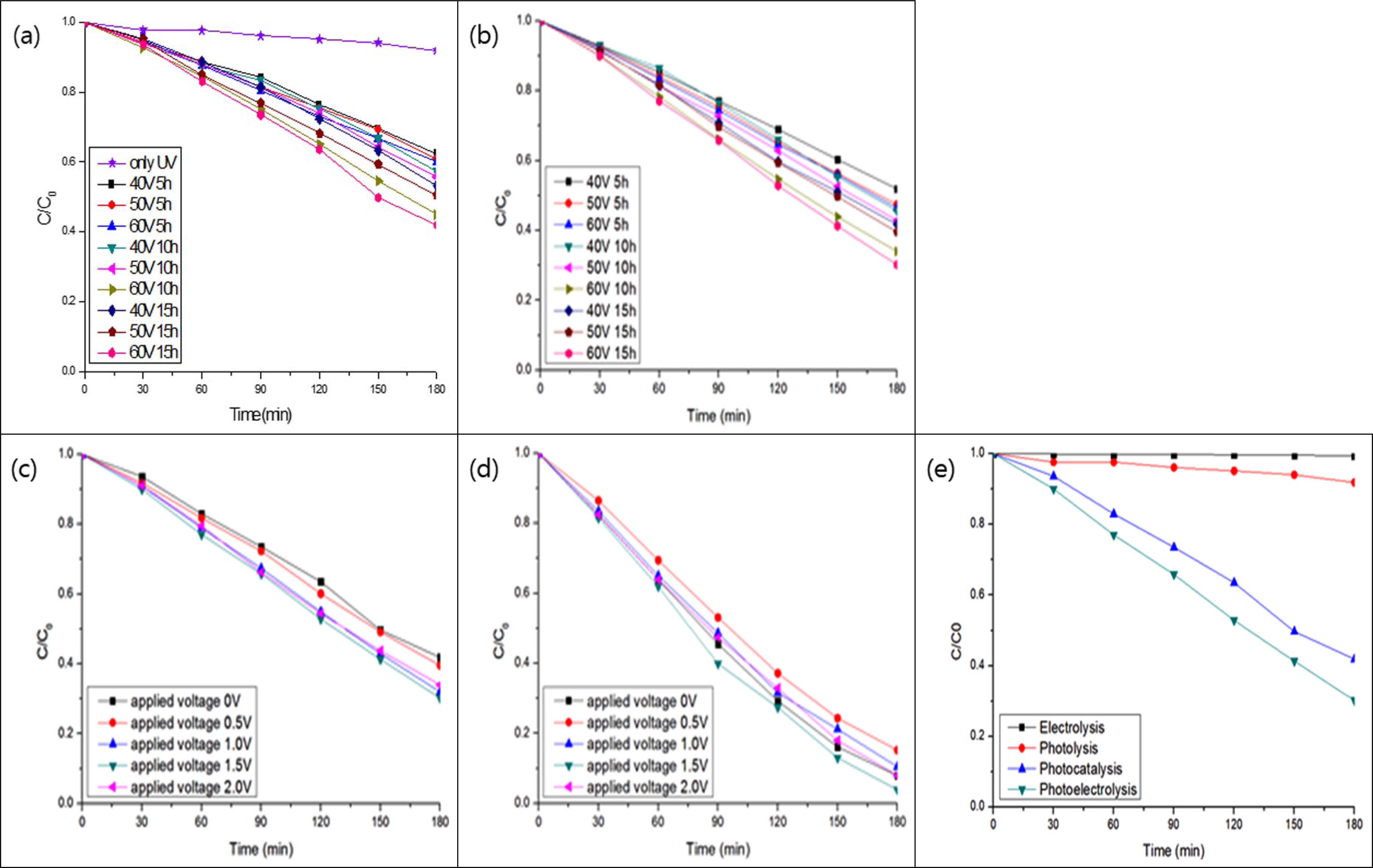 전압인가는 TiO2의 반응 기작 중 electron·hole 재결합 감소 등의 작용으로 인해 더 높은 색도제거율을 나타낸 것이 라 판단되지만 전압의 증가는 효용성 증가를
