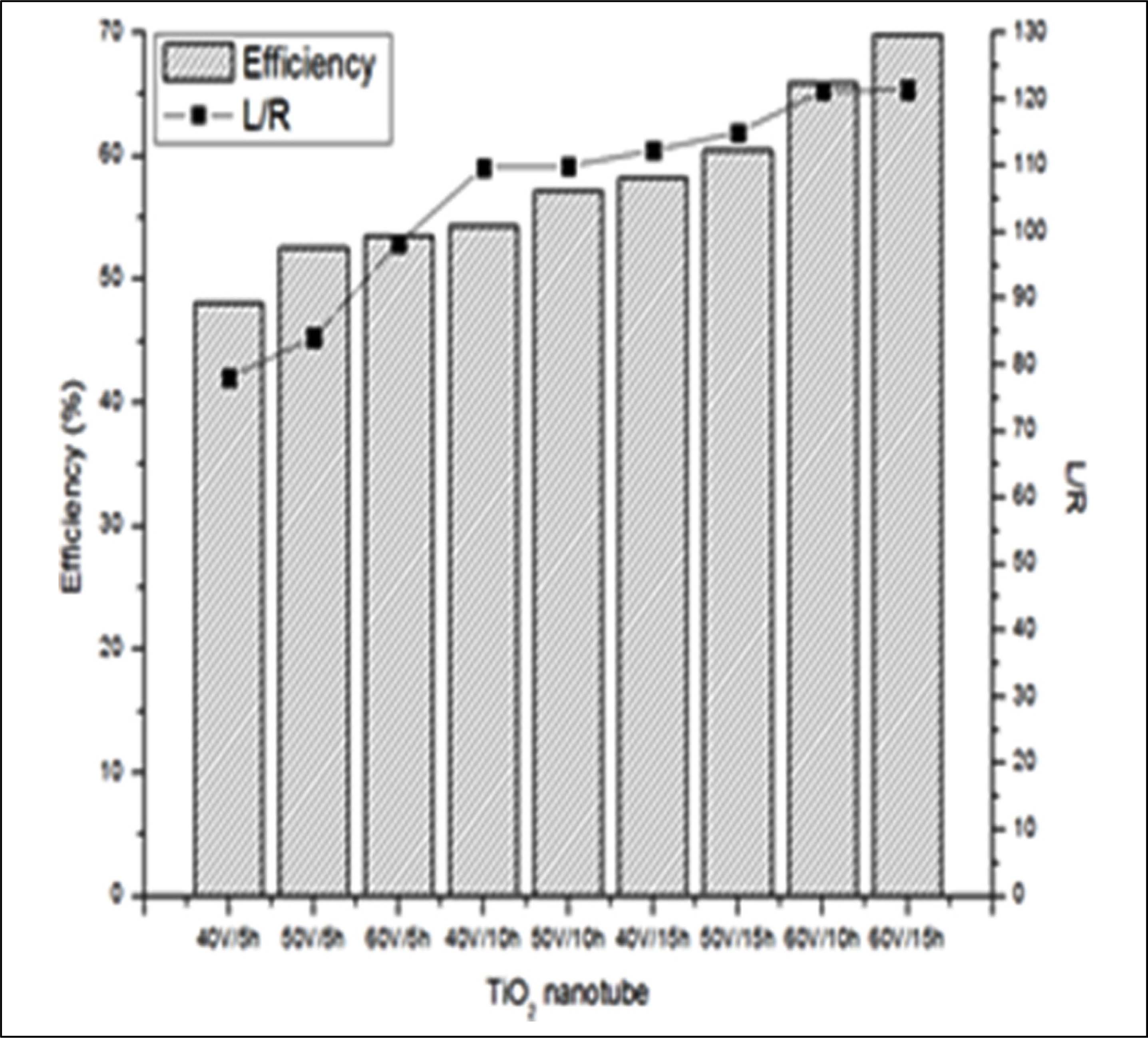 Fig. 5. The connection between L/R and decolorization efficiency of TiO2nanotube plate.