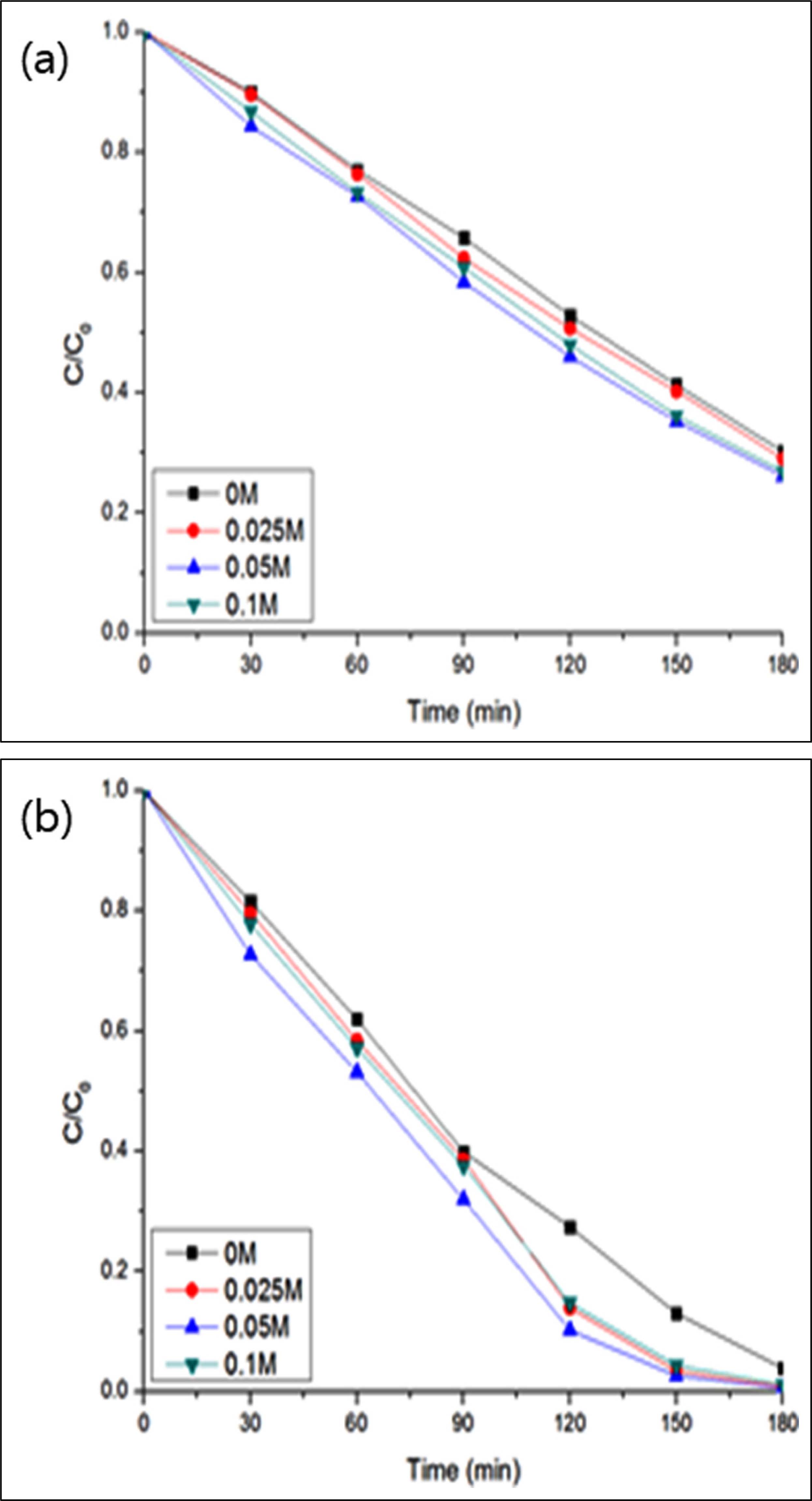 Methyl orange 용액에 0.025, 0.05, 0.1 M의 Na2SO4를 첨가 하여 함유된 염 농도에 따른 색도제거율의 변화를 알고자 하 였다. Fig. 6과 같이 색도제거율은 염의 농도가 증가할수록 높 아지는 것을 알 수 있었지만, 1 M의 염이 첨가될 시 낮아지는 결과를 나타냈는데, 이는 용액의 conductivity와