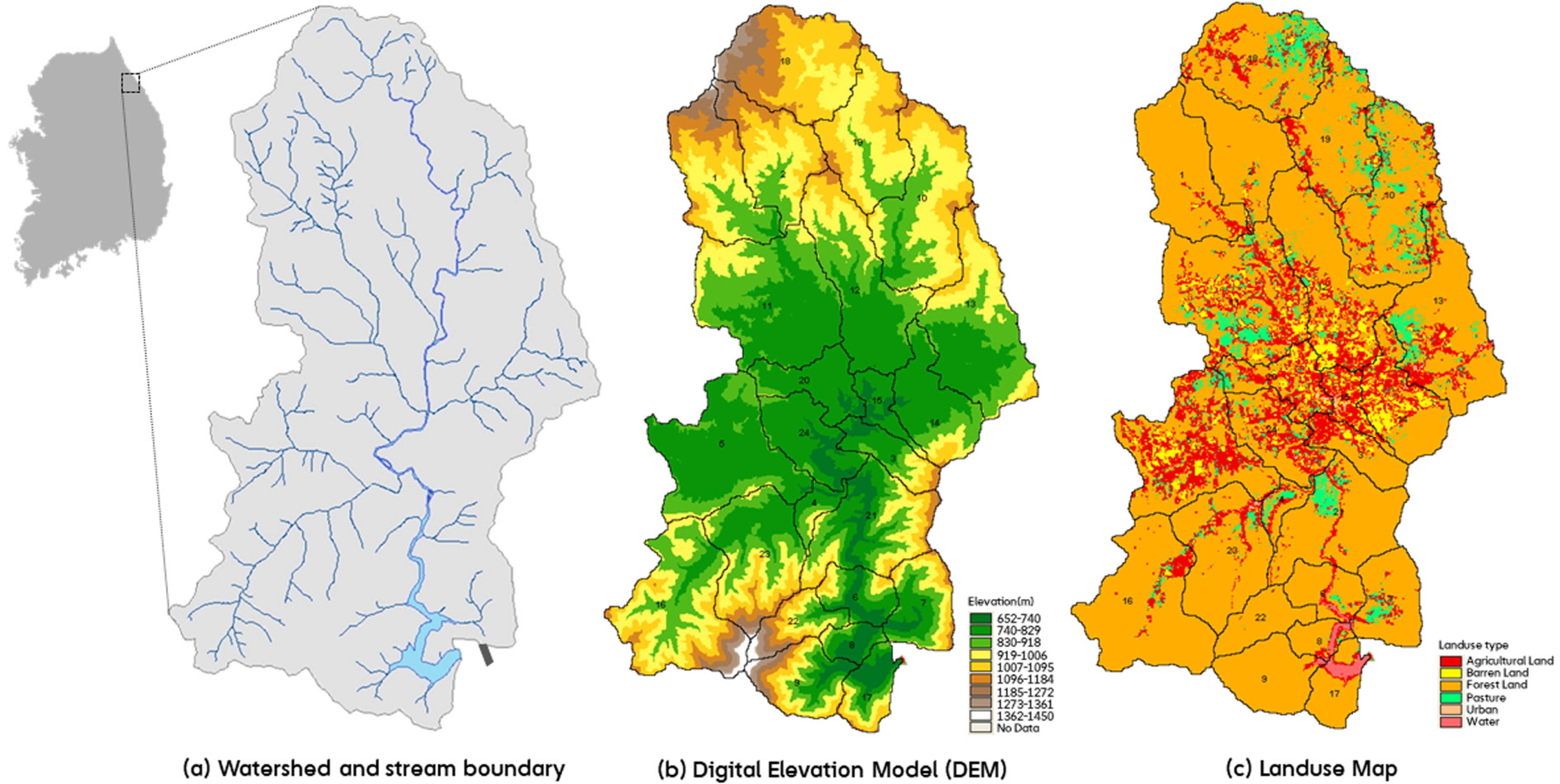 Fig. 1. Thematic maps of geographic information system in the study area. (a) Watershed and stream boundary, (b) Digital Elevation Model (DEM), (c) Landuse Map of Study area.