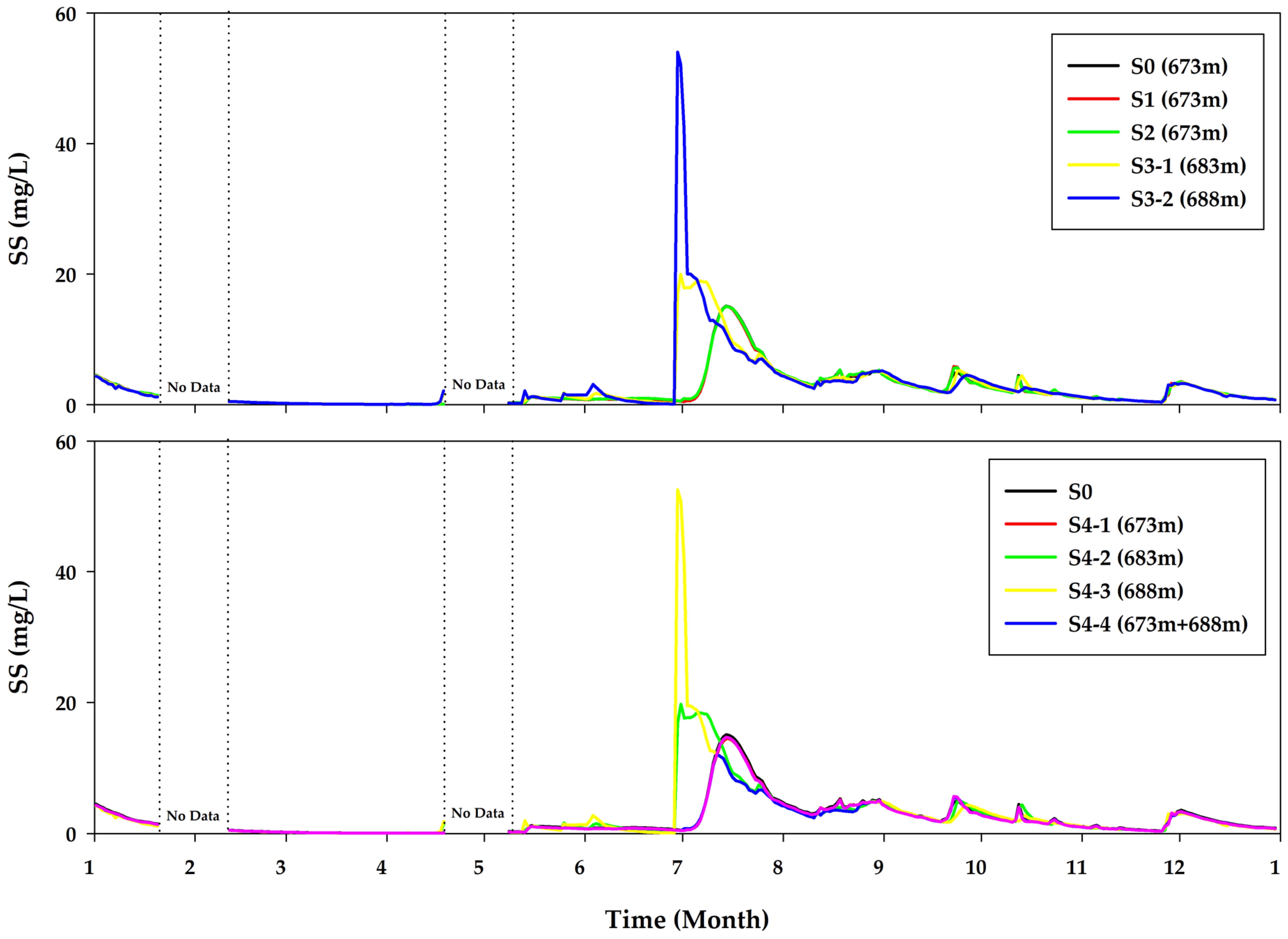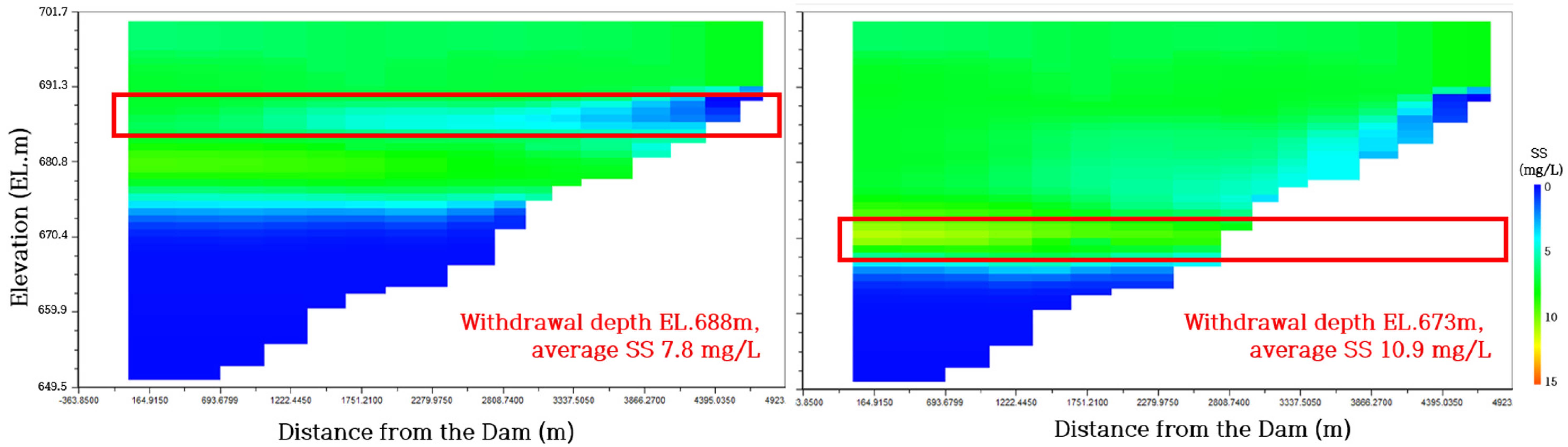 EL.688 m에 서 방류하는 경우 더 높은 SS 농도의 저감효과를 보였다. 따 라서 연중 EL.673 m에서 취수하며 다량의 토사가 집중강우 시