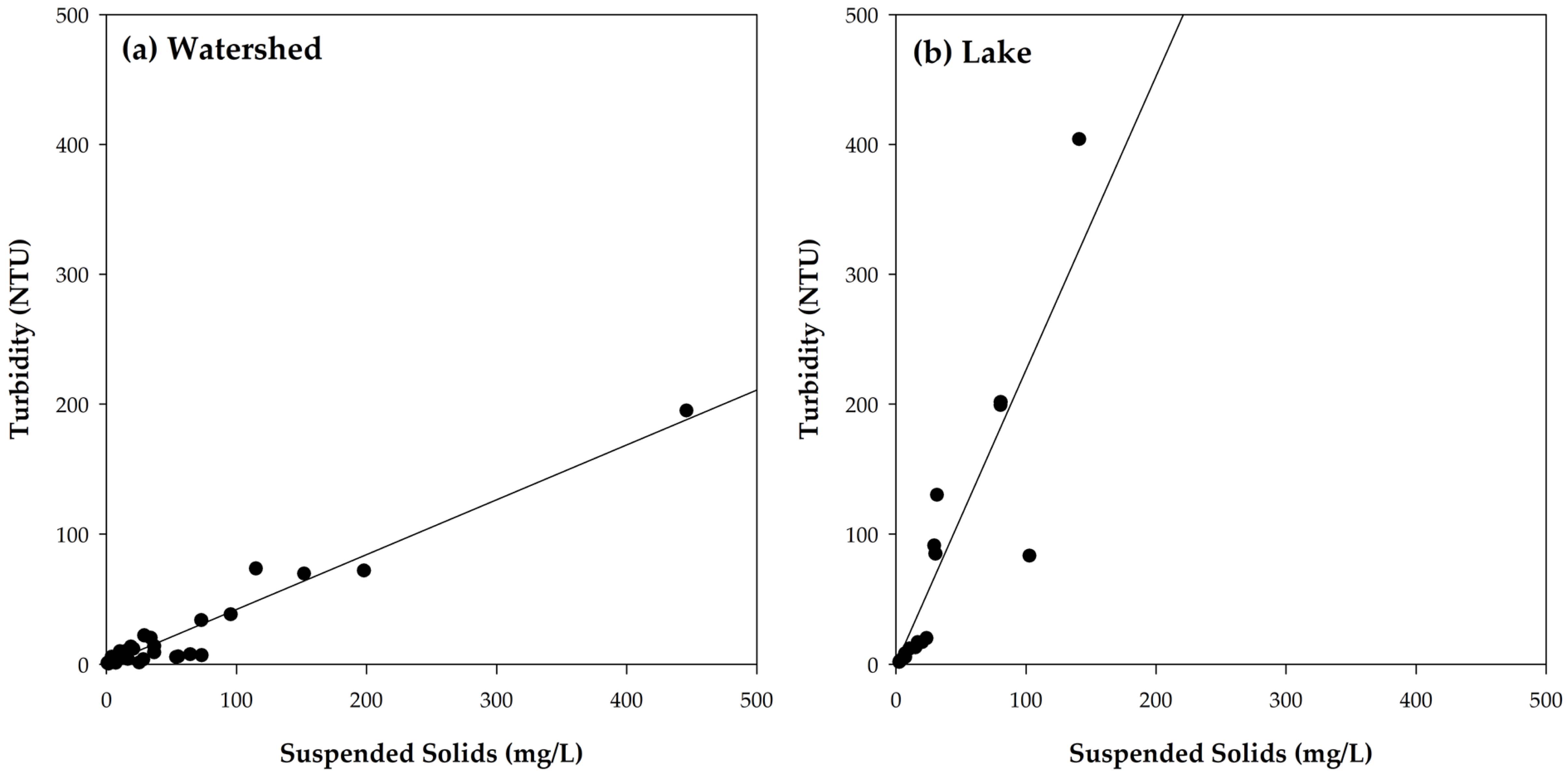 여기서, Turbidity는 탁도(NTU), SS는 부유사 농도(mg/L)이 며, 적용된 관계식의 상관계수(R2)는 각각 0.93과 0.81로 높 은 상관성을 나타낸다(Fig. 2).