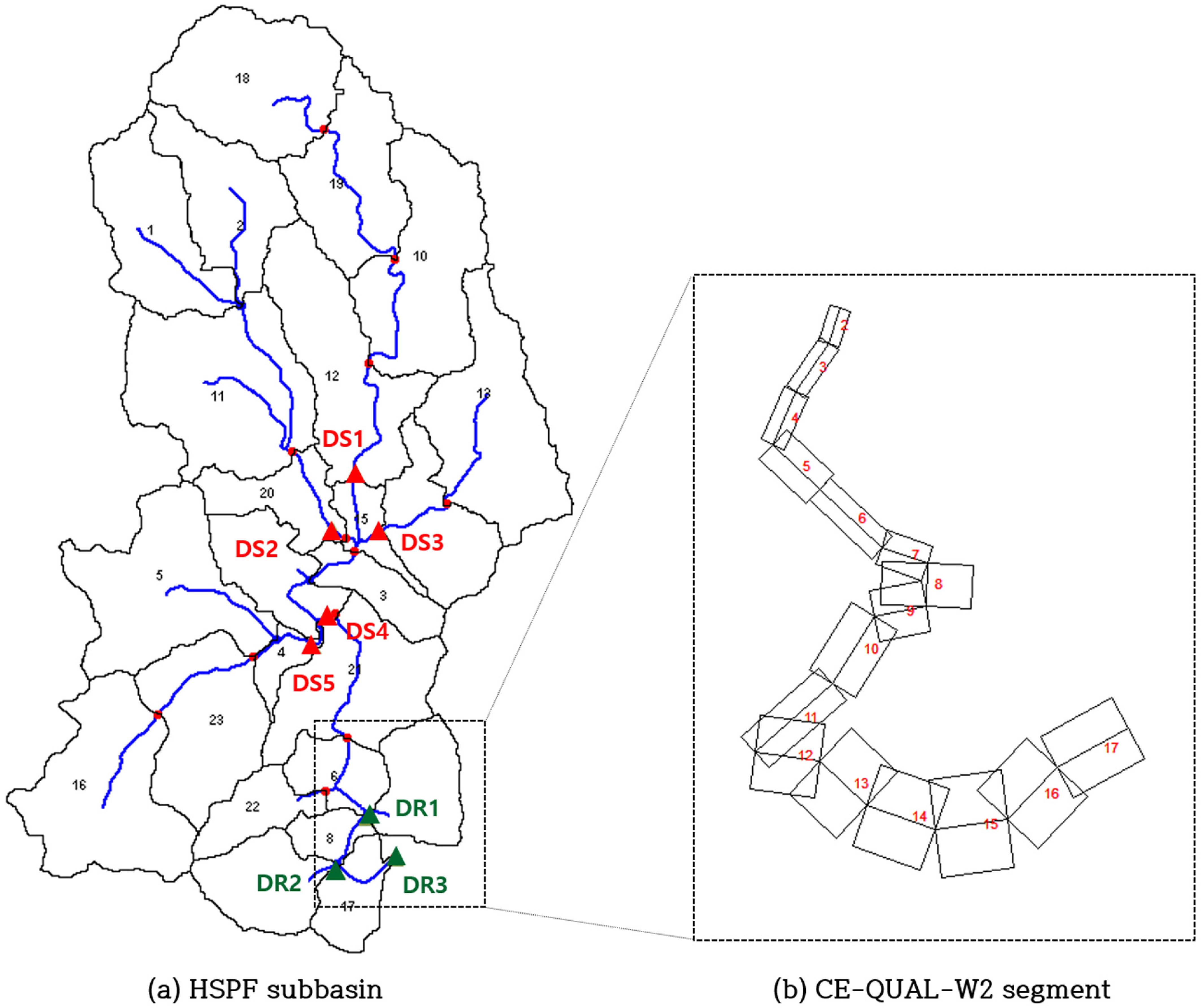 최근 비점오염원을 저감하기 위한 연구는 유역 내 유출 특 성과 호내 SS 거동 예측을 위한 유역-호소 모델 연계적용이 다방면으로 진행되어 왔다. Yi et al. (2008)은 유역-호소 모 델을 연계 적용하여 용담댐의 강우시 저수지로 유입되는 탁 수 발생을 예측하고, 그 거동을 분석함으로써 탁수관리를 위 한 방안을 연구한