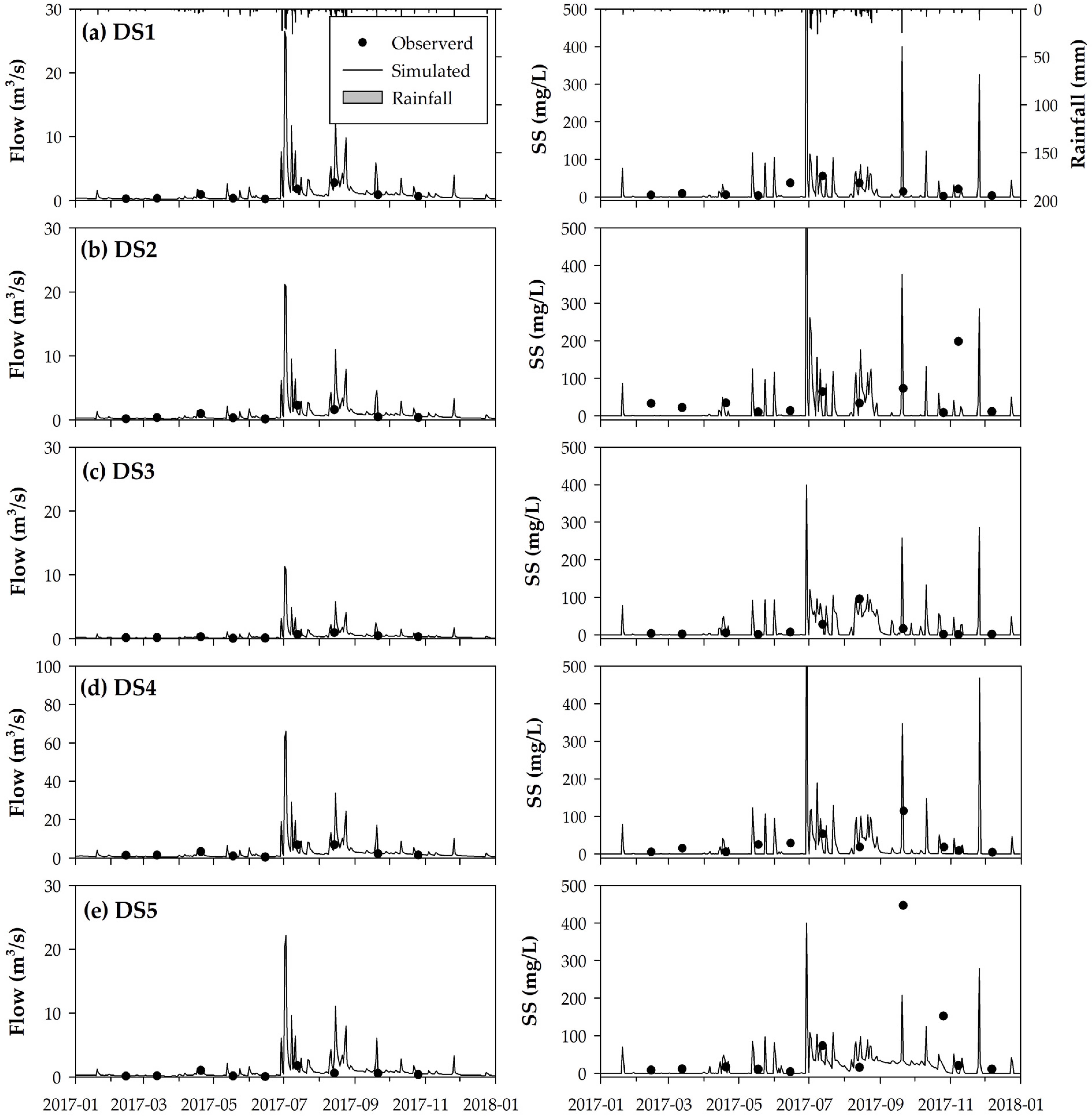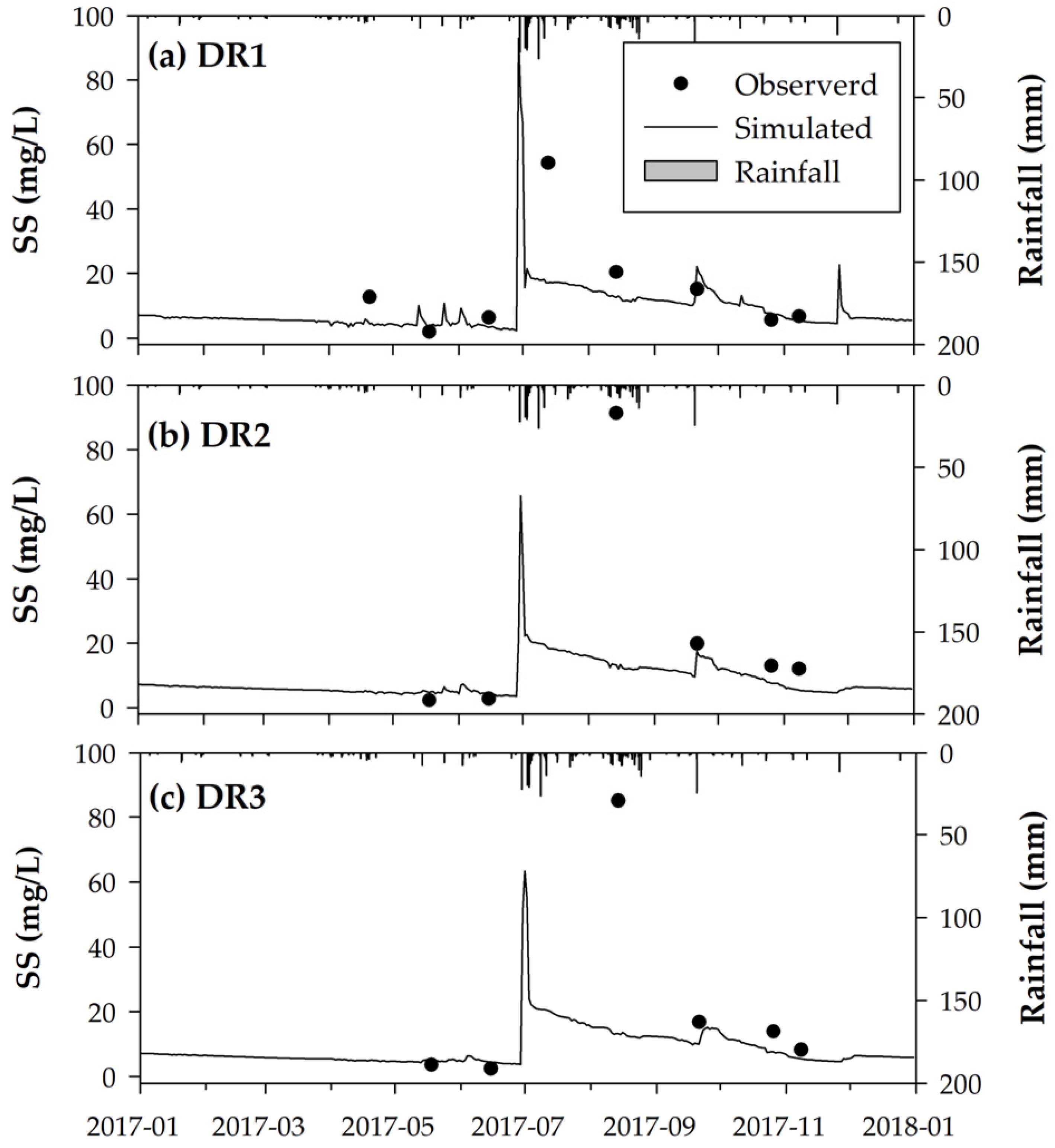 탁도(Turbidity)로 환산하였다. 2017년 유입하천에 서 실측된 탁도와 SS 농도값을 이용하여 SS-탁도 상관관계식 을 도출한 후 탁도로 환산하였으며,