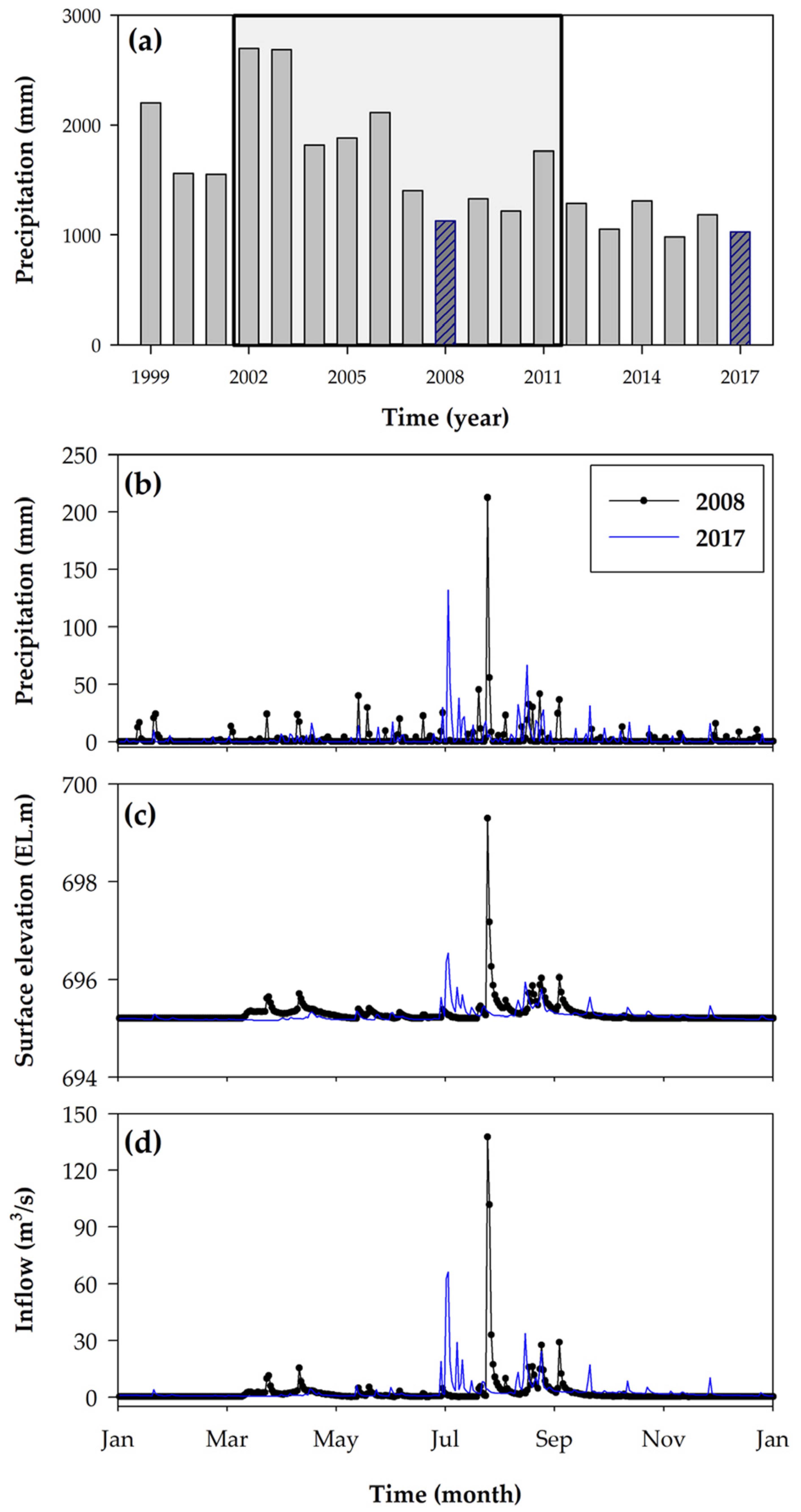 도암호 유역에서 유입되는 탁수를 저감하기 위한 시나리오 는 유역대책과 호내대책으로 구분하였다(Table 1). 수질개선 대책 시나리오는 2017년 기상, 유량 및 수질 조건에서, 2001 년 이전과 유사하게 일평균 9시간, 40만 m3/day로 발전방류 하는 것으로 가정하였다. S0 시나리오는 현재 상태(2017년 조건)에서 발전방류를 재개하여 남대천으로 방류수가 유입되 는 대조