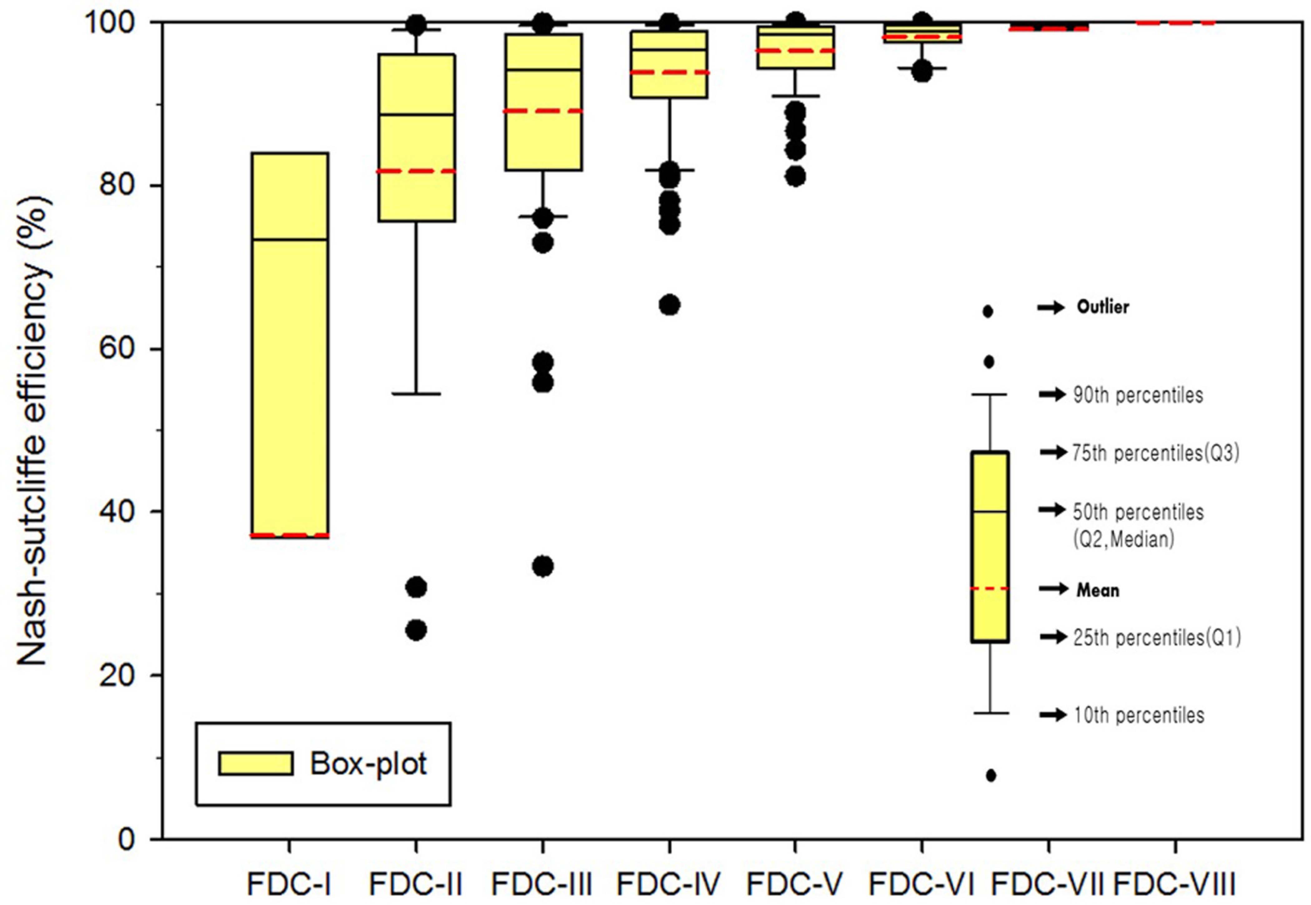 따른 FDC의 차이를 Nash and Sutcliffe Efficiency (NSE) 분석기법을 이용하여 평가하였으 며, 유역을 대표하는 FDC 작성을
