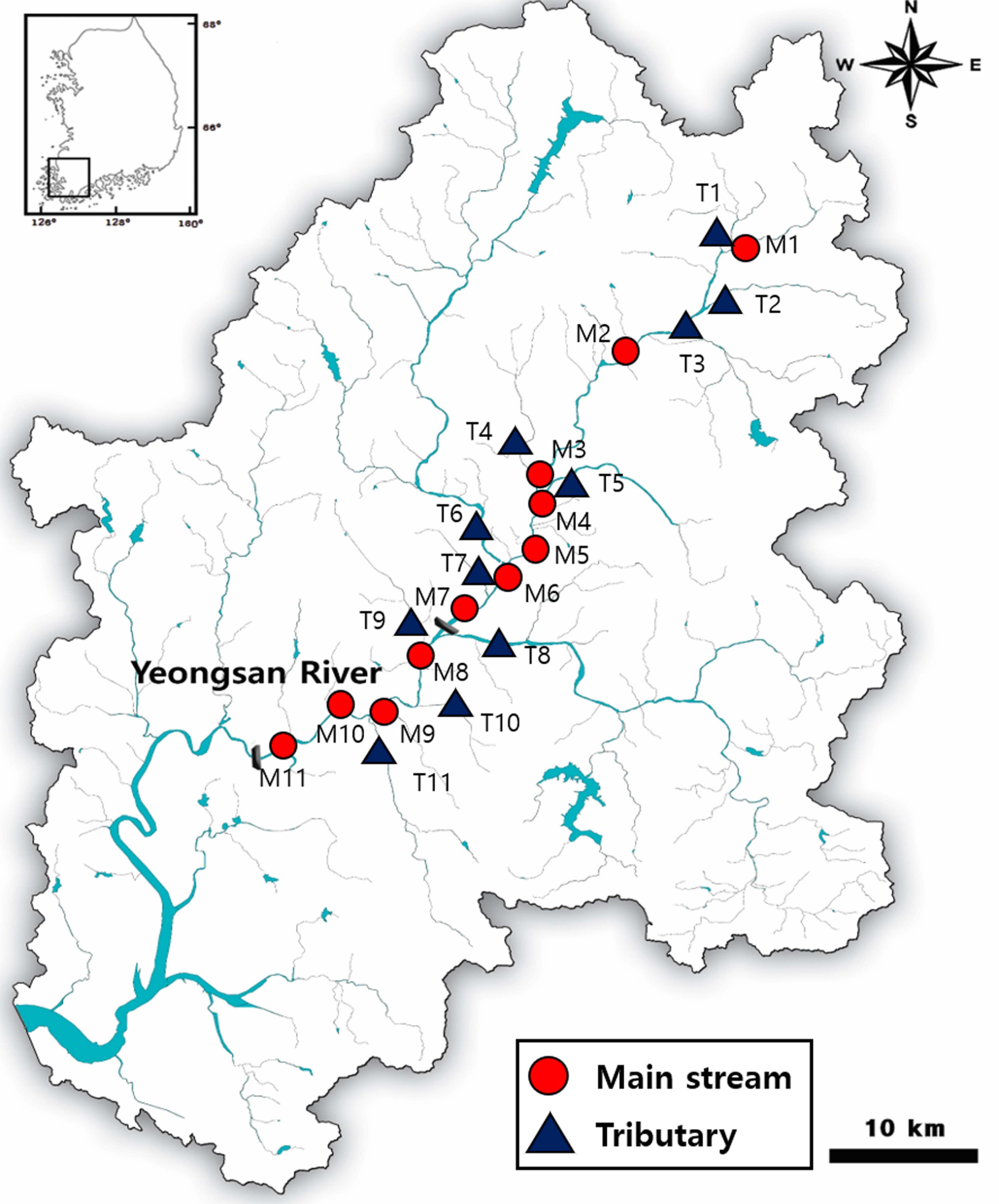 Fig. 1. Location of sampling site in the Yeongsan River. The circles and triangles indicate main stream and tributary of the Yeongsan River, respectively.