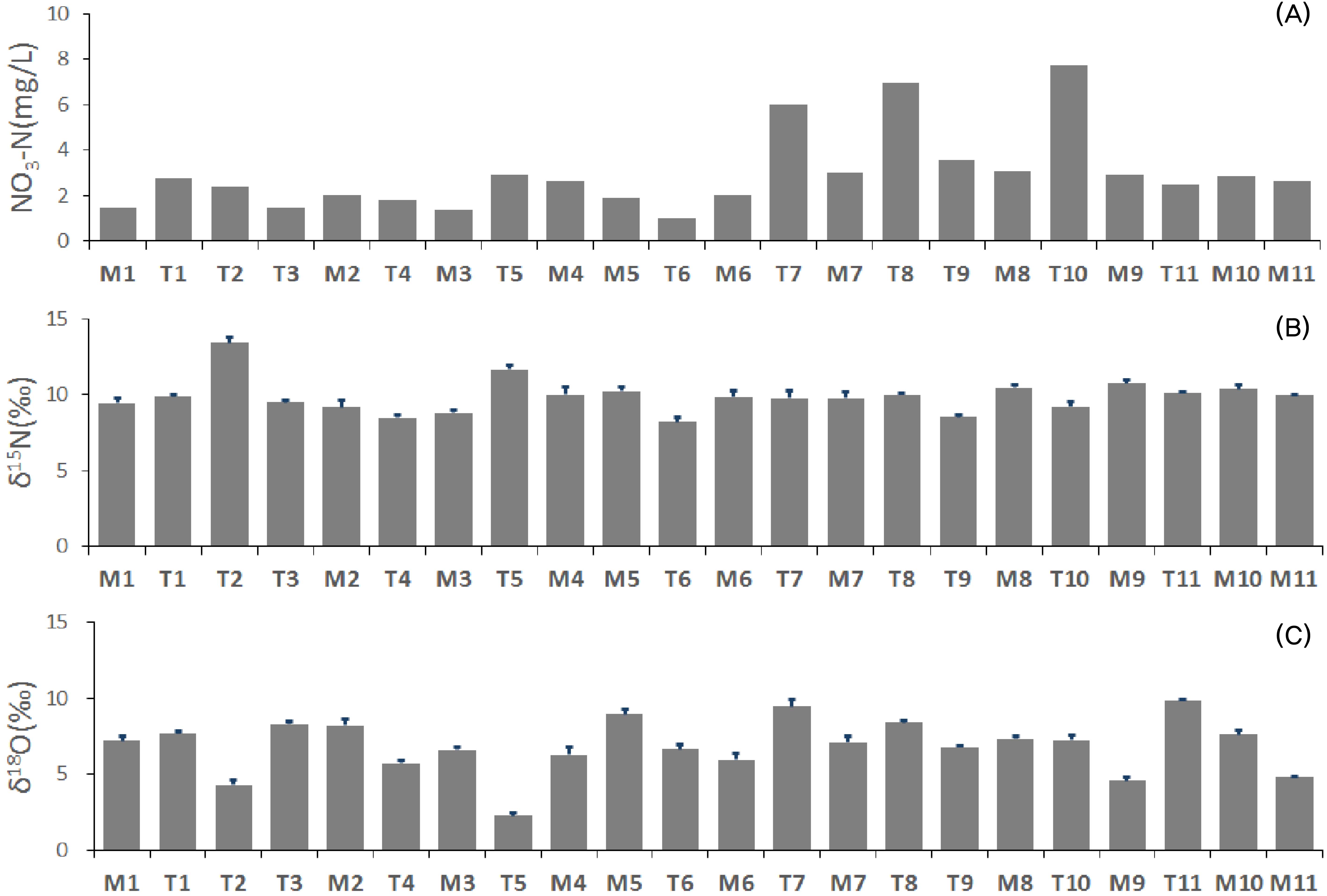 Fig. 2. Spatial variations of (A) NO3-N concentration and (B, C) nitrate isotopic signatures (mean ± S.D.) in the Yeongsan River.