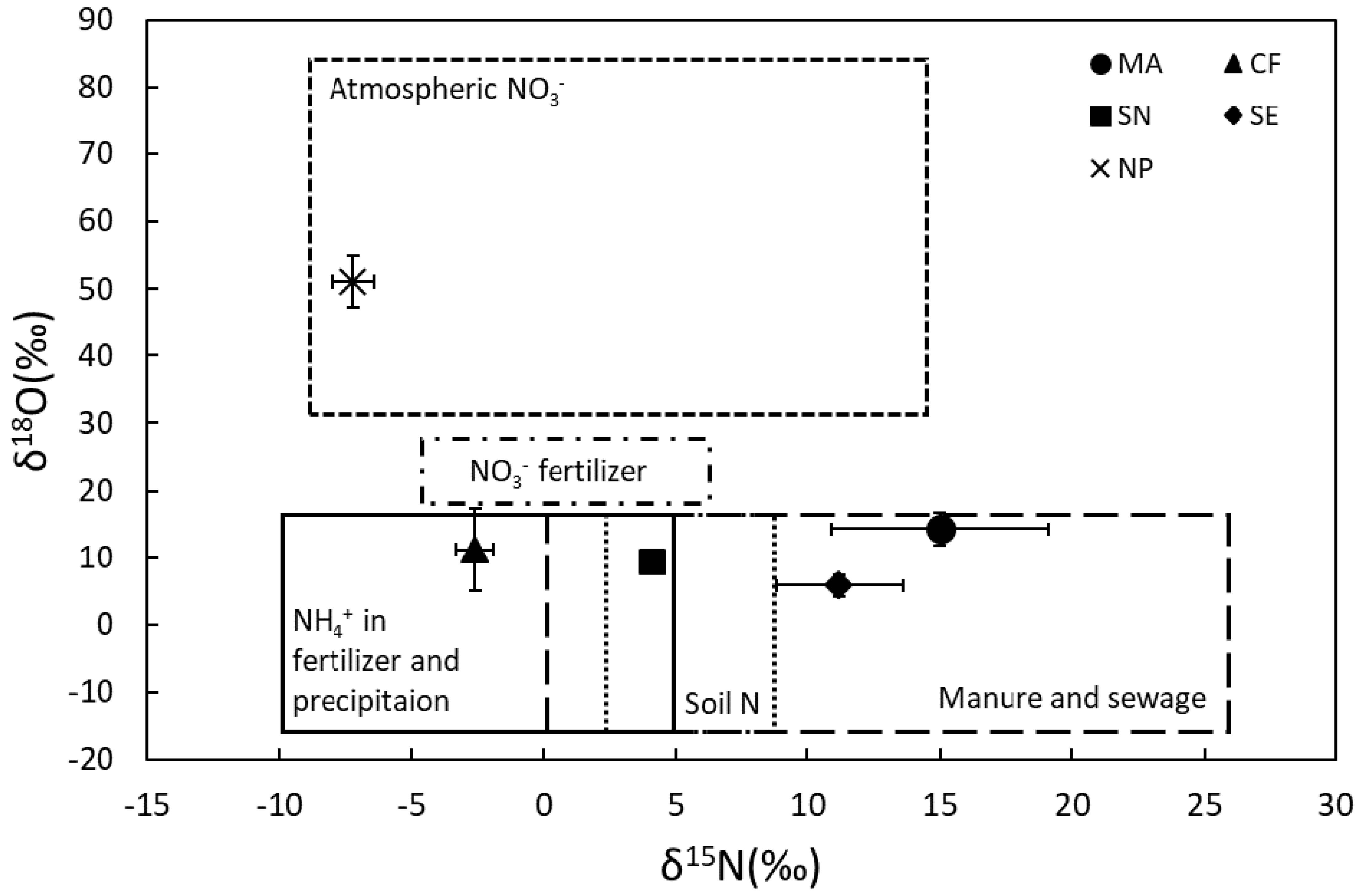 (B) Nitrate isotopic signatures and its standard deviation of end-member (saved at “Sheet2” in Excel file and read in R). MA: manure, CF: chemical fertilizer, SN: soil N, SE: sewage, NP: precipitation