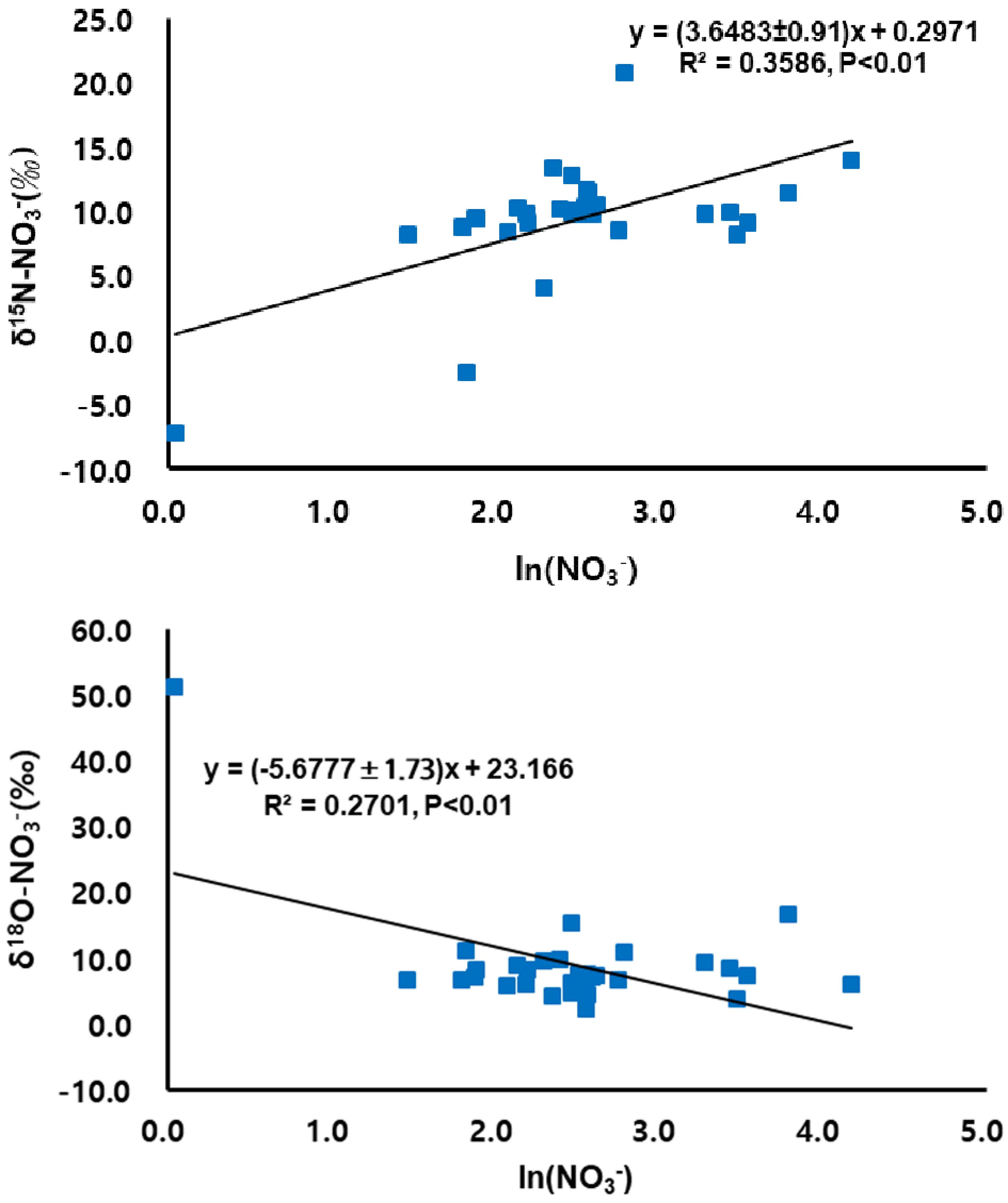 Fig. 5. Relationship between ln(NO3-) ratios and nitrate isotopic signatures in the Yeongsan River.