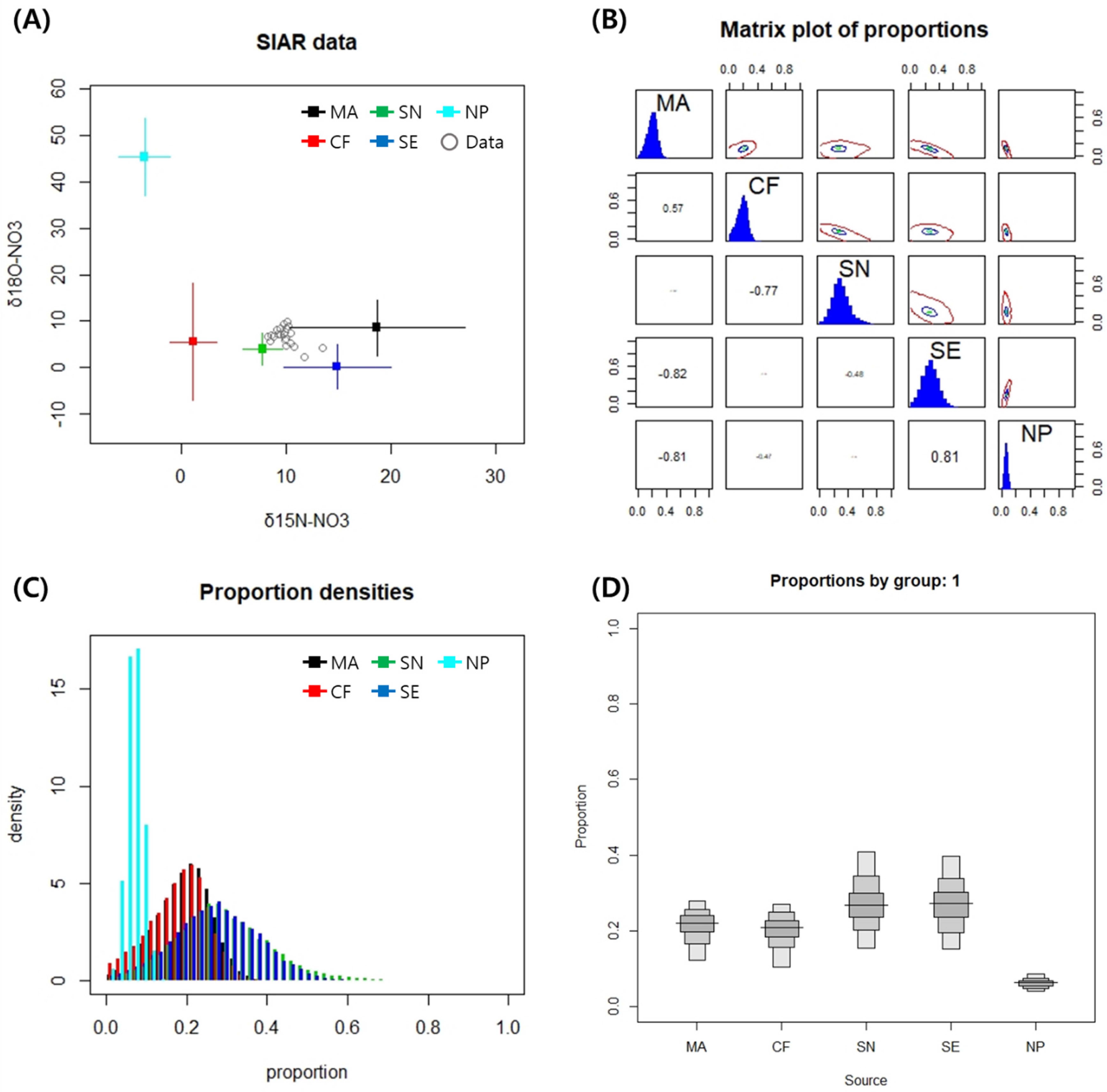 Fig. 6. Four Graphs plotted in the Yeongsan River datasets using SIAR package of R software; (A) range of δ15N and δ18O values from mixture (open circle) and end-member (filled square) samples, (B) matrix plot of proportion from end-member, (C) posterior density estimation of proportions, (D) proportional contribution of five end-member, boxplots illustrate the 25th, 50th and 75th percentiles. The bar indicates the mode percentile; MA: manure, CF: chemical fertilizer, SN: soil N, SE: sewage, NP: precipitation.