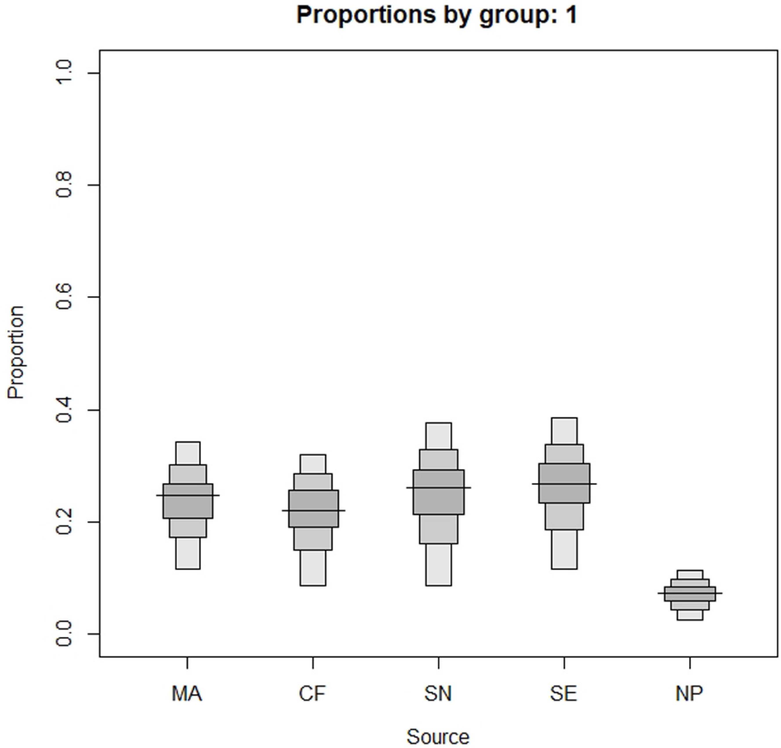 Plotting boxplot of proportions by group siarproportionbygroupplot (model1, prn = TRUE, probs= c(0.1,25,50,75) ) Figure 6(D)