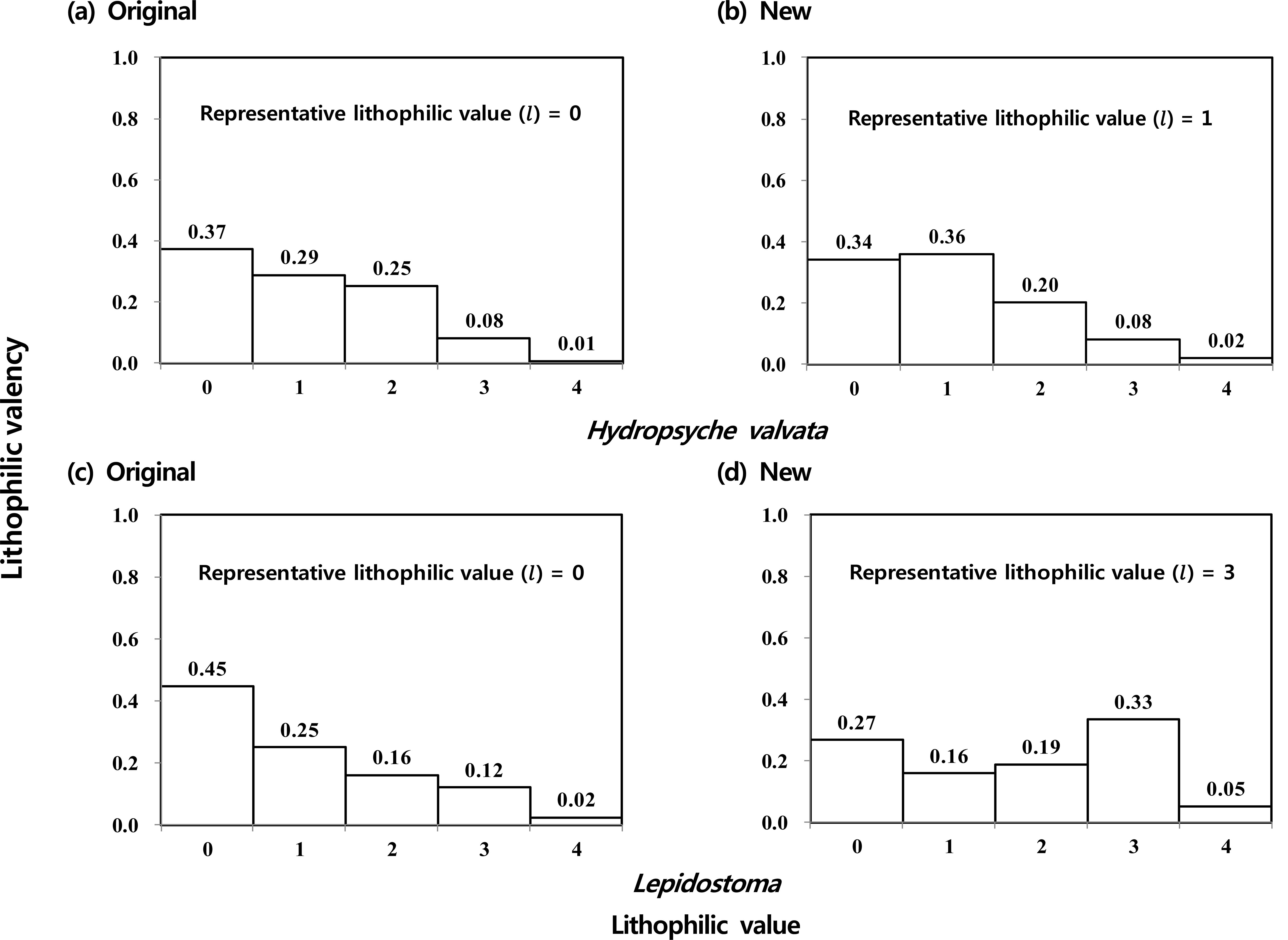 새롭게 산정된 각 지표 분류군의 하상계급치는 총 191개 지표 분류군 모두 기존의 것과 차이를 보였다. 이에 따라 분 석에 이용된 총 191개 지표 분류군 중 126개 분류군에서 각 분류군의 대표하상지수(Representative integer of lithophilic value: l)가 새롭게 산정되었다(Appendix 1).
