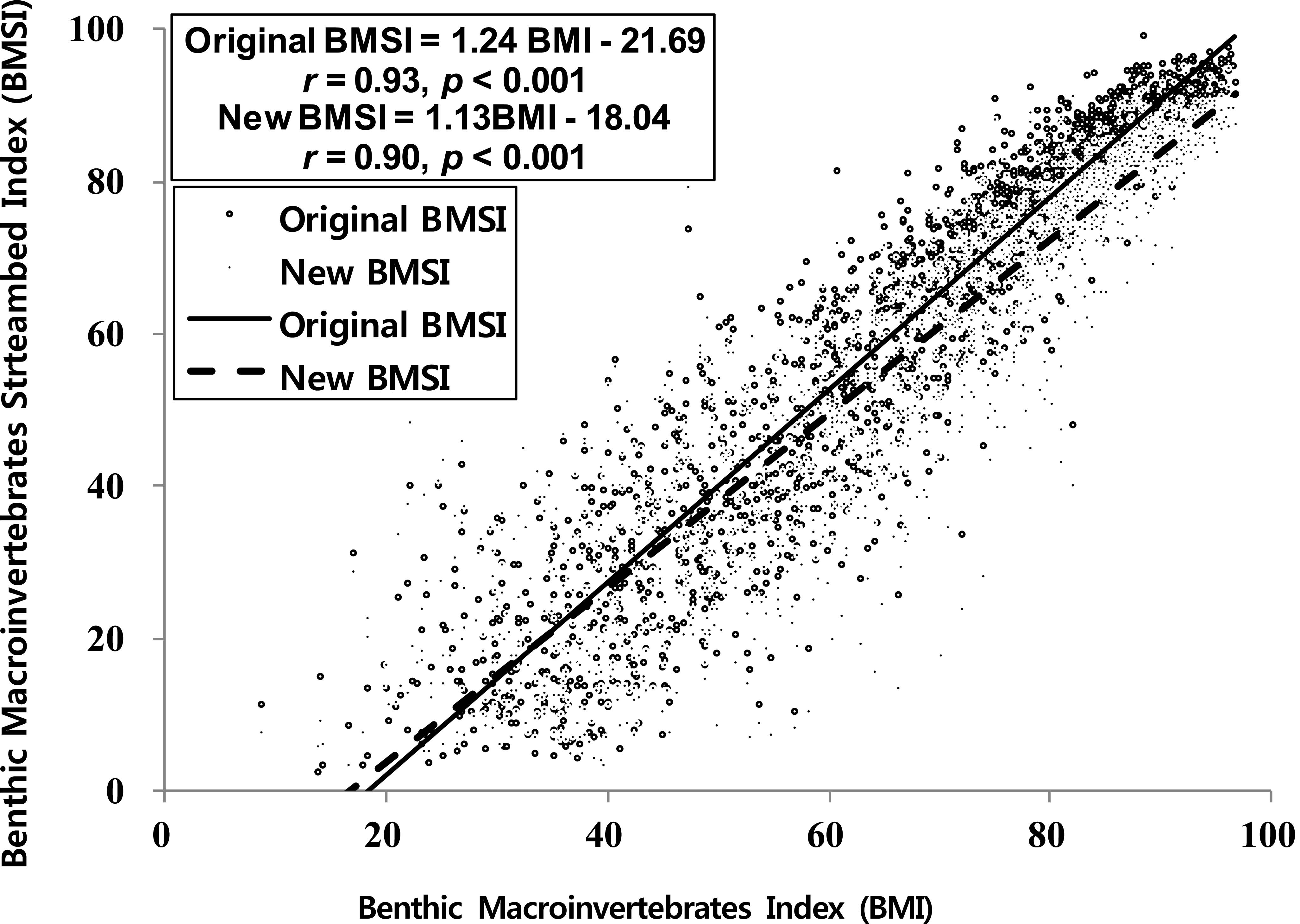 수질을 고려하여 재선정한 전체 지점의 저서동물지수 (BMI)와 기존 BMSI, 새로이 구성된 BMSI를 비교한 결과 두 가지 BMSI 모두 BMI와 높은 상관성을 보였으며 고도의 유의성(p<0.001)을 보였다(Fig. 2). BMSI와 BMI 상관계수 (r)는 기존의 것이 약 0.93, 새로이 구성된 것이 약 0.90의 값을 보였다(Fig. 2). 기존의 비해 새로이 구성된 BMSI의 상 관도가 더 낮았다. 기존의 BMSI 값과 새로이 구성된 BMSI 값은 BMI 값이 약 33.18을 기준으로 양극단으로 갈수록 차 이가 상대적으로 큰 경향을 보였다.