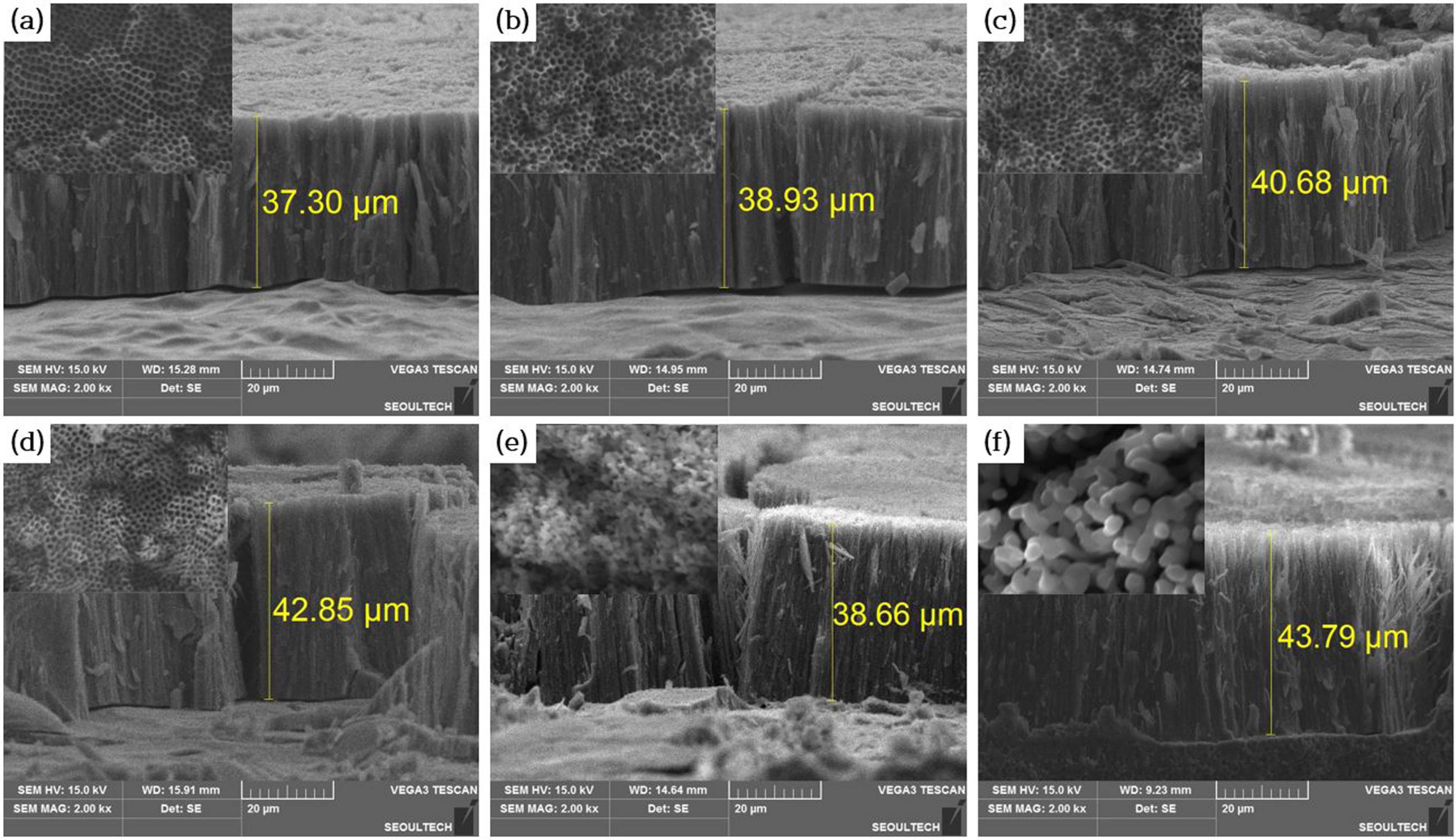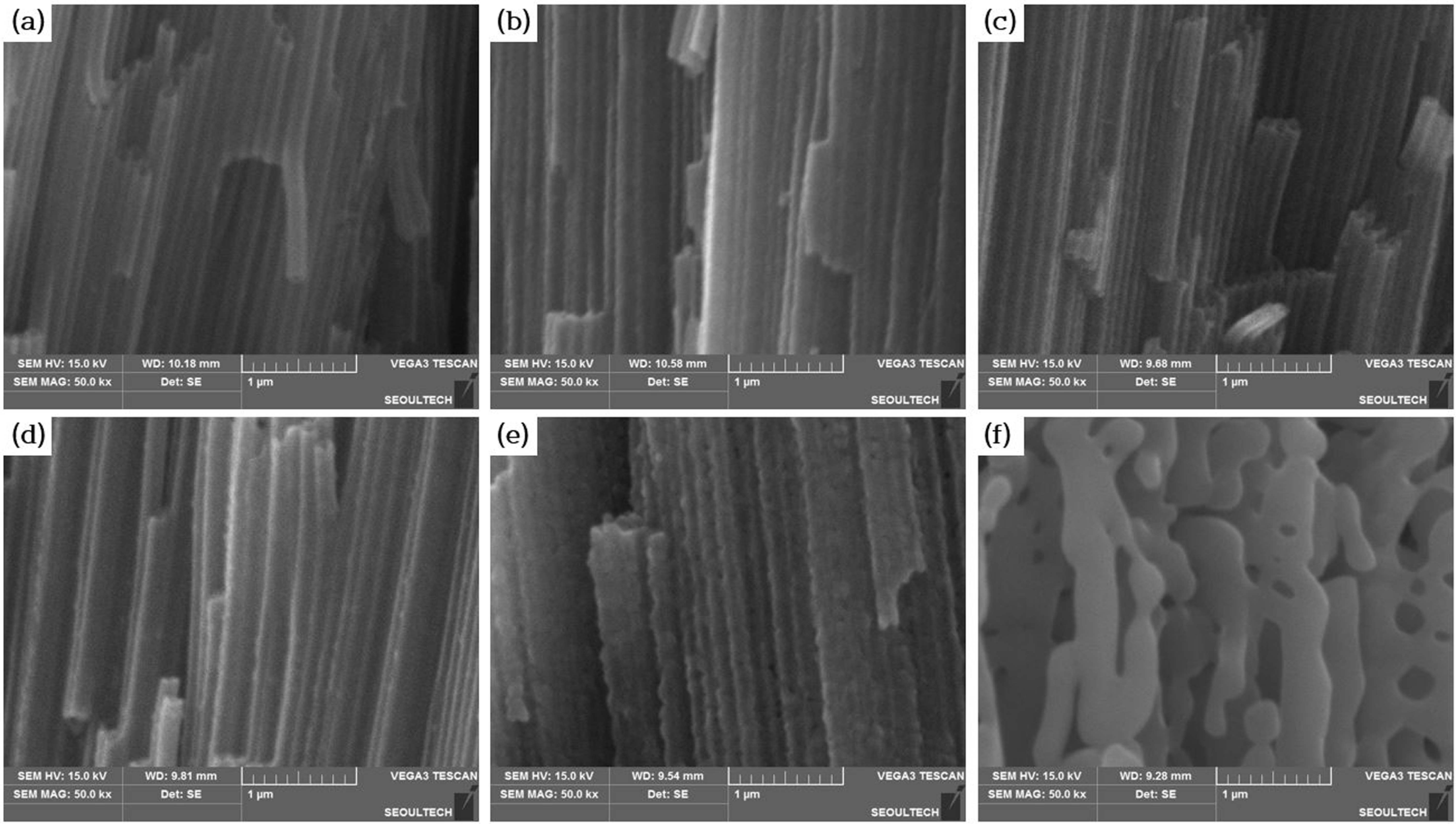 Fig. 2. Cross-section of TiO2nanotube plate annealed at different temperatures : (a) 400 °C (100 % anatase), (b) 500 °C (100 % anatase), (c) 600 °C (100 % anatase), (d) 700 °C (18.4% rutile) (e) 800 °C (36.6% rutile), and (f) 900 °C (98.6% rutile).