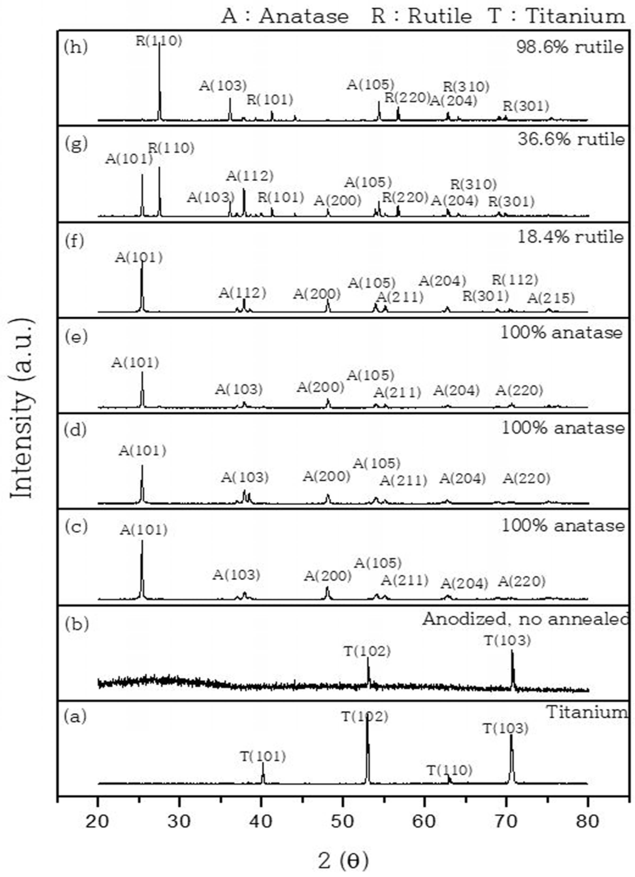 Fig. 3. XRD of (a) Titanium plate, (b) no annealed TiO2, (c) TiO2annealed at 400 °C (100 % anatase), (d) TiO2annealed at 500 °C (100 % anatase), (e) TiO2annealed at 600 °C (100 % anatase), (f) TiO2annealed at 700 °C (18.4% rutile), (g) TiO2annealed at 800 °C (36.6% rutile), (h) TiO2annealed at 900 °C (98.6% rutile).