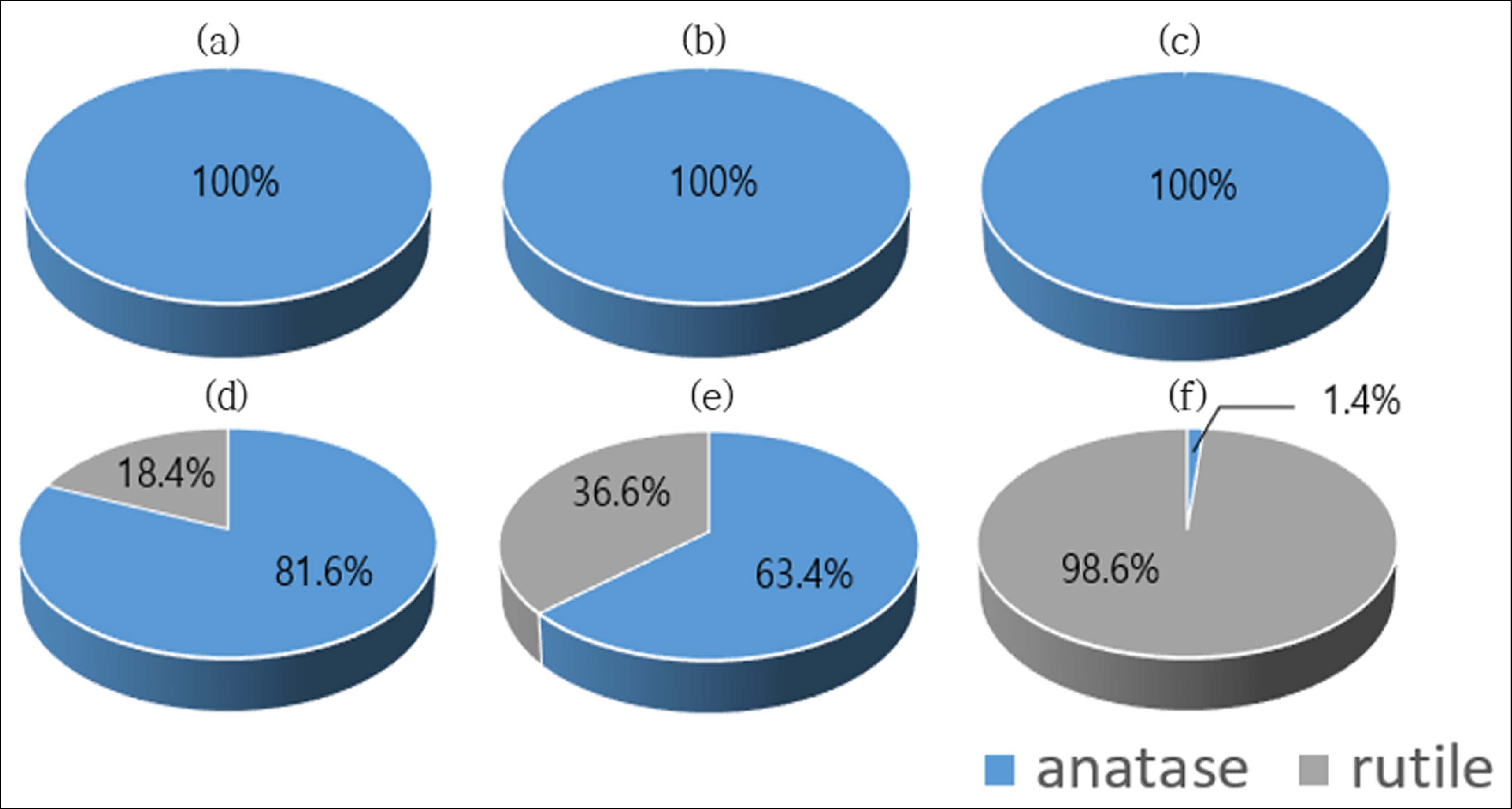 Fig. 4. Anatase and rutile ratio of TiO2nanotube annealed at (a) 400 °C (100 % anatase), (b) 500 °C (100 % anatase), (c) 600 °C (100 % anatase), (d) 700 °C (18.4% rutile) (e) 800 °C (36.6% rutile), (f) 900 °C (98.6% rutile).
