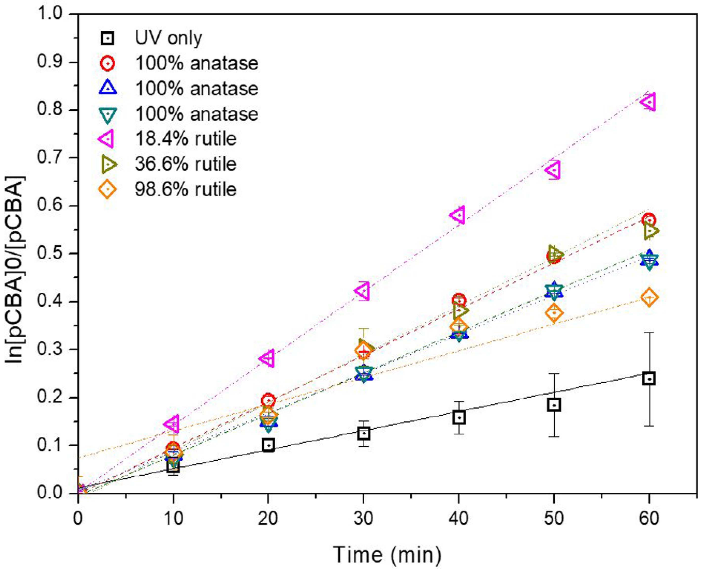 Fig. 6. Linear relationship between ln([pCBA]0/[pCBA]) and reaction time: (only UV □, 100% anatase-TiO2(annealed at 400 °C ○, 500 °C △, 600°C ▽), 18.4% rutile-TiO2(annealed at 700 °C ◁), 36.6% rutile-TiO2(annealed at 800 °C ▷), and 98.6% rutile-TiO2(annealed at 900 °C ◇))