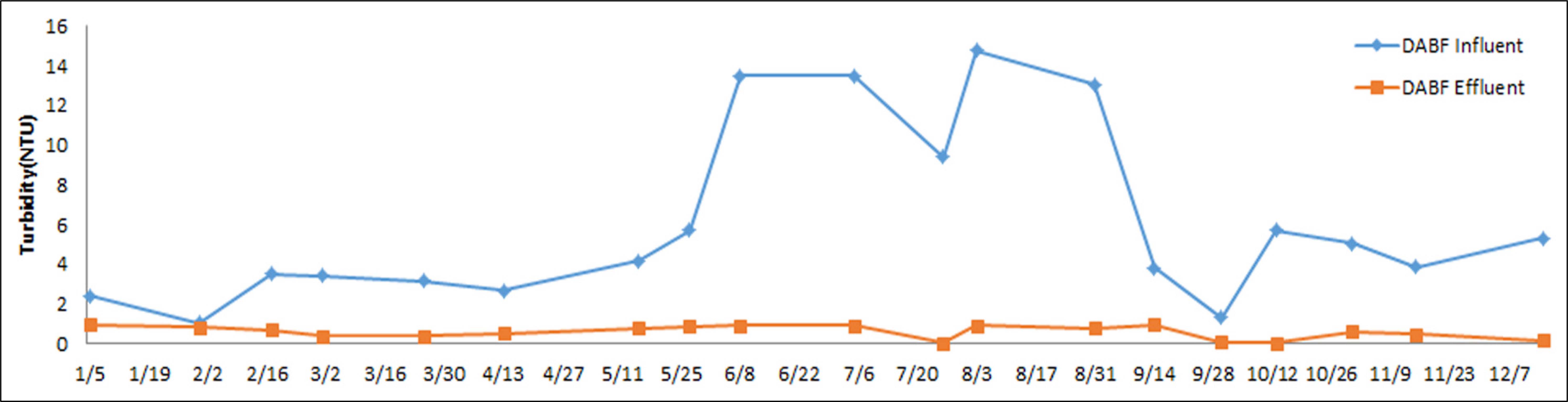ํ•ด์ˆ˜๋Š” ๊ณ„์ ˆ์— ๋”ฐ๋ผ ์ˆ˜์˜จ, ์—ผ๋„, TDS, pH ๋“ฑ์ด ๋ณ€๋™ํ•˜๋ฉฐ, TDS๋Š” ์•ฝ 35,000 ~ 37,283 mg/L๊นŒ์ง€์˜ pH๋Š” 7.9 ~ 8.3๊นŒ์ง€ ์˜ ์ˆ˜์งˆ์„ ๋‚˜ํƒ€๋‚ด๊ณ  ์žˆ๋‹ค(Table 3). ํƒ๋„๋Š” ์กฐ๋ฅ˜์™€ ๊ธฐ์ƒ ์ƒํ™ฉ ์— ๋”ฐ๋ผ ์ˆ˜์งˆ์ด ๋ณ€๋™ํ•˜๋ฉฐ, ์ตœ์†Œ 1.2 NTU๋ถ€ํ„ฐ ์ตœ๊ณ  15.2 NTU๊นŒ์ง€ ๋‚˜ํƒ€๋‚ฌ๋‹ค(Fig. 3). ์œ ์ž… ์ˆ˜์งˆ ๋ณ€ํ™”์— ๋”ฐ๋ผ ์ €ํƒ๋„์ผ ๋•Œ์™€ ๊ณ ํƒ๋„์ผ ๋•Œ๋ฅผ ๊ตฌ๋ถ„ํ•˜์—ฌ ๋ฐ˜์†กํŽŒํ”„์˜ ๊ฐ€๋™์—ฌ๋ถ€๋ฅผ ๊ฒฐ์ • ํ•˜์—ฌ ๋ฏธ์„ธ๊ธฐํฌ๋ฅผ ์ฃผ์ž…ํ•˜์—ฌ ์šด์ „ํ•˜์˜€๊ณ  ์œ ์ถœ์ˆ˜์˜ ํƒ๋„๋Š” ์ผ ์ •ํ•˜๊ฒŒ <1 NTU๋ฅผ ์œ ์ง€ํ•˜์˜€๋‹ค. ๋ถ€์‚ฐ ๊ธฐ์žฅ์ง€์—ญ์€ ์ตœ๊ทผ 10๋…„ ๋™์•ˆ ๊ฑฐ์˜ ๋งค๋…„ ์ ์กฐ๊ฐ€ ๋ฐœ์ƒํ•˜๋Š” ์ง€์—ญ์œผ๋กœ ๊ณต๊ธฐ๋ถ€์ƒ๊ณต์ •์ด ํ•„์š”ํ•œ ์ง€์—ญ์ด๋‹ค. >10 NTU์˜ ๊ณ ํƒ๋„๋กœ ์œ ์ž…๋˜๋Š” ๋นˆ๋„๋Š” 1 ๋…„์— 40ํšŒ ๋ฏธ๋งŒ์œผ๋กœ ์œ ์ž…๋˜๊ธฐ ๋•Œ๋ฌธ์— DABF์˜ ์„ค๋น„๋ฅผ ์ „์ฒด ์ ์œผ๋กœ ๊ฐ€๋™ํ•œ ๊ธฐ๊ฐ„์€ 10% ๋ฏธ๋งŒ์ด๋‹ค.