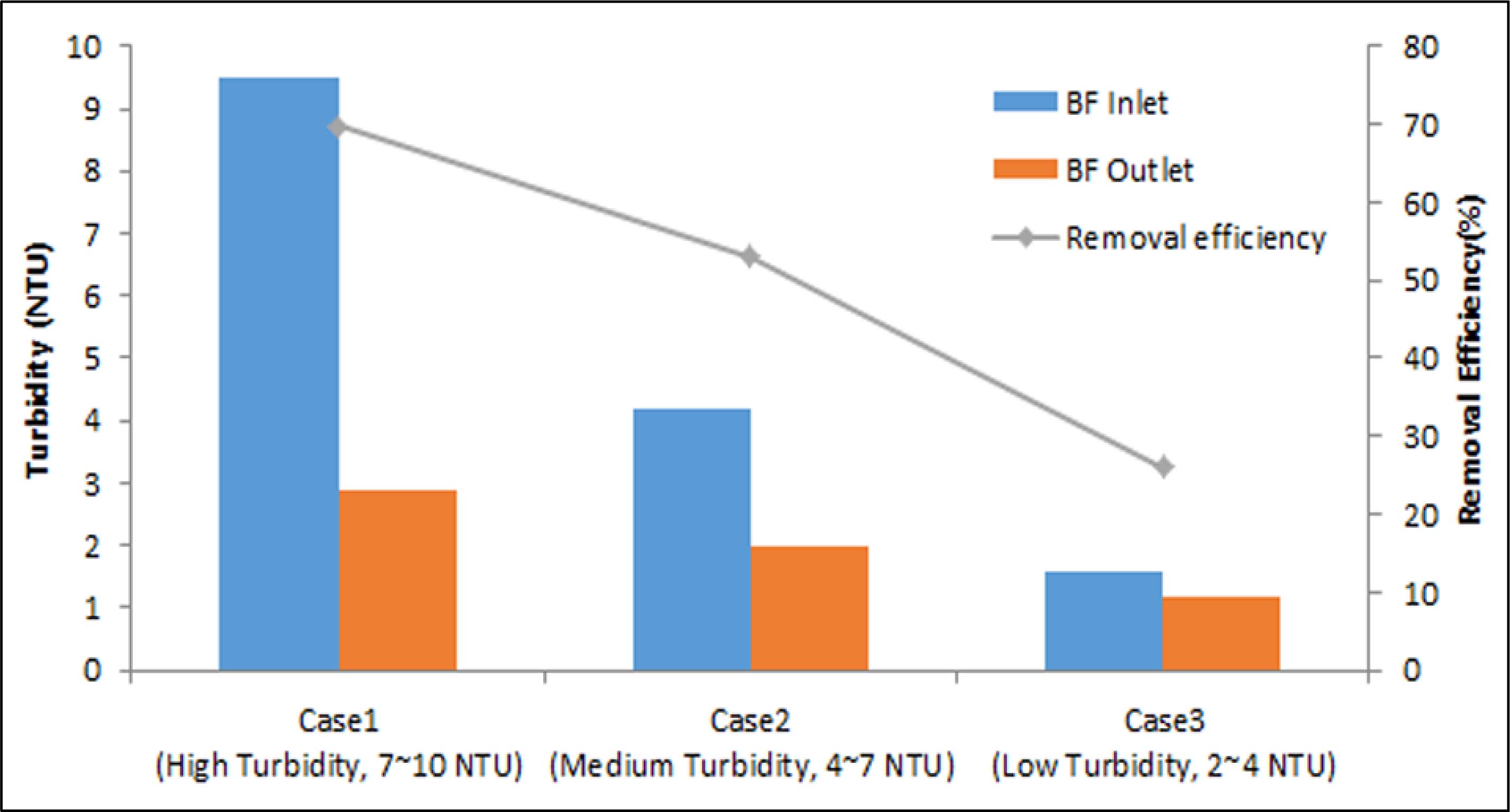 BF ์ „๋‹จ์˜ ํƒ๋„๊ฐ€ 1 ~ 10 NTU์—์„œ๋Š” BF๋ฅผ ์—ฌ๊ณผํ•œ ํ›„์˜ ํƒ๋„๋Š” 3 NTU ์ดํ•˜๋กœ ์œ ์ง€๋œ๋‹ค(Fig. 4). BF ์ „๋‹จ์˜ ํƒ๋„๊ฐ€ ๋†’์•„์ง์— ๋”ฐ๋ผ ํƒ๋„ ์ฒ˜๋ฆฌํšจ์œจ์€ ๋†’์•„์ง„๋‹ค. ๊ณ ํƒ๋„์˜ ๊ฒฝ์šฐ์— ๋Š” ์ž…์ž์„ฑ ๋ฌผ์งˆ์˜ ์–‘์ด ์ฆ๊ฐ€ํ•˜์—ฌ BF์™€ ์ ‘์ด‰ํ•  ๊ธฐํšŒ๊ฐ€ ๋งŽ์•„ ์ ธ์„œ ์ฒ˜๋ฆฌํšจ์œจ์ด ๋†’์•„์กŒ๋‹ค๊ณ  ํŒ๋‹จ๋œ๋‹ค. ์ €ํƒ๋„์—์„œ๋Š” BF๊ฐ€ ๋ถ€์ฐฉํ•  ์ˆ˜ ์žˆ๋Š” ์ž…์ž์„ฑ ๋ฌผ์งˆ์˜ ํฌ๊ธฐ์˜ ํ•œ๊ณ„๊ฐ€ ์žˆ์œผ๋ฏ€๋กœ ์ ์ฐจ ํšจ์œจ์ด ๋‚ฎ์•„์ง„๋‹ค๊ณ  ํ•  ์ˆ˜ ์žˆ๋‹ค. ๊ณต์ • ์ธก๋ฉด์—์„œ BF ์ „๋‹จ์˜ ํƒ ๋„ 1 ~ 10 NTU์ผ ๋•Œ๋Š” BF๋ฅผ ๋‹จ๋…์œผ๋กœ ์‚ฌ์šฉํ•˜์—ฌ๋„ <3 NTU ๋กœ ๊ณต๊ธ‰ํ•  ์ˆ˜ ์žˆ์œผ๋ฏ€๋กœ ํ›„์†๊ณต์ •์˜ ๋ถ€ํ•˜๋ฅผ ๊ฒฝ๊ฐ์‹œํ‚ฌ ์ˆ˜ ์žˆ๋Š” ์•ˆ์ •์ ์ธ ์šด์ „์ด ๊ฐ€๋Šฅํ•˜๋‹ค๊ณ  ํ•  ์ˆ˜ ์žˆ๋‹ค. BF ๋‹จ๋…์œผ๋กœ ์šด์ „ ํ•˜๋ฉด ๋ฐ˜์†กํŽŒํ”„์™€ ์ปดํ”„๋ ˆ์…” ๋“ฑ์„ ์‚ฌ์šฉํ•˜์ง€ ์•Š์•„ ๋™๋ ฅ๋น„๋Š” ์ ˆ ๊ฐ๋œ๋‹ค. ํ•˜์ง€๋งŒ ๊ณ ํƒ๋„ ํ˜น์€ ์กฐ๋ฅ˜๊ฐ€ ์œ ์ž…๋  ๊ฒฝ์šฐ ํ›„์†๊ณต์ •์˜ ์ œ๊ฑฐํšจ์œจ์ด ๋‚ฎ์œผ๋ฏ€๋กœ ๋ฐ˜์†กํŽŒํ”„์™€ ์ปดํ”„๋ ˆ์…” ๋“ฑ์˜ ์„ค๋น„ ์šด์ „ ์ด ํ•„์š”ํ•˜๋‹ค.