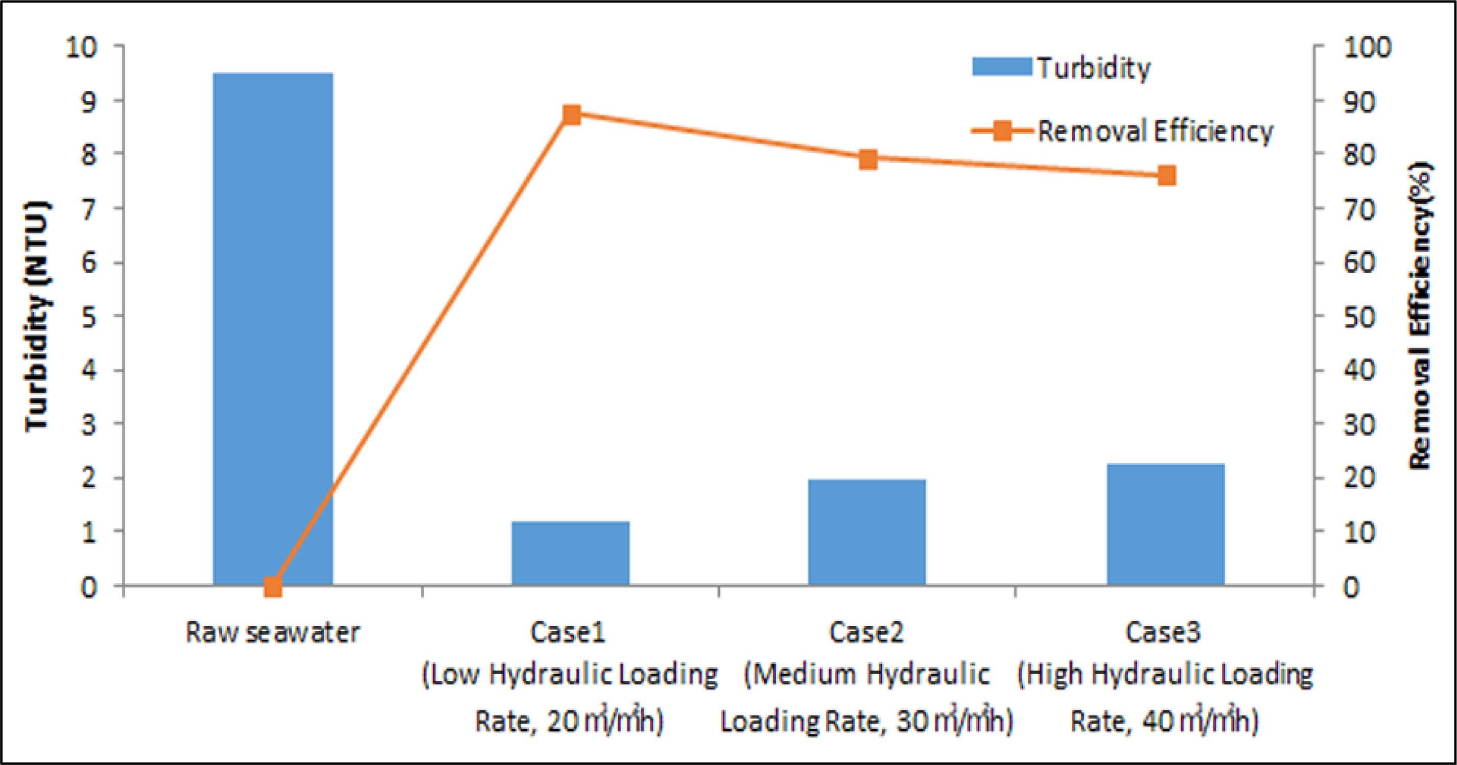 ์ˆ˜๋ฆฌํ•™์  ๋ถ€ํ•˜์œจ์ด BF๋กœ ์œ ์ž…๋˜๋Š” ์ˆ˜๋ฆฌํ•™์  ๋ถ€ํ•˜์œจ์ด ๋†’ ์•„์งˆ์ˆ˜๋ก BF์˜ ํƒ๋„ ์ œ๊ฑฐํšจ์œจ์€ ๊ฐ์†Œํ•˜์ง€๋งŒ, ์ˆ˜๋ฆฌํ•™์  ๋ถ€ํ•˜ ์œจ 40 m3/h/m2์—์„œ BF ์œ ์ถœ์ˆ˜์˜ ํƒ๋„๊ฐ€ 1 ~ 3 NTU ์ดํ•˜์˜ ์„ฑ๋Šฅ์„ ํ™•์ธํ•˜์˜€๋‹ค(Fig. 5). ์œ ๋Ÿ‰์ด ๋‚ฎ์œผ๋ฉด BF ์œ„์น˜ํ•˜๋Š” ๊ณต๊ฐ„ ์— ์ฒด๋ฅ˜ํ•˜๋Š” ์‹œ๊ฐ„์ด ๊ธธ๊ธฐ ๋•Œ๋ฌธ์— ํƒ๋„ ์ œ๊ฑฐํšจ์œจ์ด ๋†’์•„์ง€๊ณ  ์œ ๋Ÿ‰์ด ๋†’์•„์ง€๋ฉด ํƒ๋„ ์ œ๊ฑฐํšจ์œจ์ด ๊ฐ์†Œํ•˜์˜€๋‹ค.