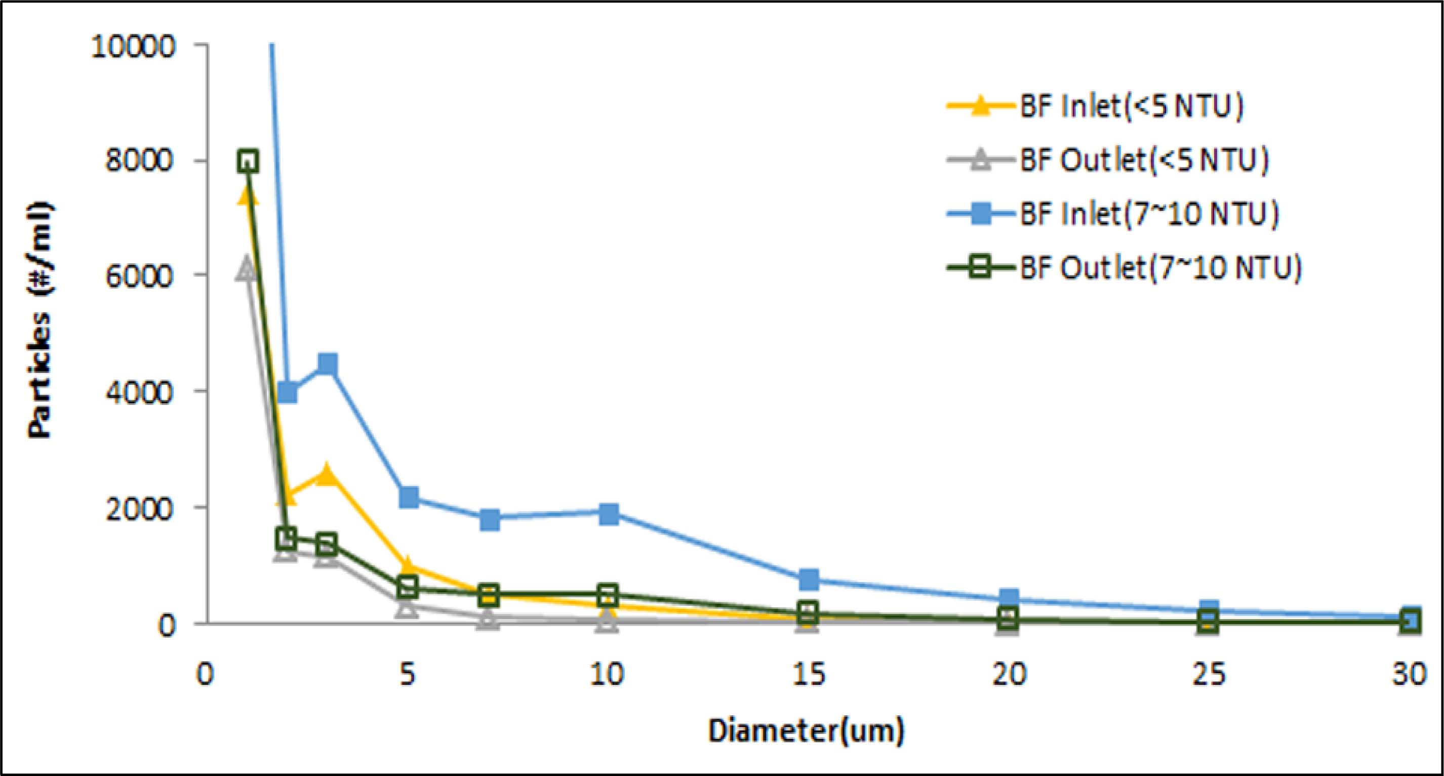 BF์˜ ์„ฑ๋Šฅ์€ ์ž…์ž์˜ ํฌ๊ธฐ์— ๋ฐ€์ ‘ํ•˜๊ฒŒ ๊ด€๋ จ์ด ์žˆ์„ ๊ฒƒ์œผ๋กœ ํŒ๋‹จํ•˜์—ฌ ์ €ํƒ๋„(<5 NTU)์™€ ๊ณ ํƒ๋„(7 ~ 10 NTU)์ผ ๋•Œ ๊ฐ๊ฐ ์˜ BF์ „๋‹จ๊ณผ BFํ›„๋‹จ์˜ ์ž…์ž ํฌ๊ธฐ๋ถ„ํฌ์™€ ์ˆ˜๋ฅผ ํ™•์ธํ•˜์˜€๋‹ค (Fig. 6). ์ €ํƒ๋„์—์„œ BF ์ „๋‹จ์˜ ์ž…์ž ํฌ๊ธฐ๋ถ„ํฌ๋Š” ์ฃผ๋กœ 5 ฮผm ์ดํ•˜๋กœ ๋ถ„ํฌํ•˜๊ณ  ์žˆ๋‹ค. BF๋ฅผ ํ†ต๊ณผํ•˜๋ฉด ์ž…์ž์˜ ํฌ๊ธฐ์™€ ์ƒ๊ด€ ์—†์ด ์ž…์ž์ˆ˜๋Š” ์ „์ฒด์ ์œผ๋กœ ๊ฐ์†Œํ•˜์˜€๊ณ  5 ฮผm ์ด์ƒ์˜ ์ž…์ž์ˆ˜ ๋Š” 100ยฑ50 ๊ฐœ/ml ๋ฏธ๋งŒ์œผ๋กœ ๋‚˜ํƒ€๋‚ฌ๋‹ค. ๊ณ ํƒ๋„์—์„œ BF ์ „๋‹จ์˜ ์ž…์žํฌ๊ธฐ ๋ถ„ํฌ๋Š” ์ €ํƒ๋„์ผ ๋•Œ๋ณด๋‹ค ์ „๋ฐ˜์ ์œผ๋กœ ์ƒ์Šนํ•˜์˜€์œผ๋ฉฐ, 5 ~ 15 ฮผm ์ด์ƒ์˜ ํฐ ์ž…์ž๋“ค์ด ๋ถ„ํฌํ•˜์˜€๋‹ค. ๊ณ ํƒ๋„์—์„œ BF ๋ฅผ ํ†ต๊ณผํ•˜๋ฉด ์ €ํƒ๋„์ผ ๋•Œ์™€ ๋งˆ์ฐฌ๊ฐ€์ง€๋กœ ์ž…์ž์ˆ˜๋Š” ์ „์ฒด์ ์œผ ๋กœ ๊ฐ์†Œํ•˜์˜€๊ณ  ์ €ํƒ๋„์ผ ๋•Œ์™€ ๋‹ฌ๋ฆฌ ์ž…์ž๋ฅผ ์ œ๊ฑฐํ•˜๋Š” ํญ์˜ ์ฐจ ์ด๊ฐ€ ๋†’๊ฒŒ ๋‚˜ํƒ€๋‚ฌ๋‹ค.